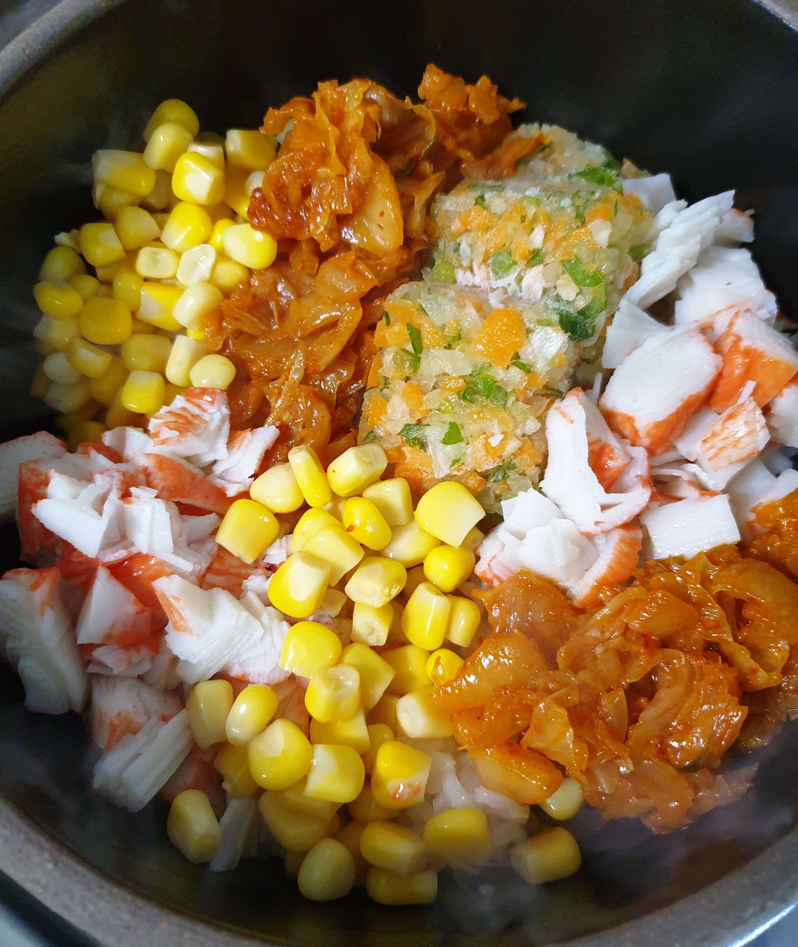 재료- 김치, 참기름, 밥, 크래미, 계란, 날치알
