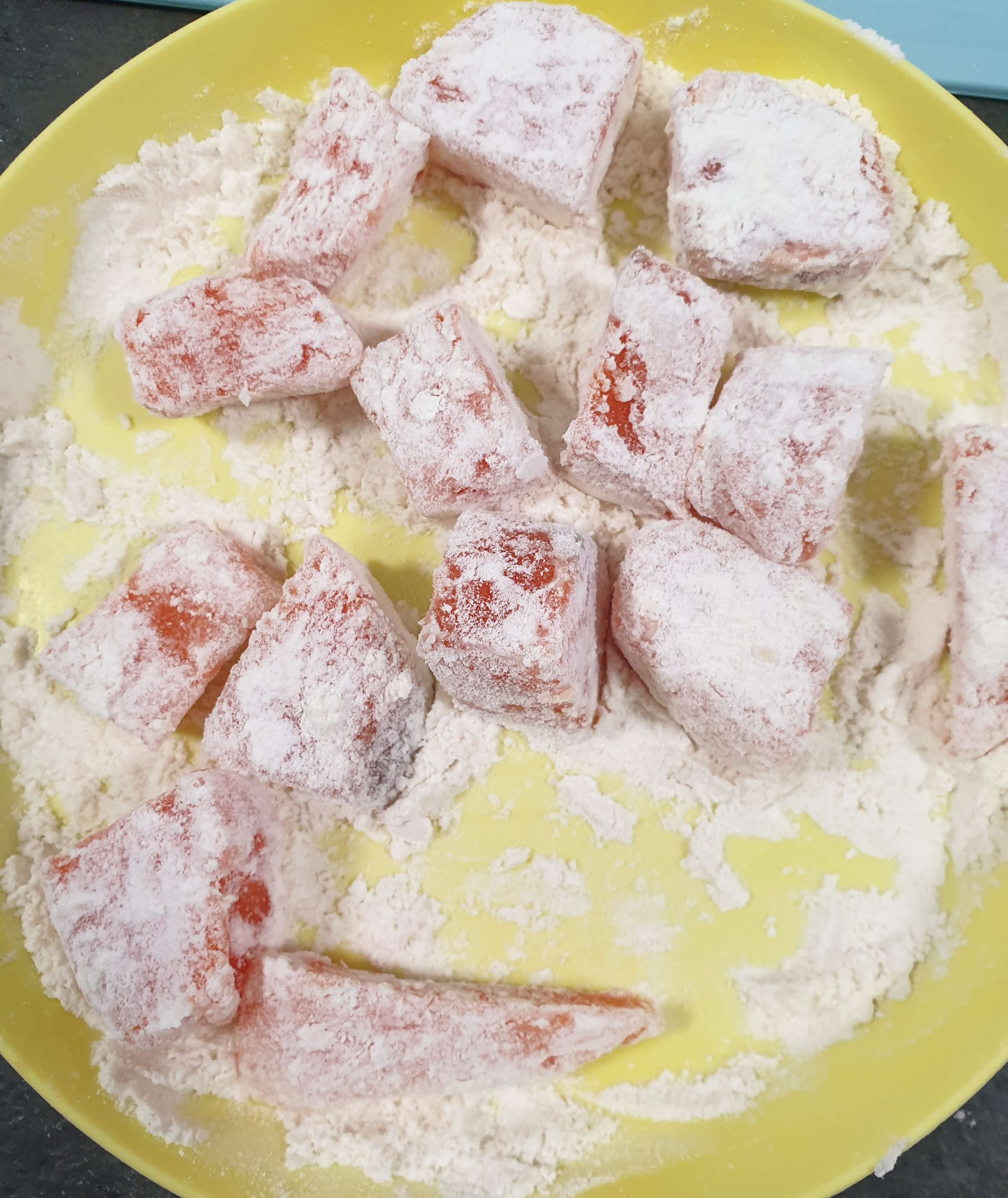 밀가루 옷을 입혀 줬어요.