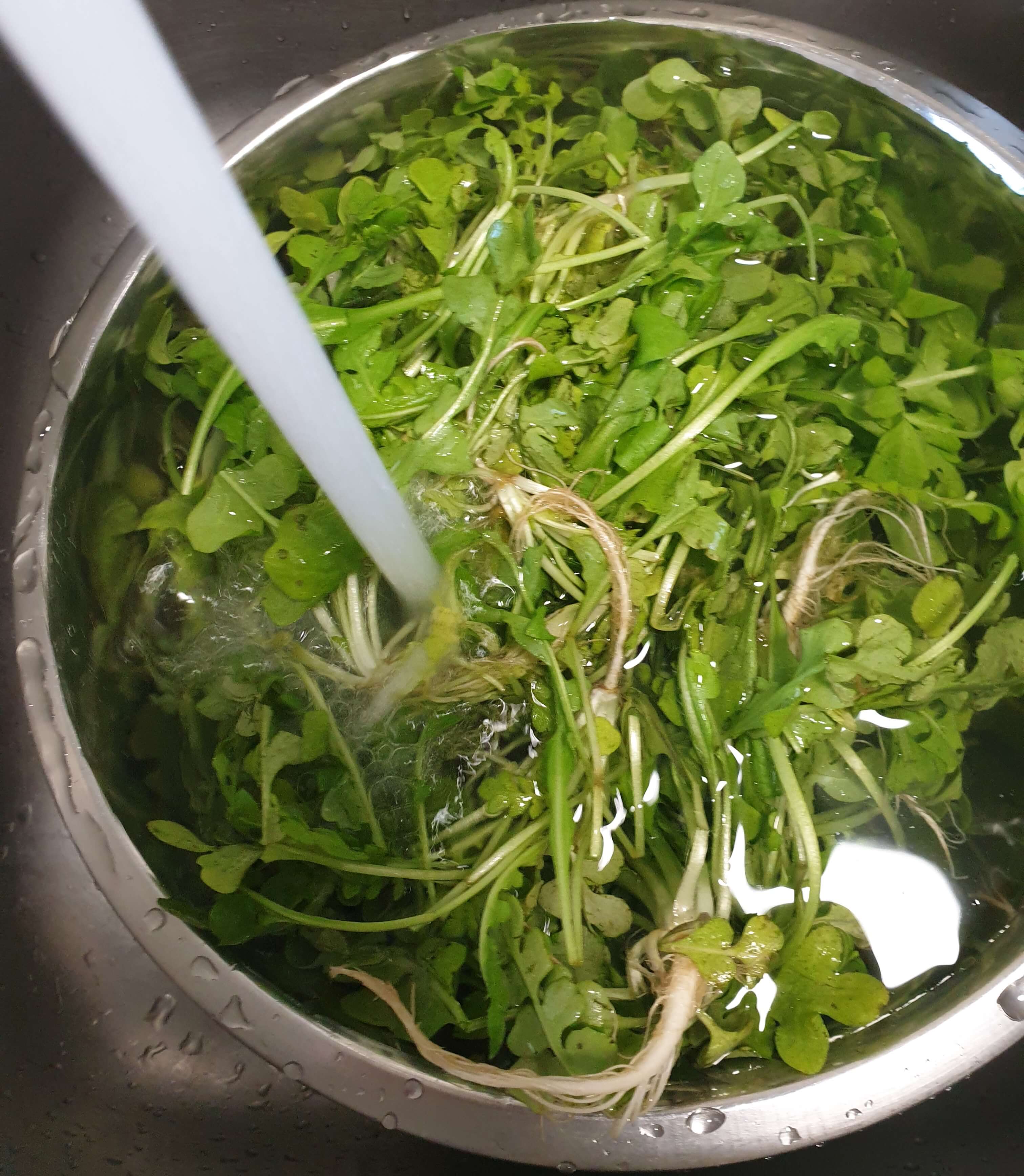 냉이에 붙은 누런 잎들을 떼어내주세요.