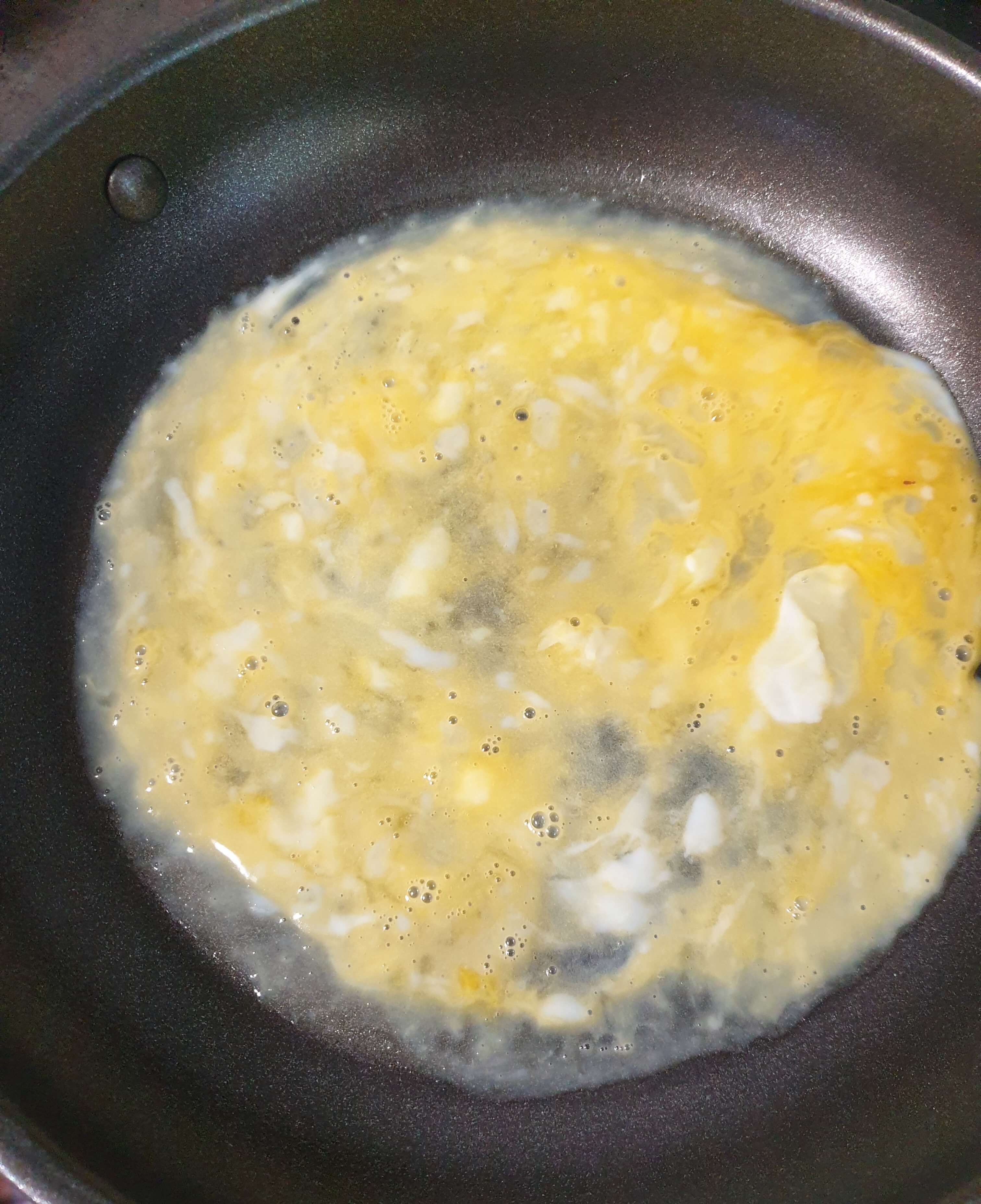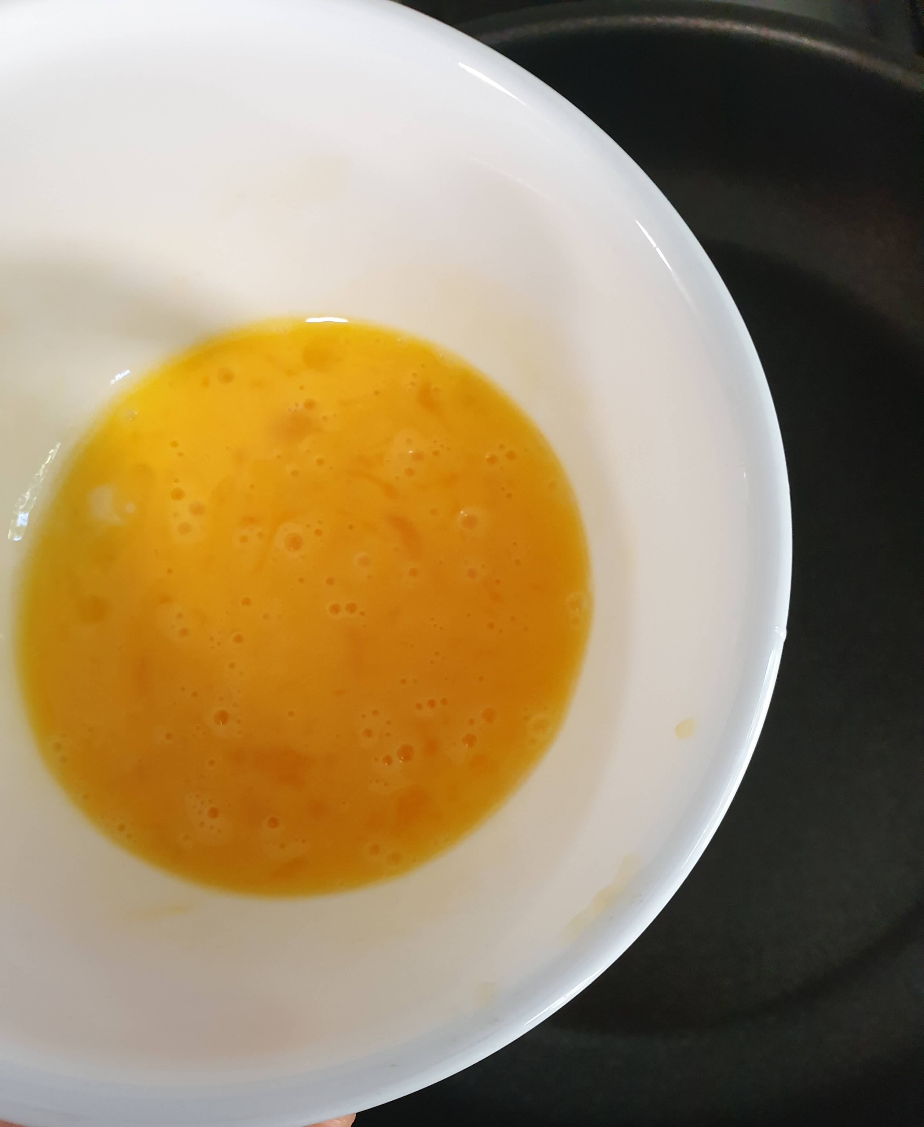 잘 풀어놓은 계란 1개를 둘러 익혀 줍니다.