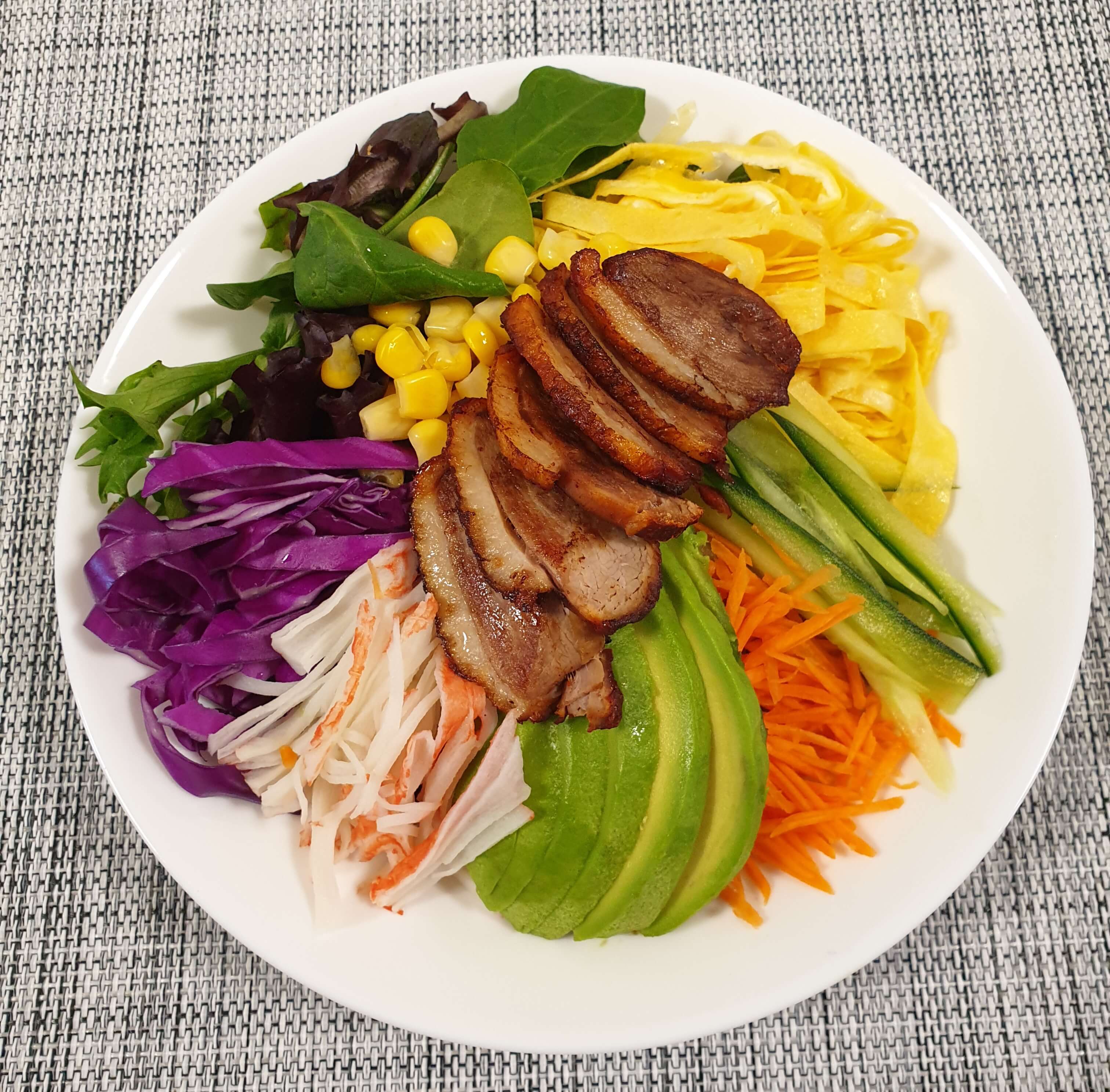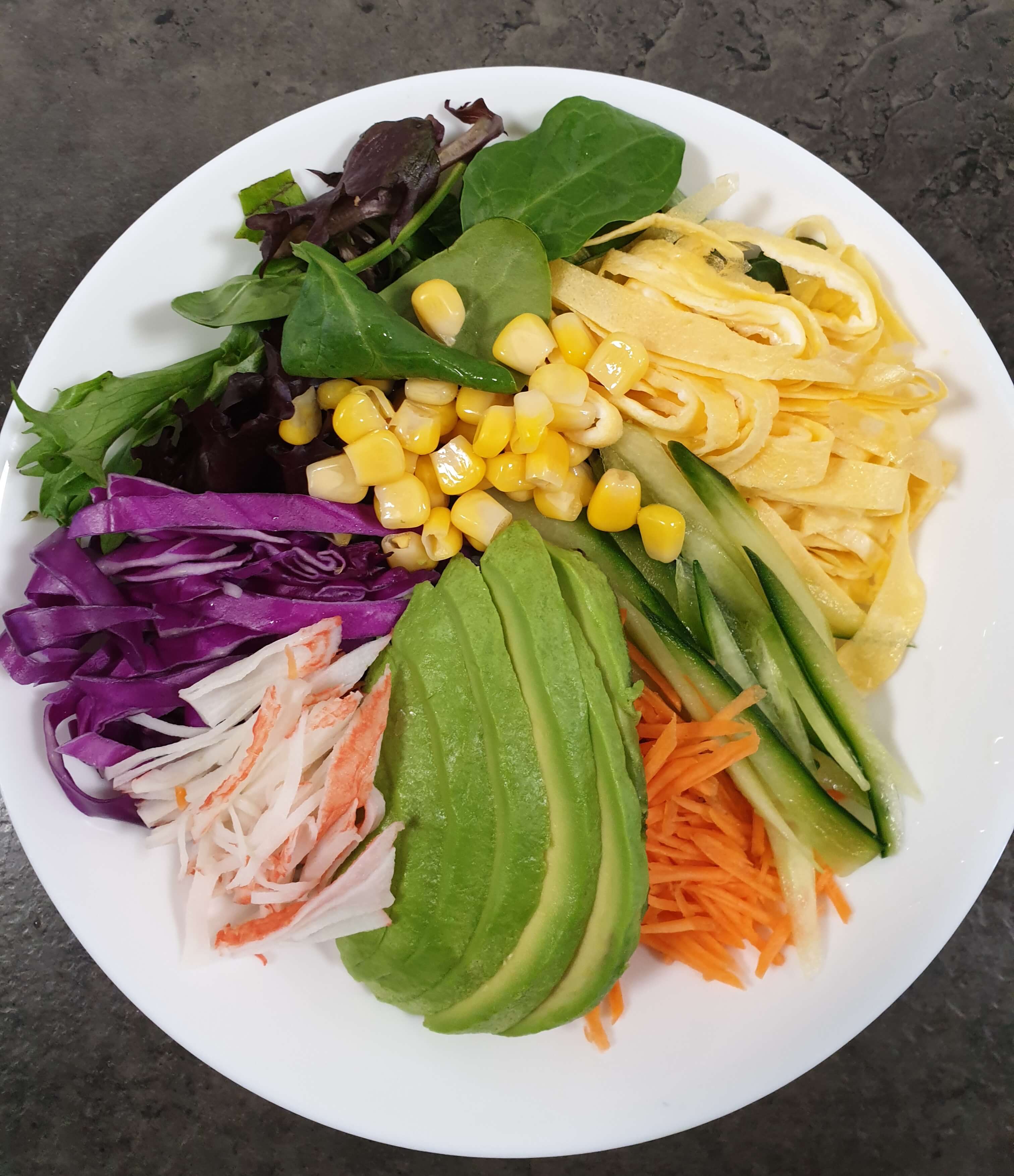 샐러드 야채, 통조림 옥수수, 오이, 당근, 맛살