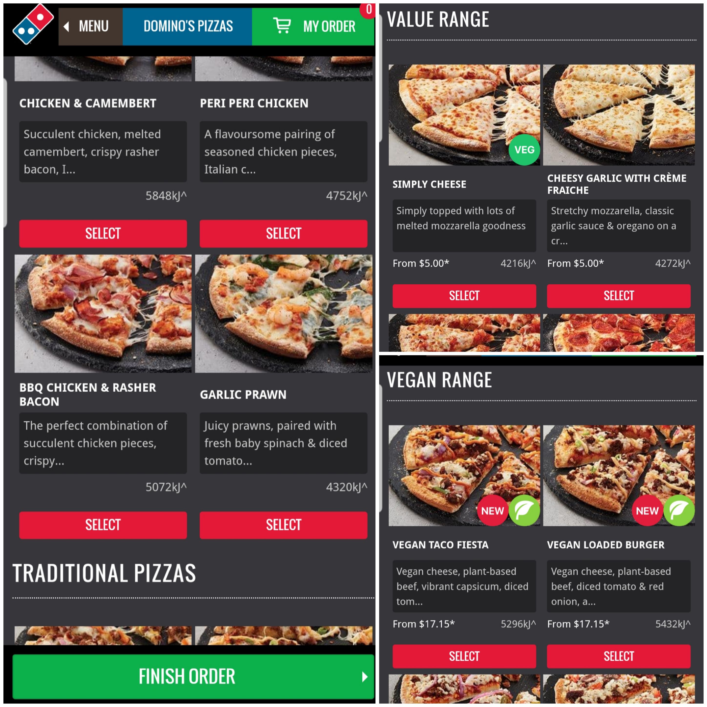 트레디셔널, 밸류, 비건 등등등 약 50가지 피자 중에 원하는 피자를 골라줍니다