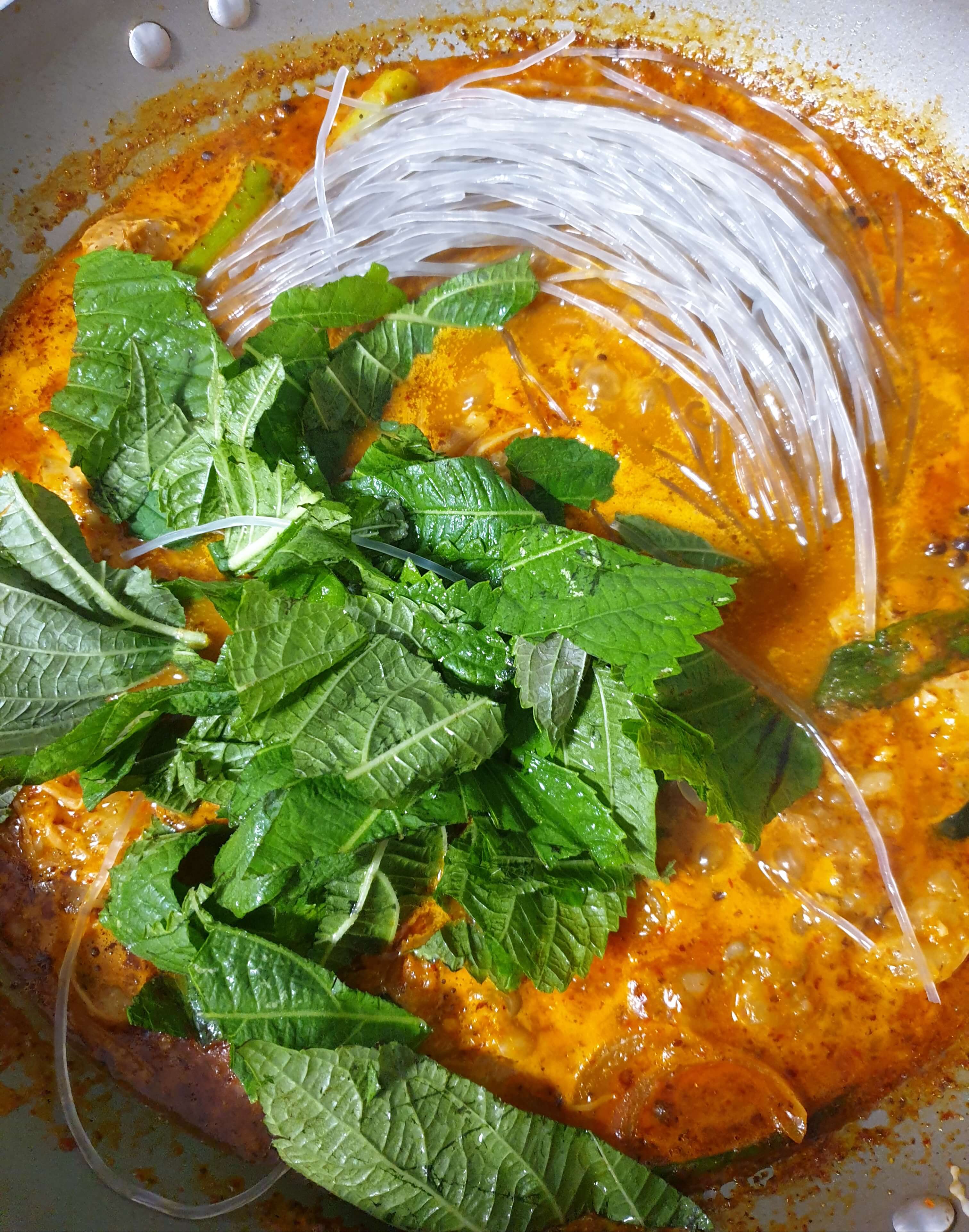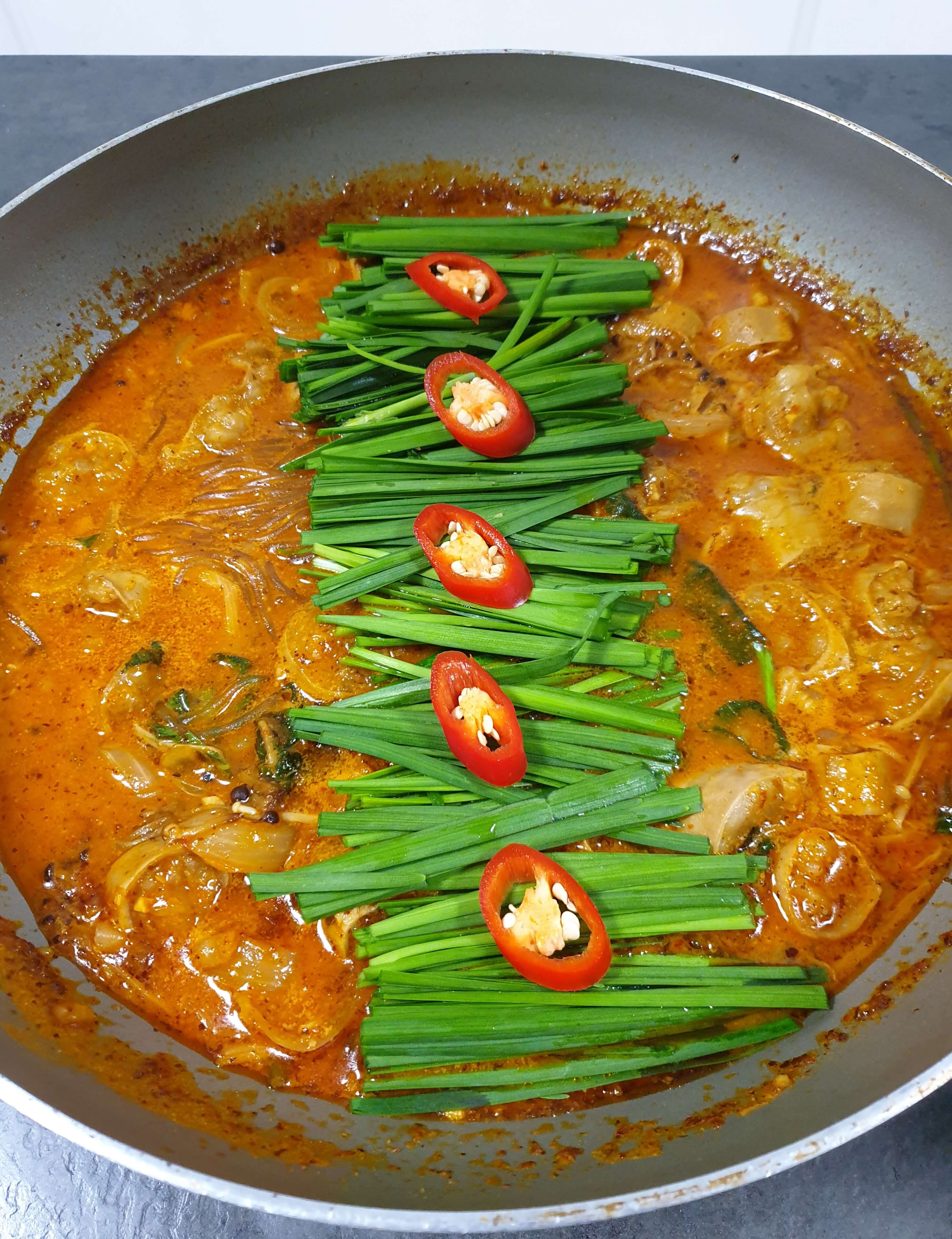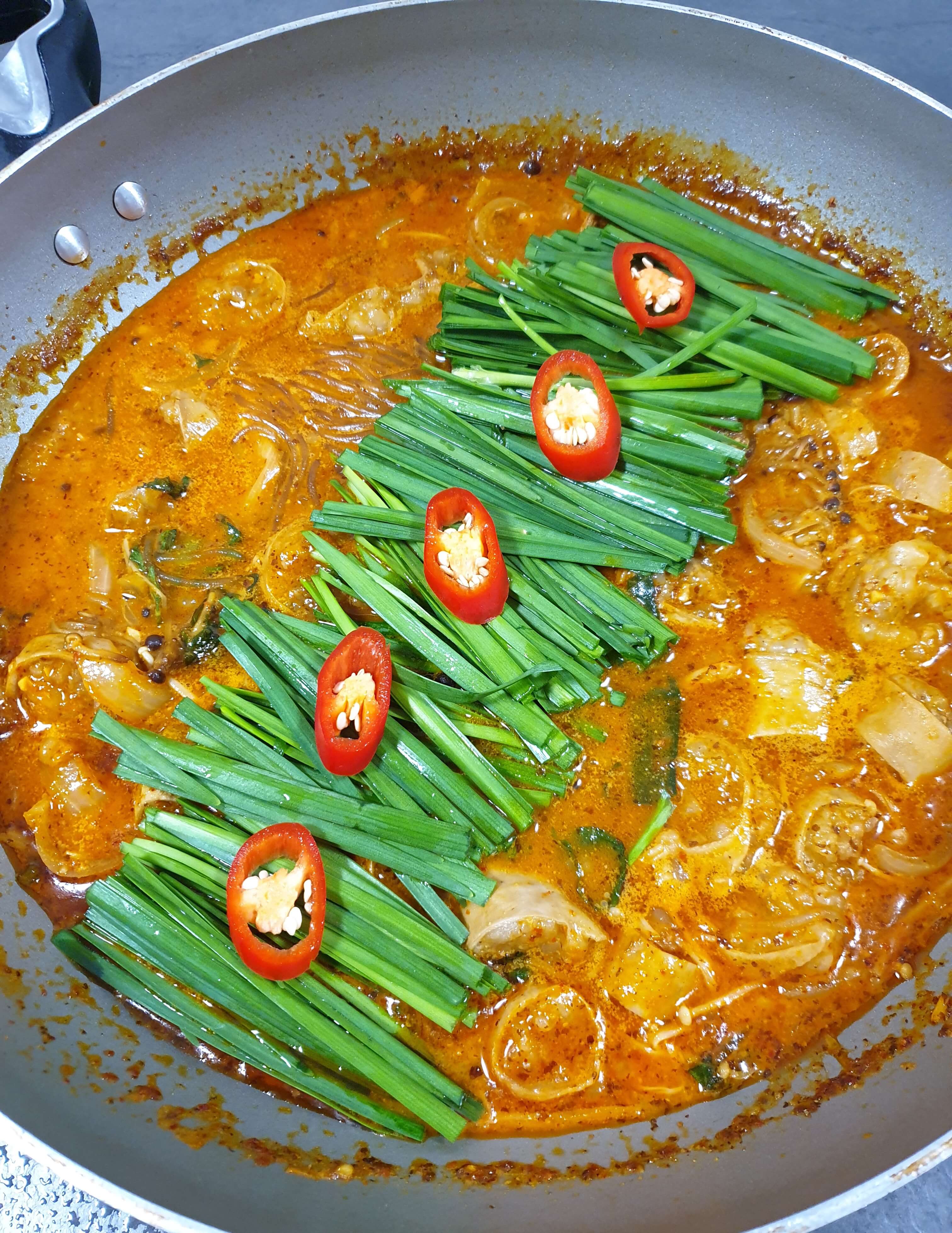 부추, 홍고추, 사골 진액, 당면