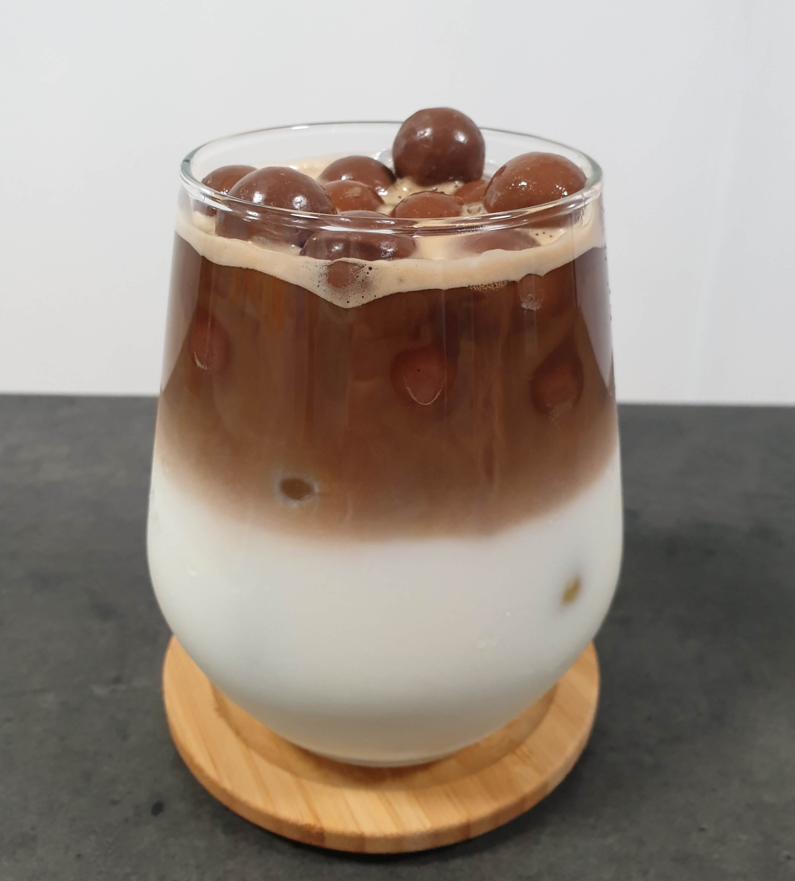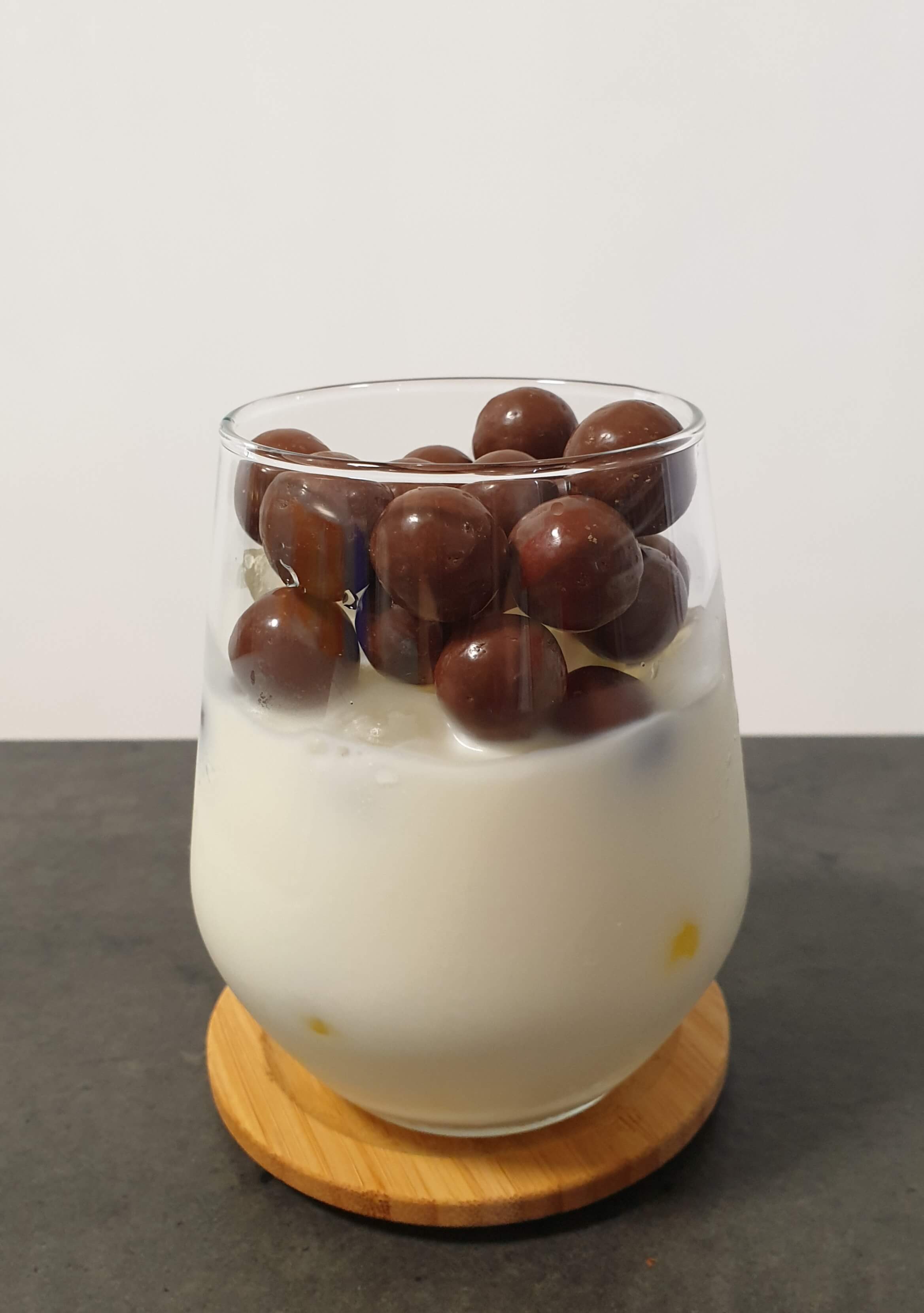 컵에 얼음과 우유를 따르고 남은 부분을 몰티져스 초코볼로 채워 주세요.