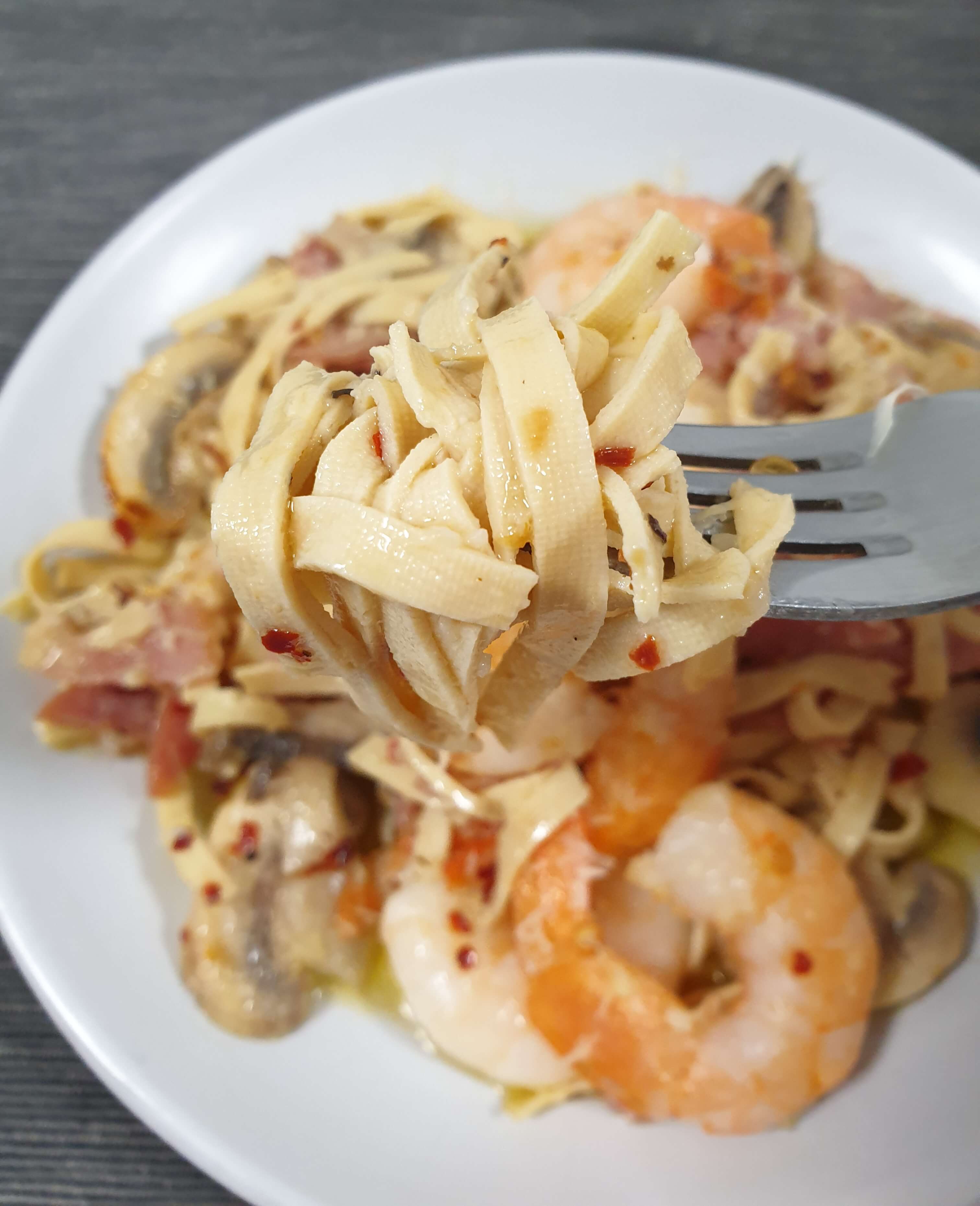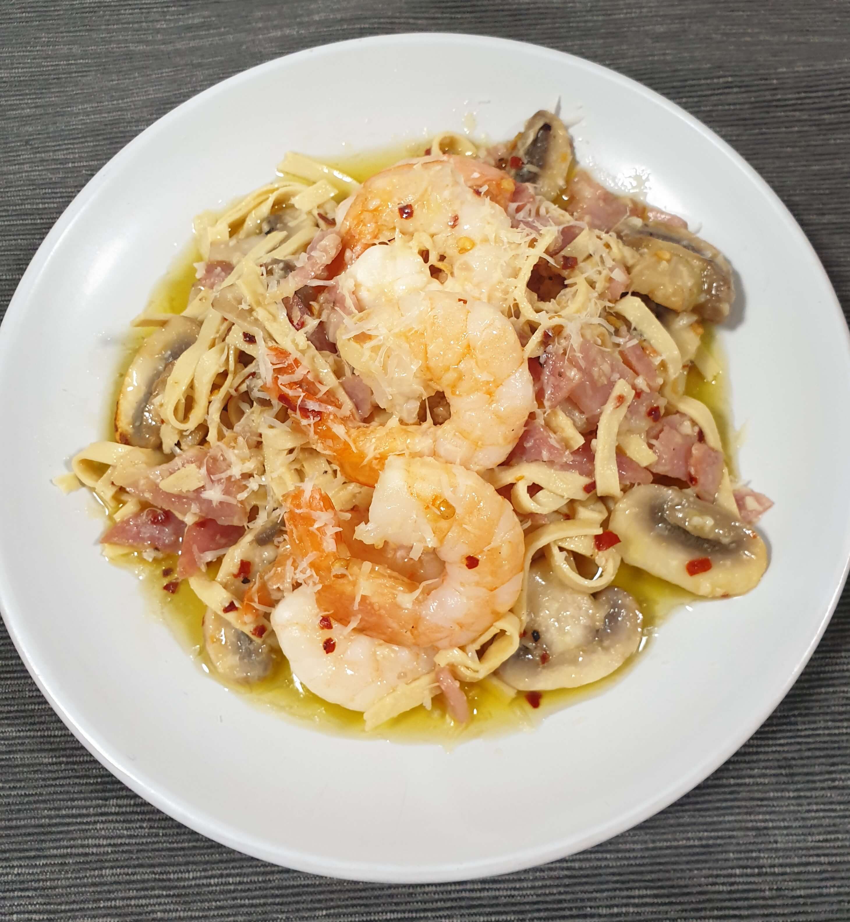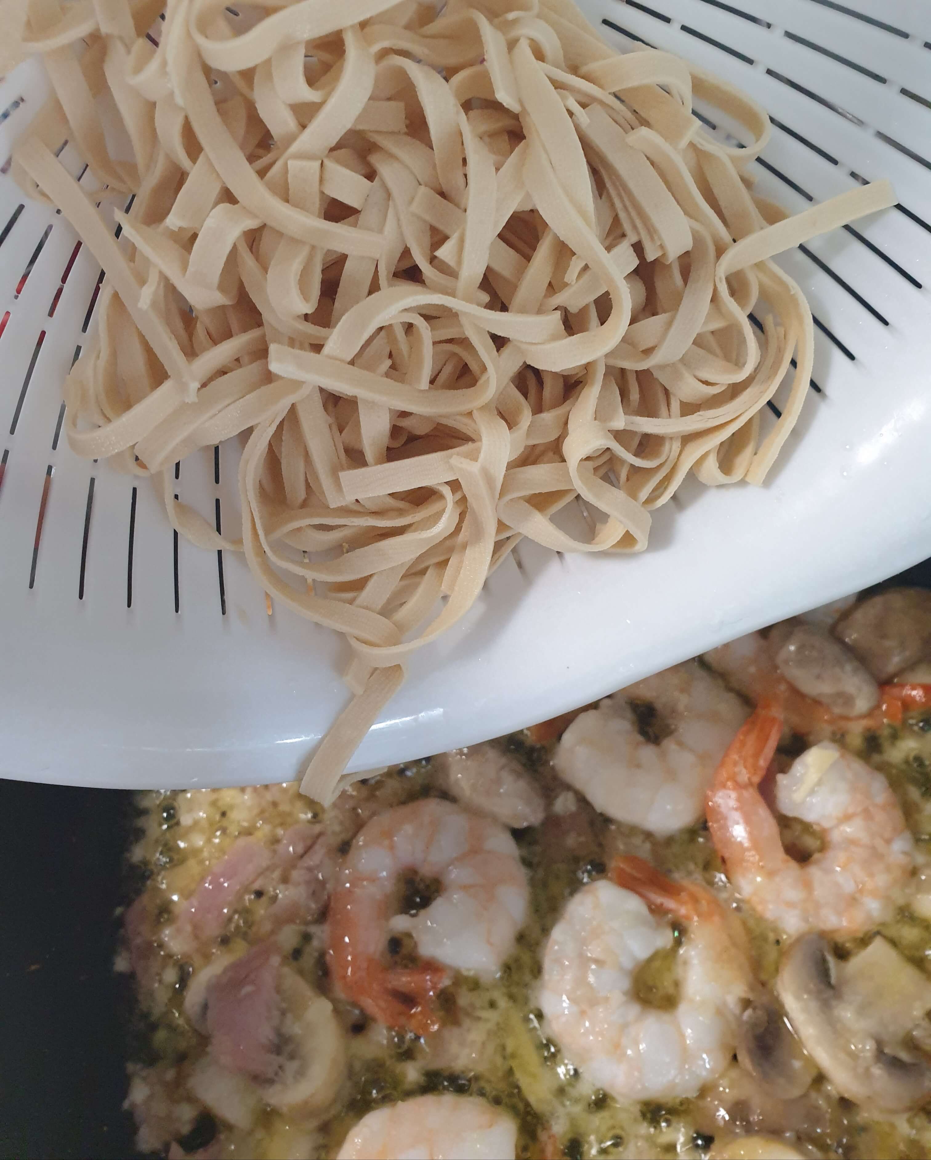 새우 듬뿍, 베이컨, 양송이버섯을 익혀주고