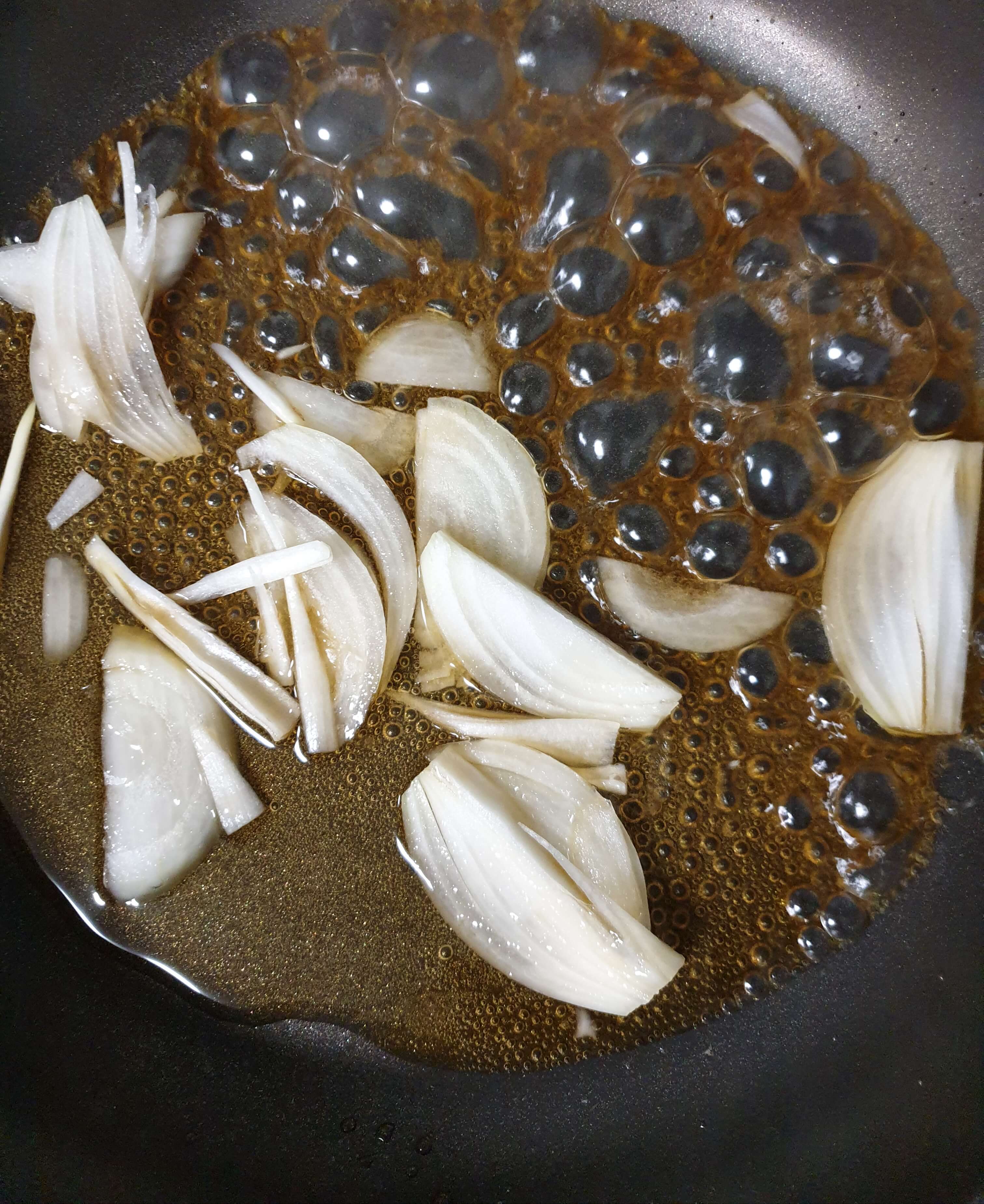 끓어오르면 양파 1/4개 채 썬 걸 넣어 주세요.