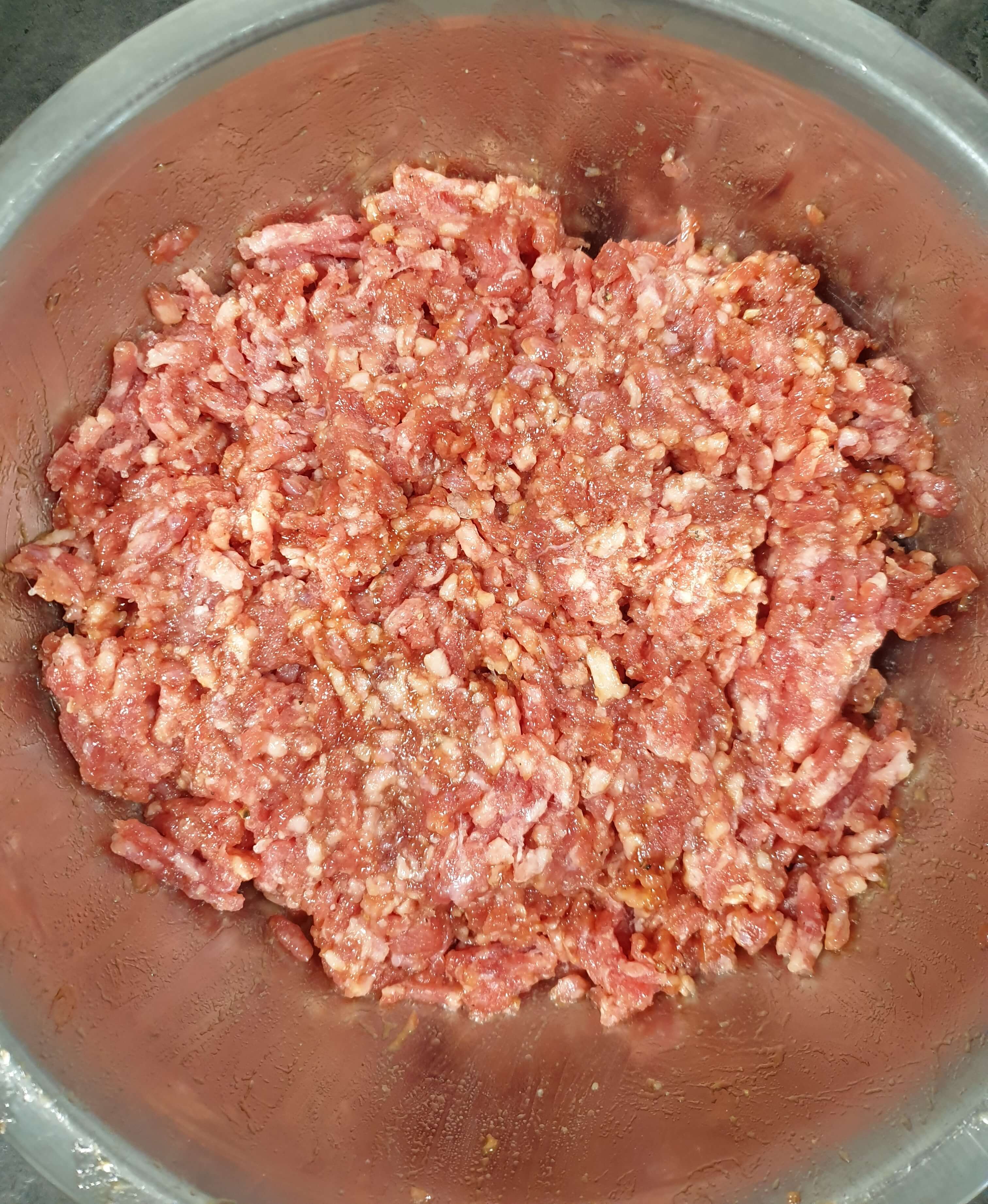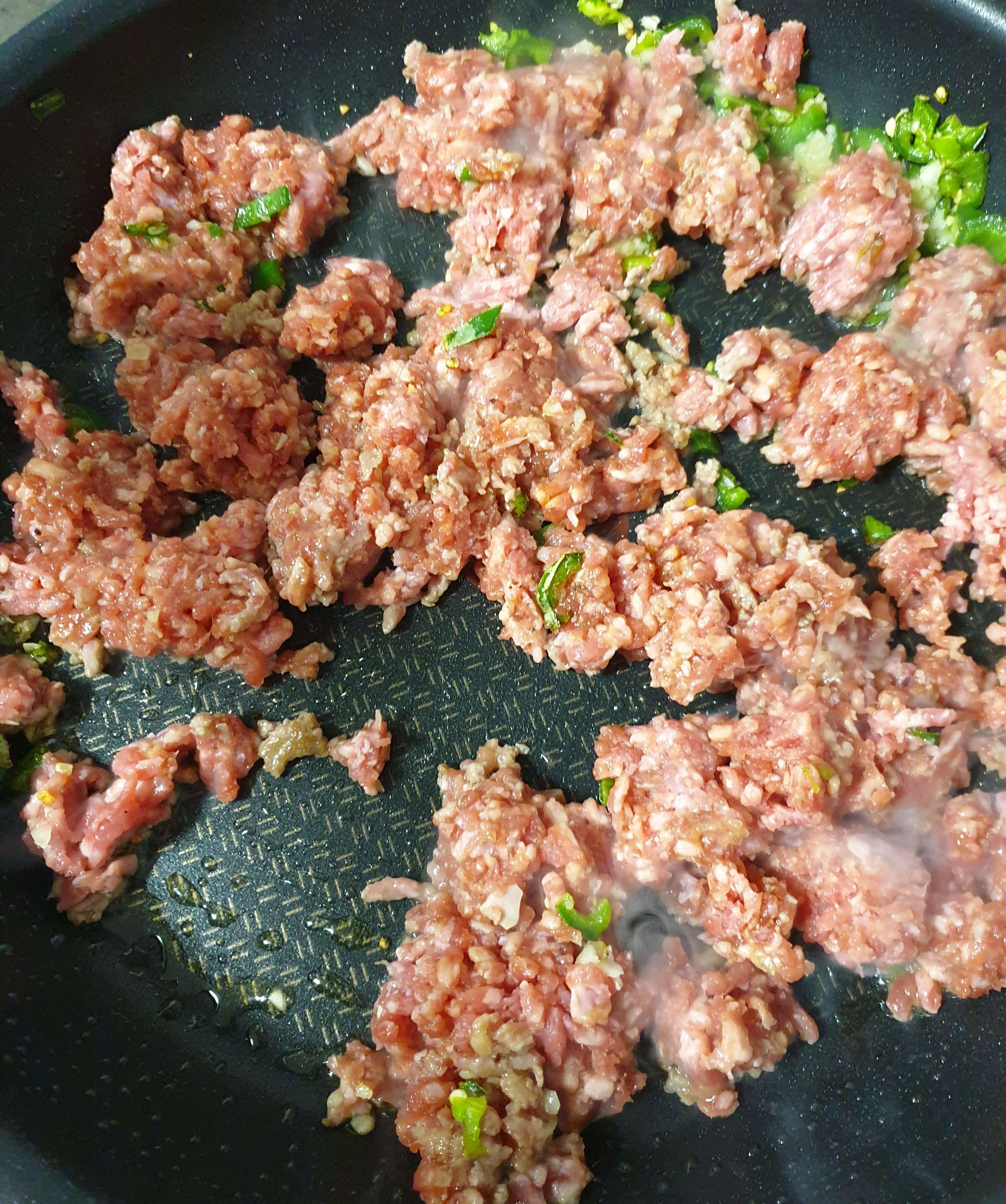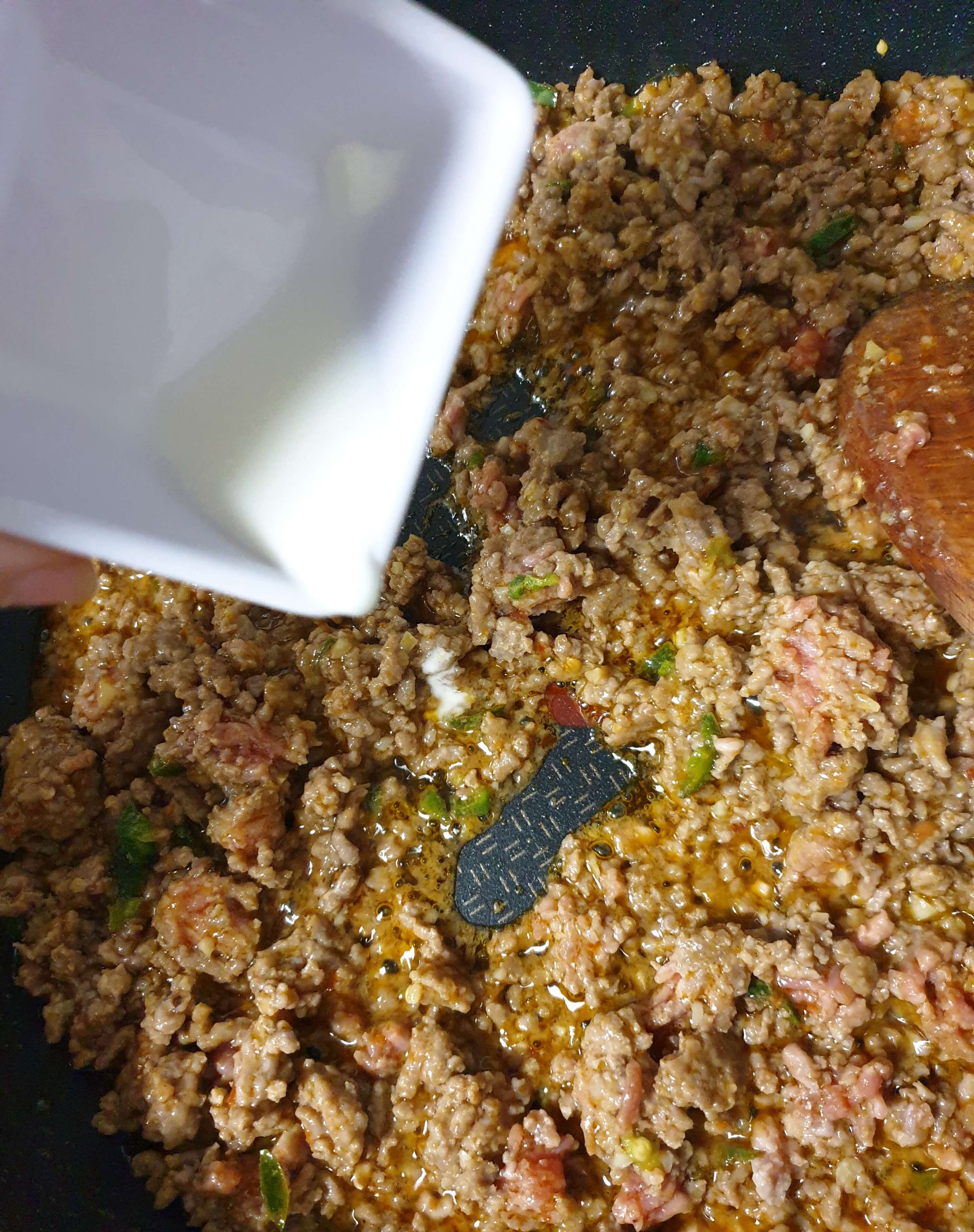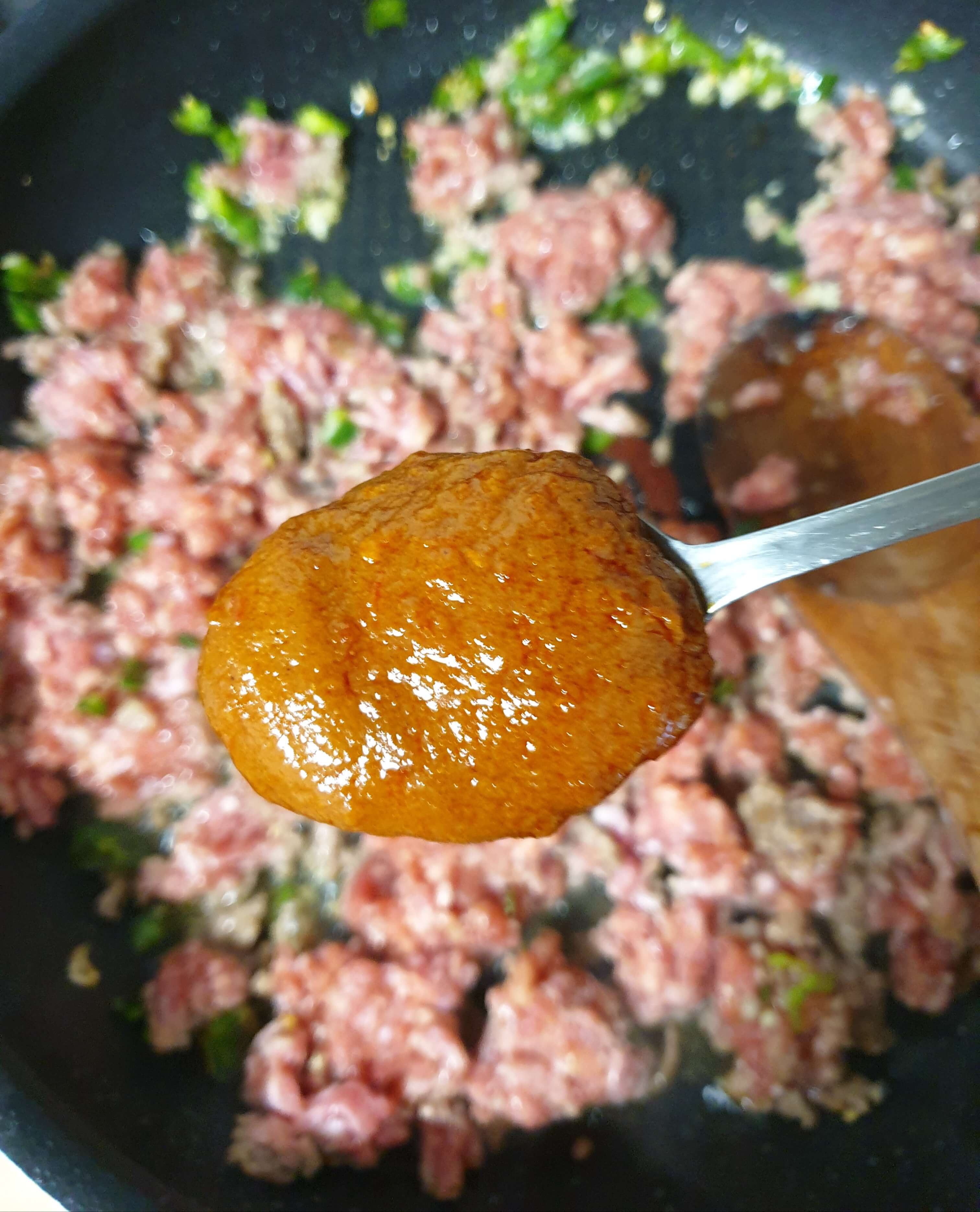 밑간 해둔 소고기와 두반장 소스도 넣어 주세요.