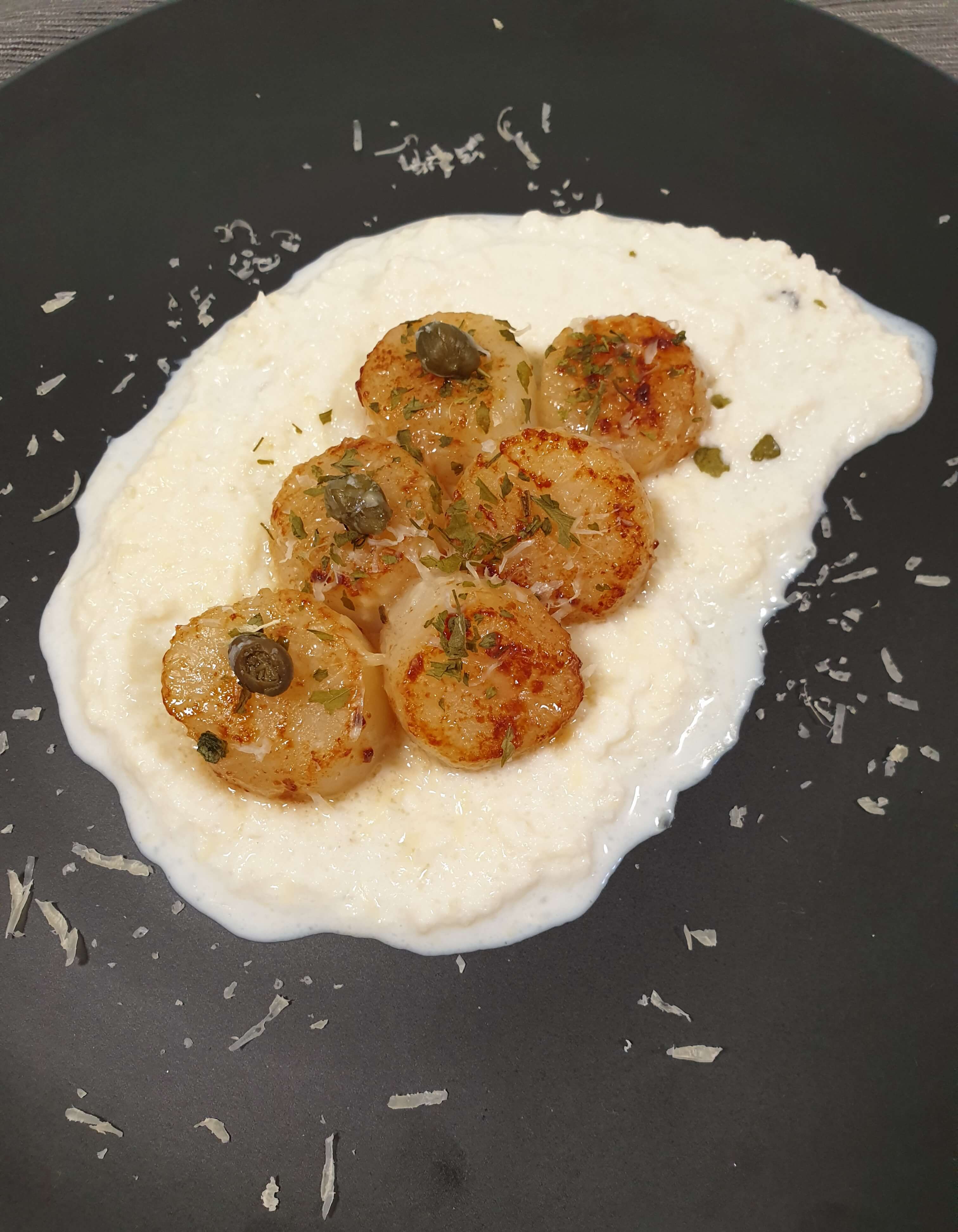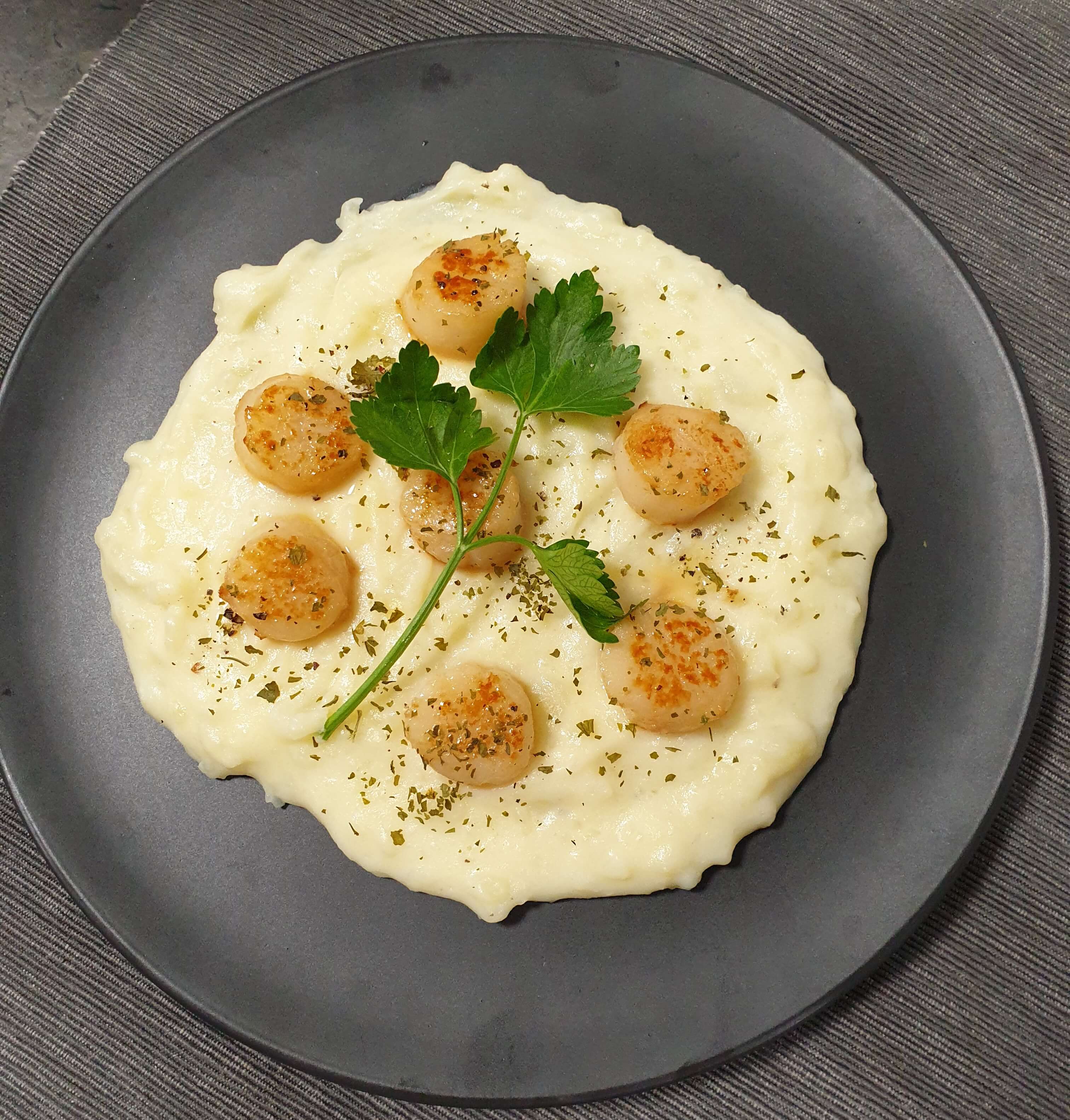 감자 퓨레 관자 스테이크예요.