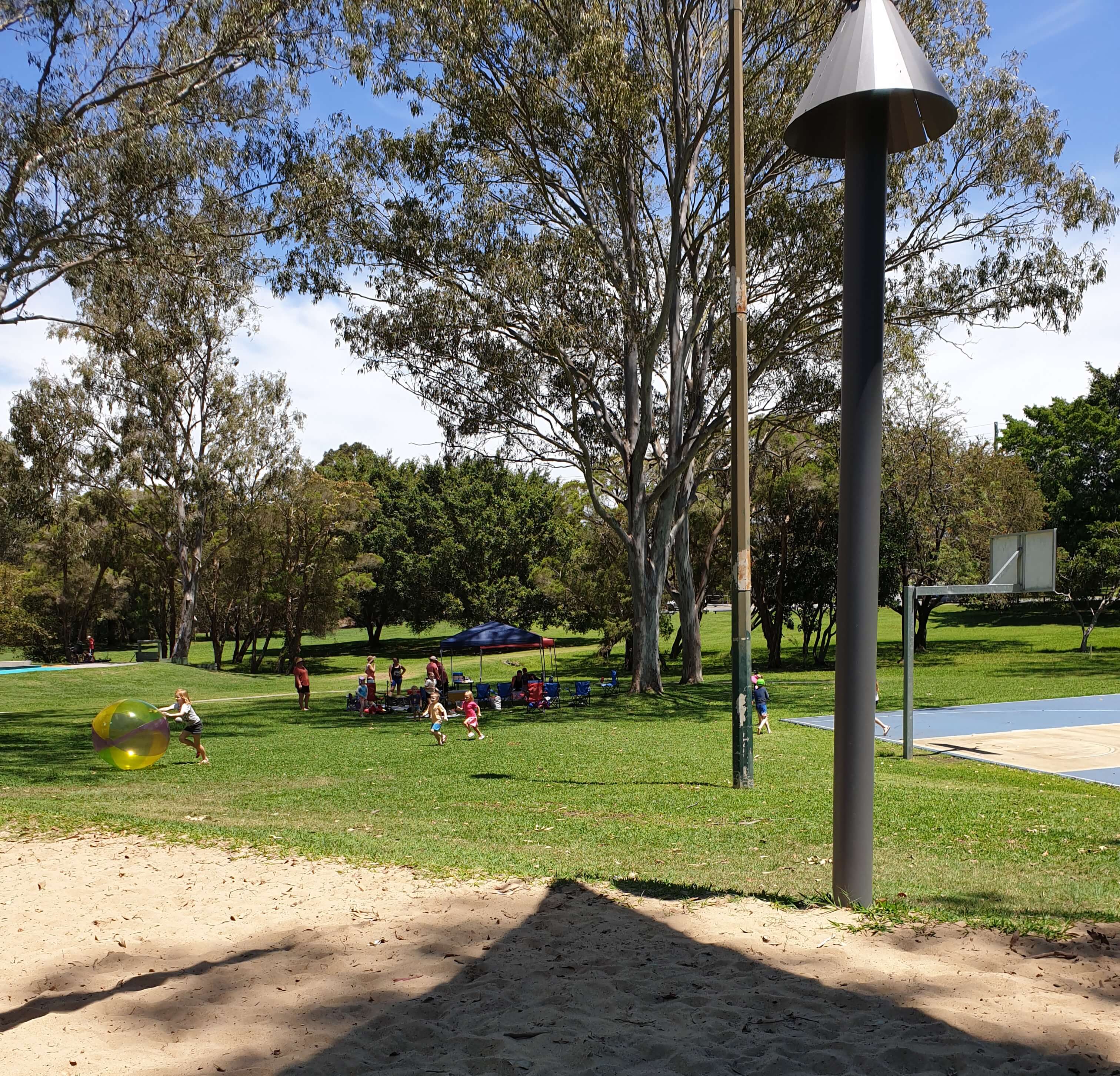 멀리 큰 공놀이하고 노는 아이들이 너무 재미있어 보였는지, 아기가 미끄럼틀 타다가 저쪽으로 뛰어가고,