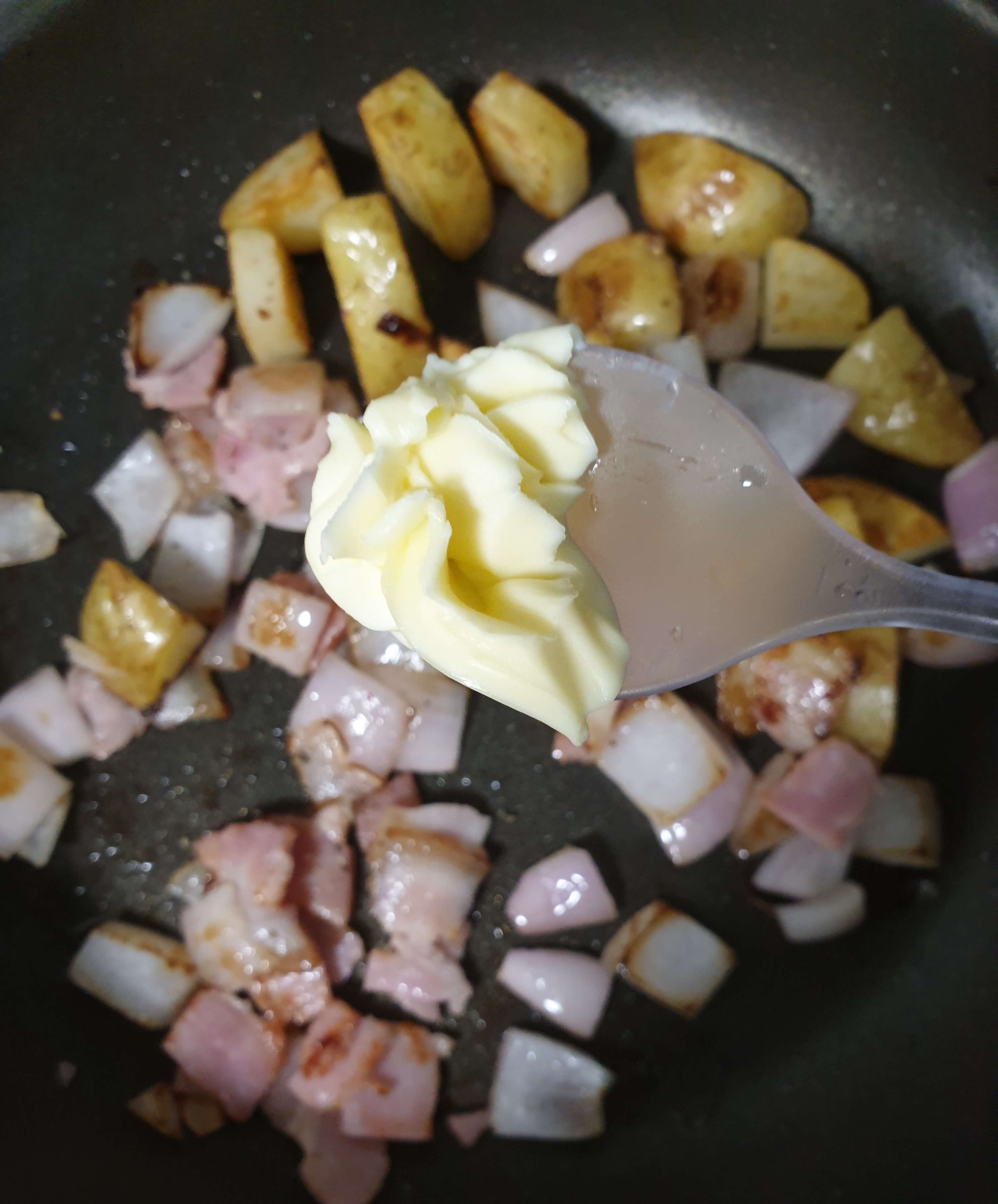 감자랑 양파랑 베이컨을 포크로 한 번에 찍어서
