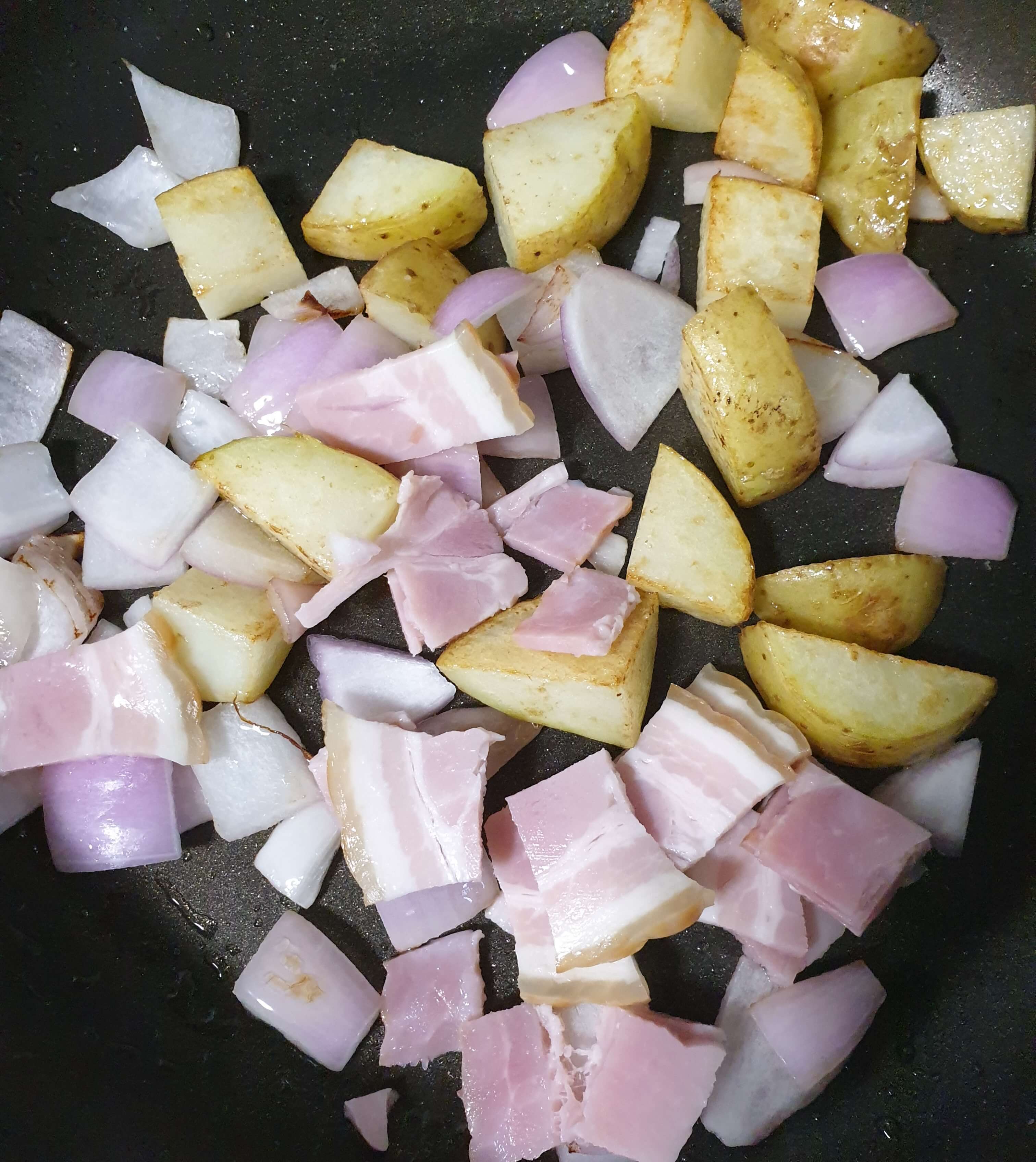 양파가 다 익어가면 베이컨도 넣어서 구워주세요.