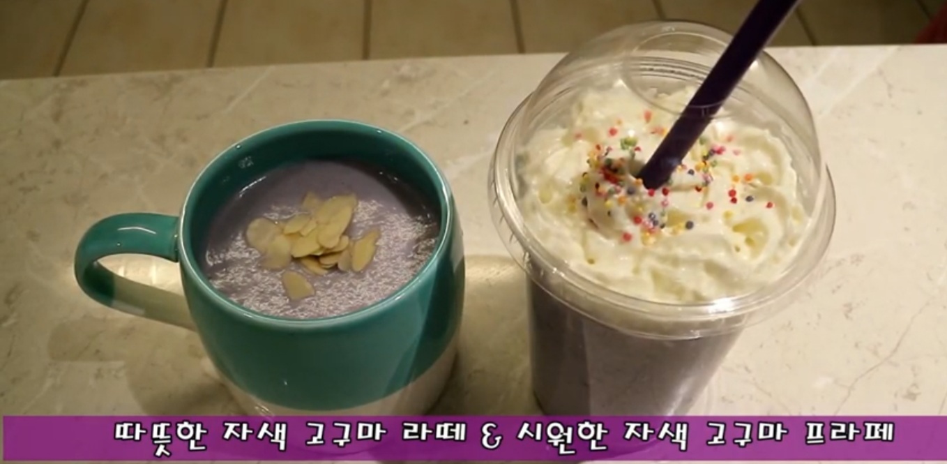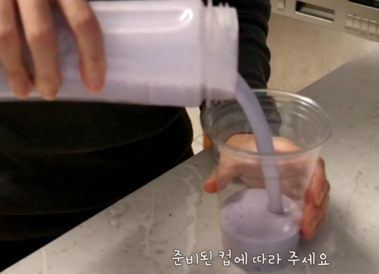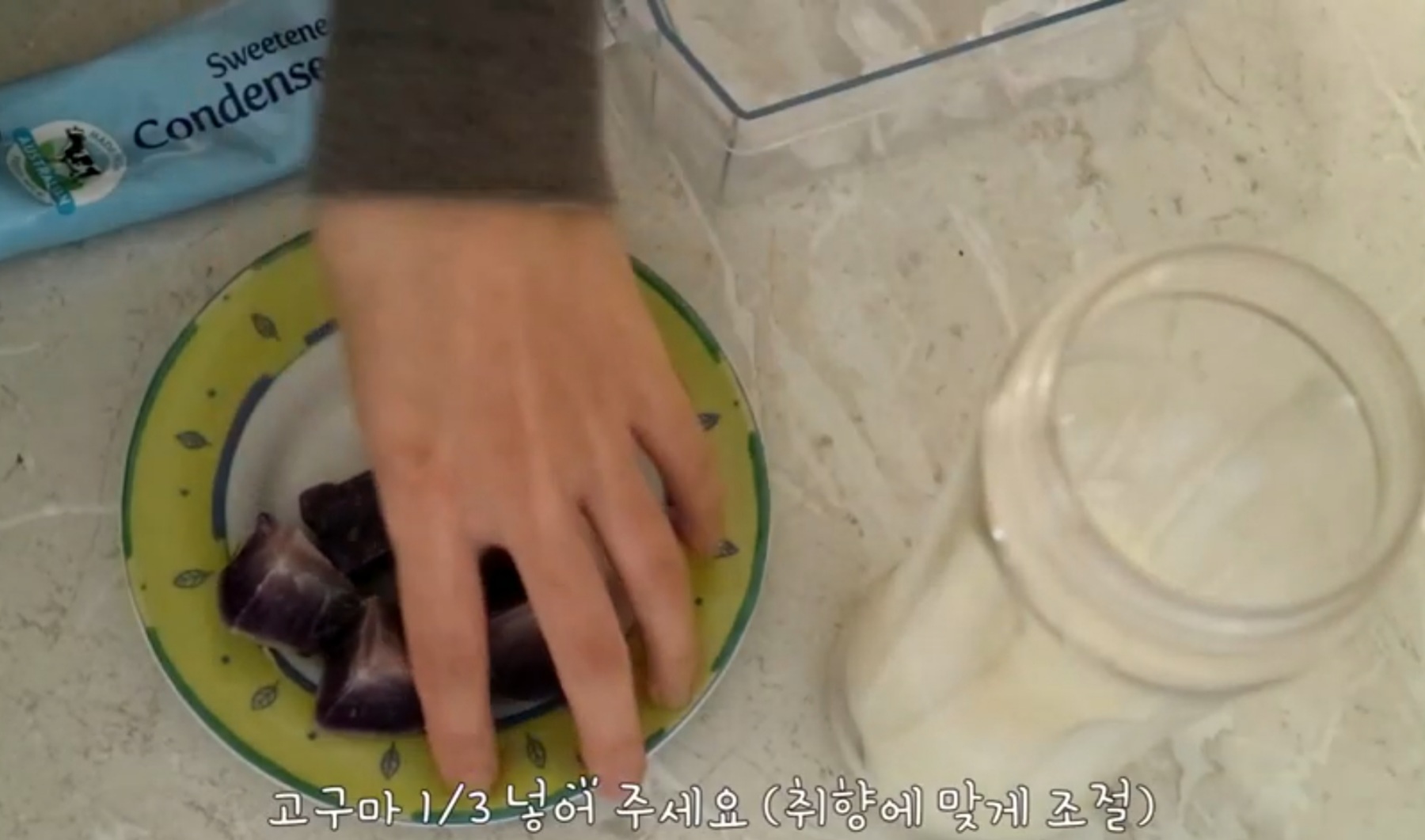 얼음 없이 우유랑 연유, 자색 고구마 넣고 갈아서