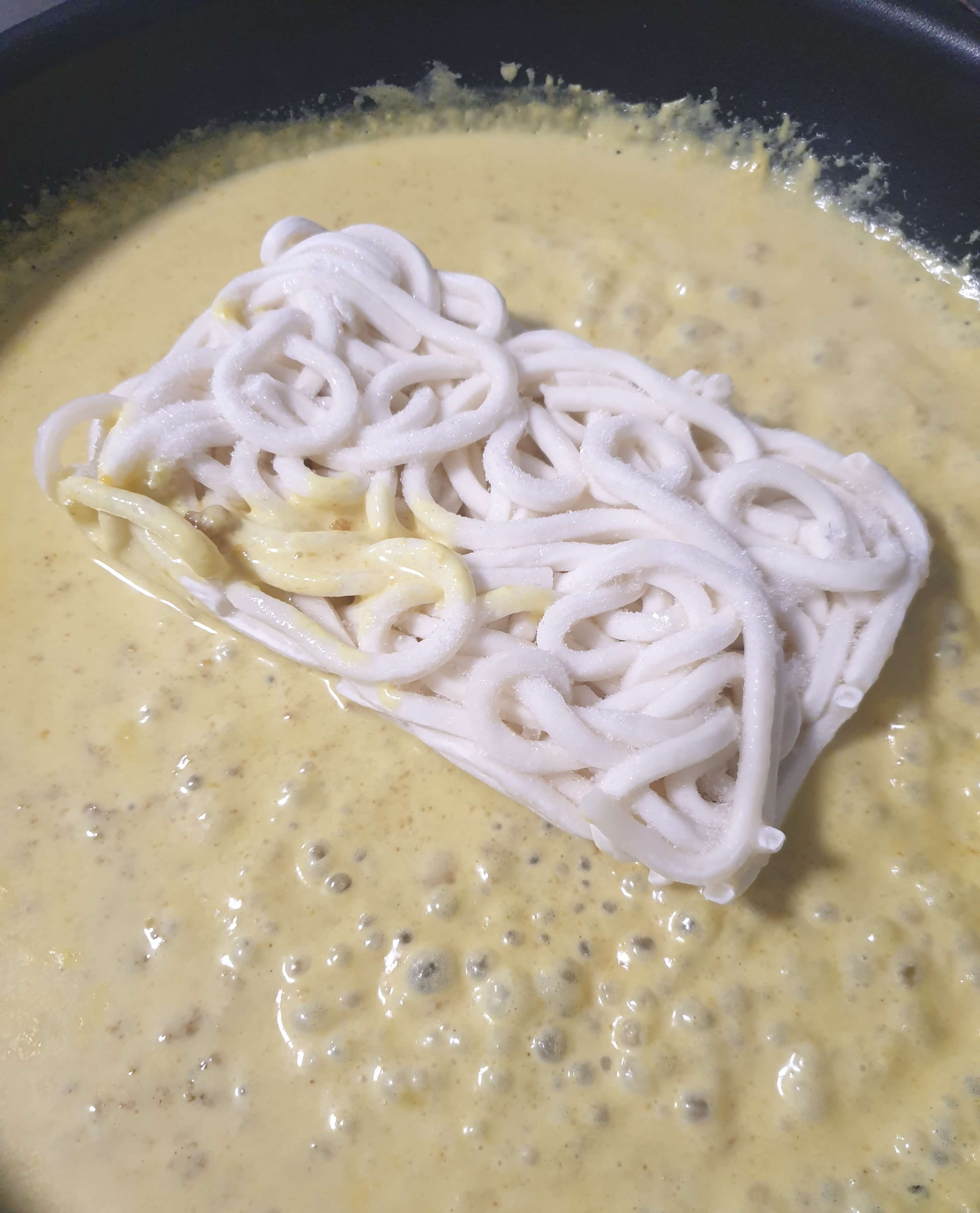 넓은 후라이 팬에 우동을 만들었는데