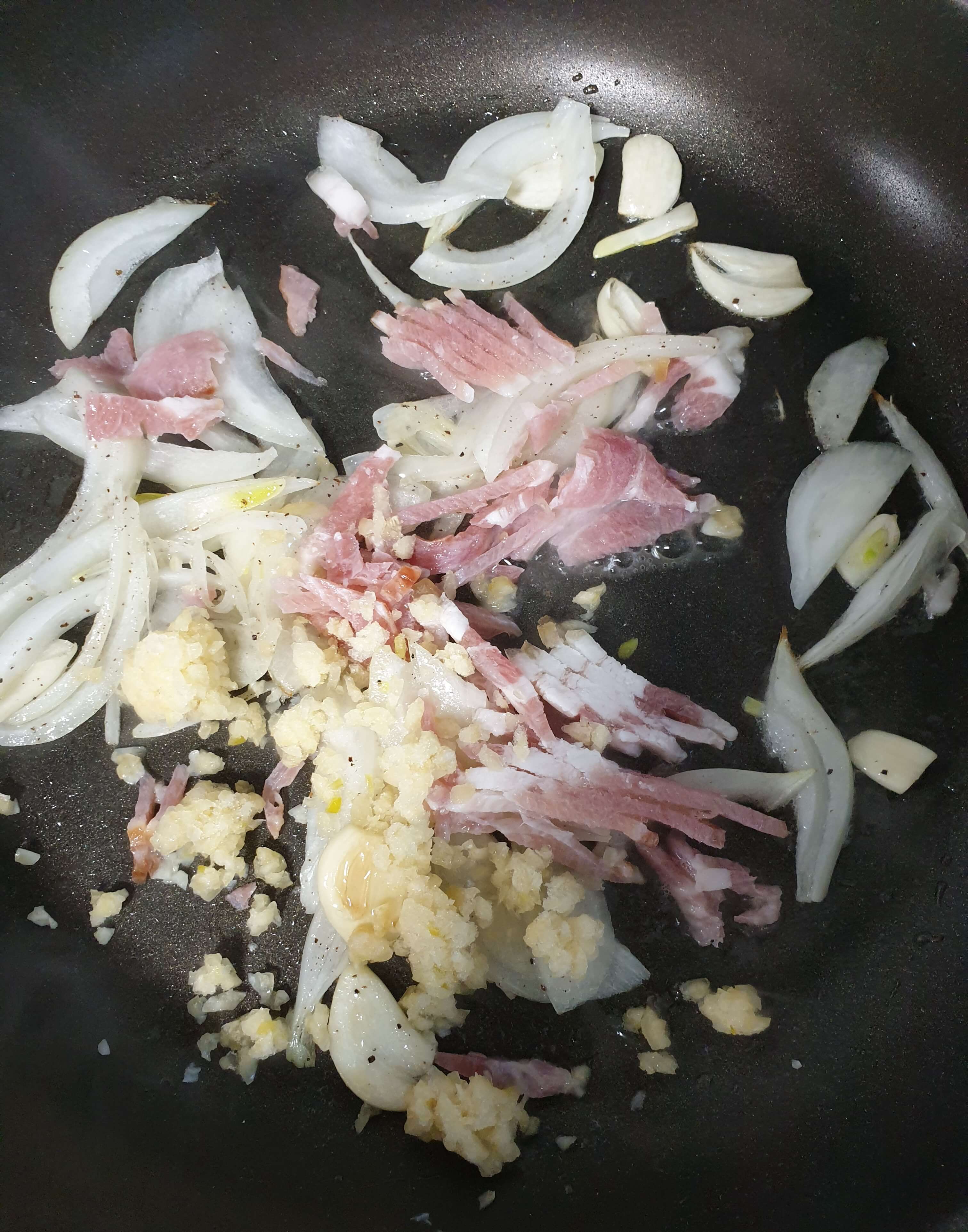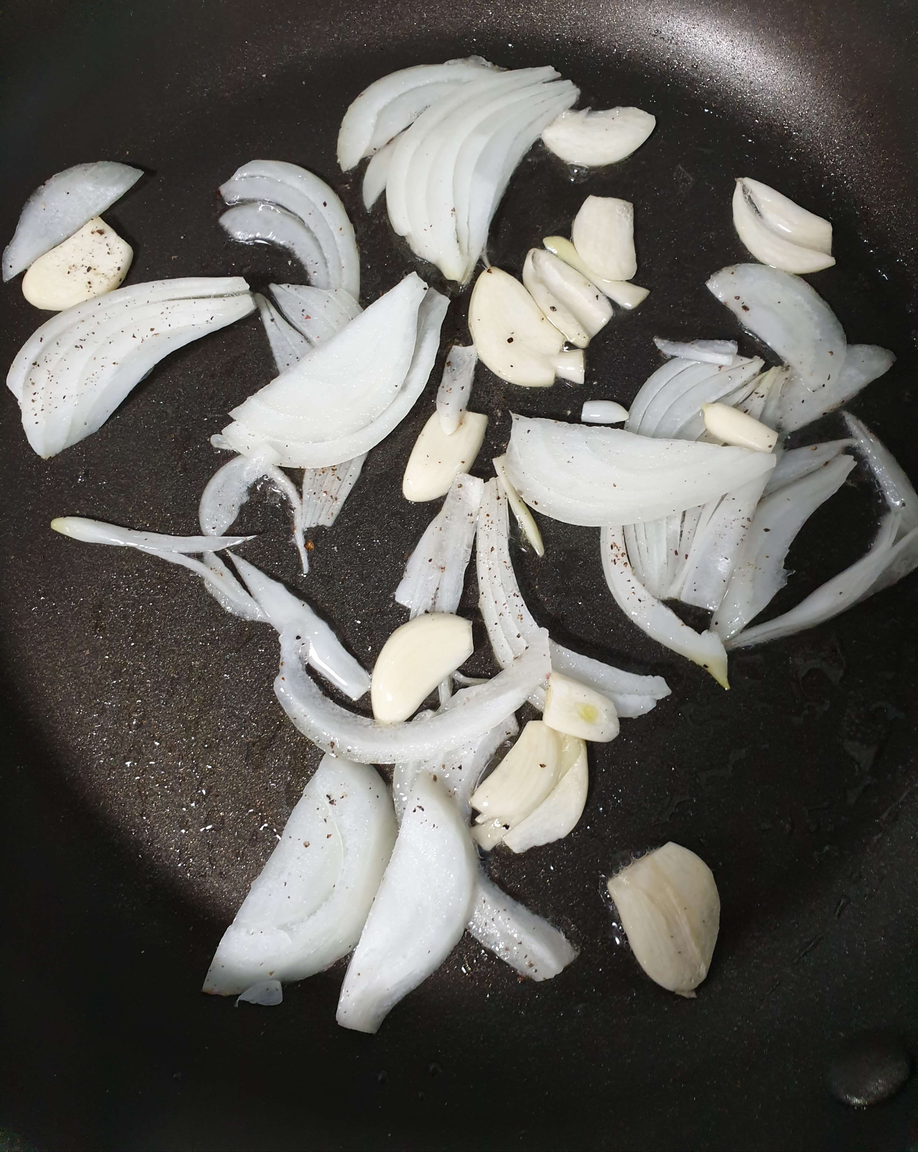 양파 1/4개와 마늘 2~3개를 편 썰어