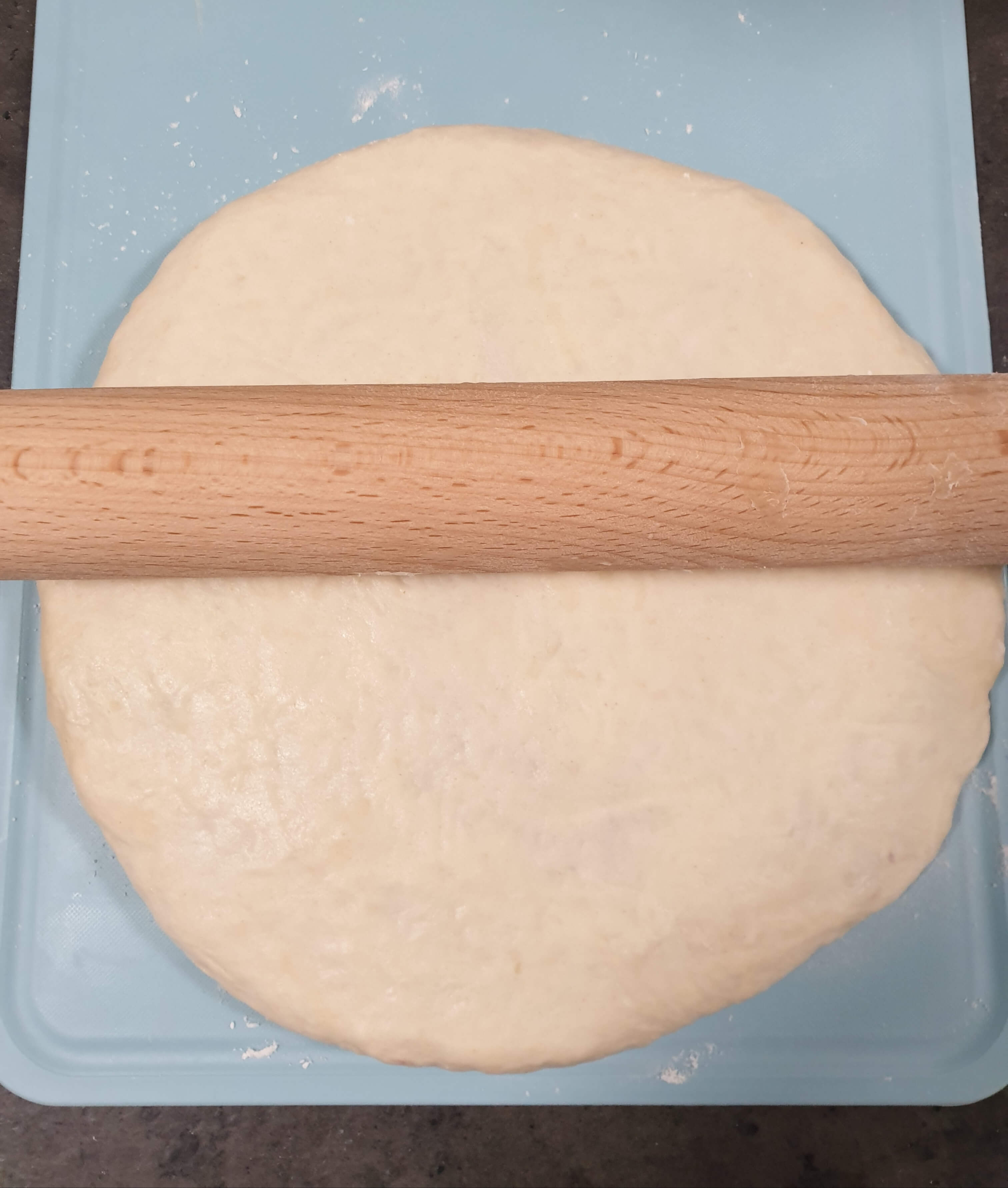 밀대를 이용해 반죽을 동그랗고 크게 펴주세요.