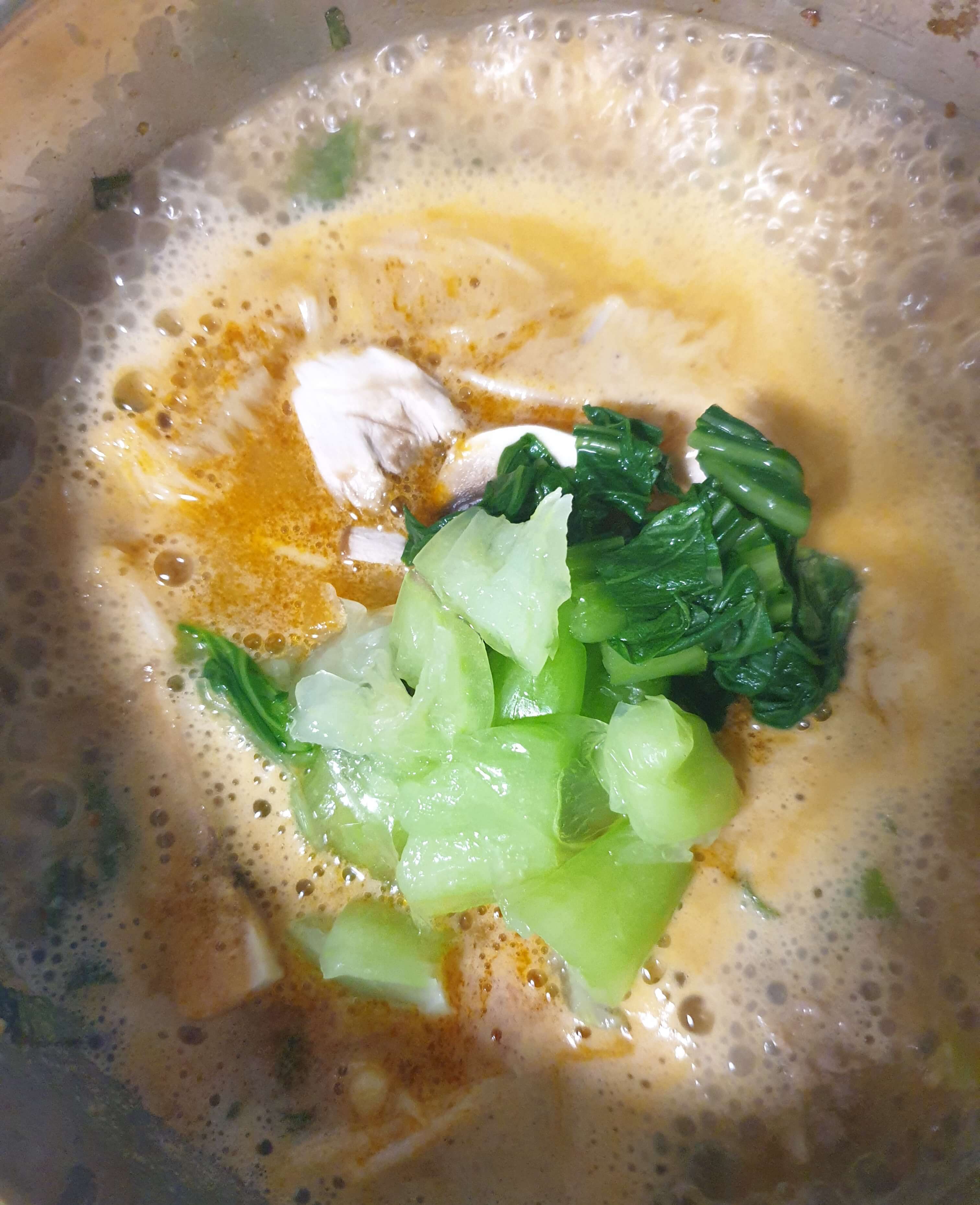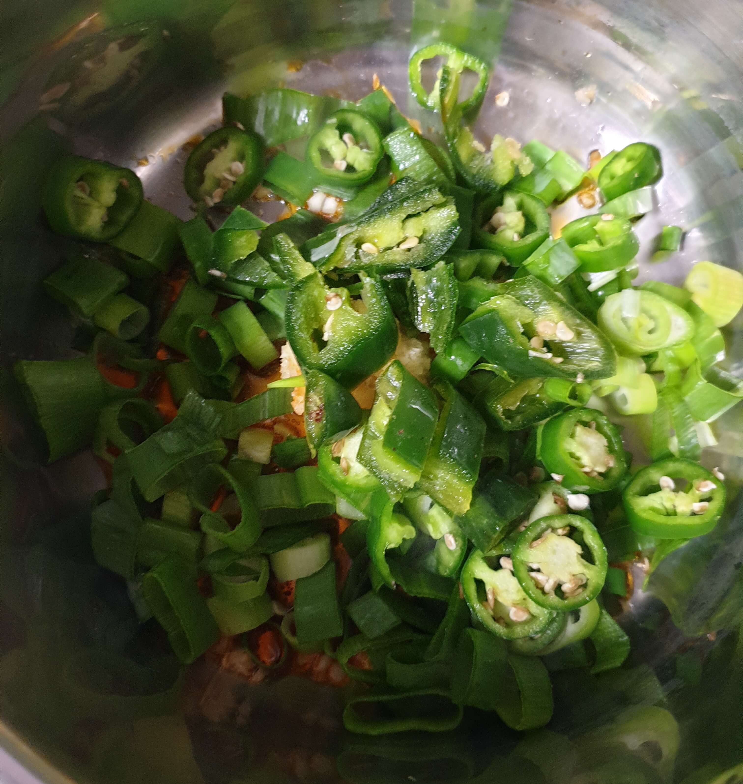 데쳐 놓은 청경채도 송송 썰어 넣어 주세요.
