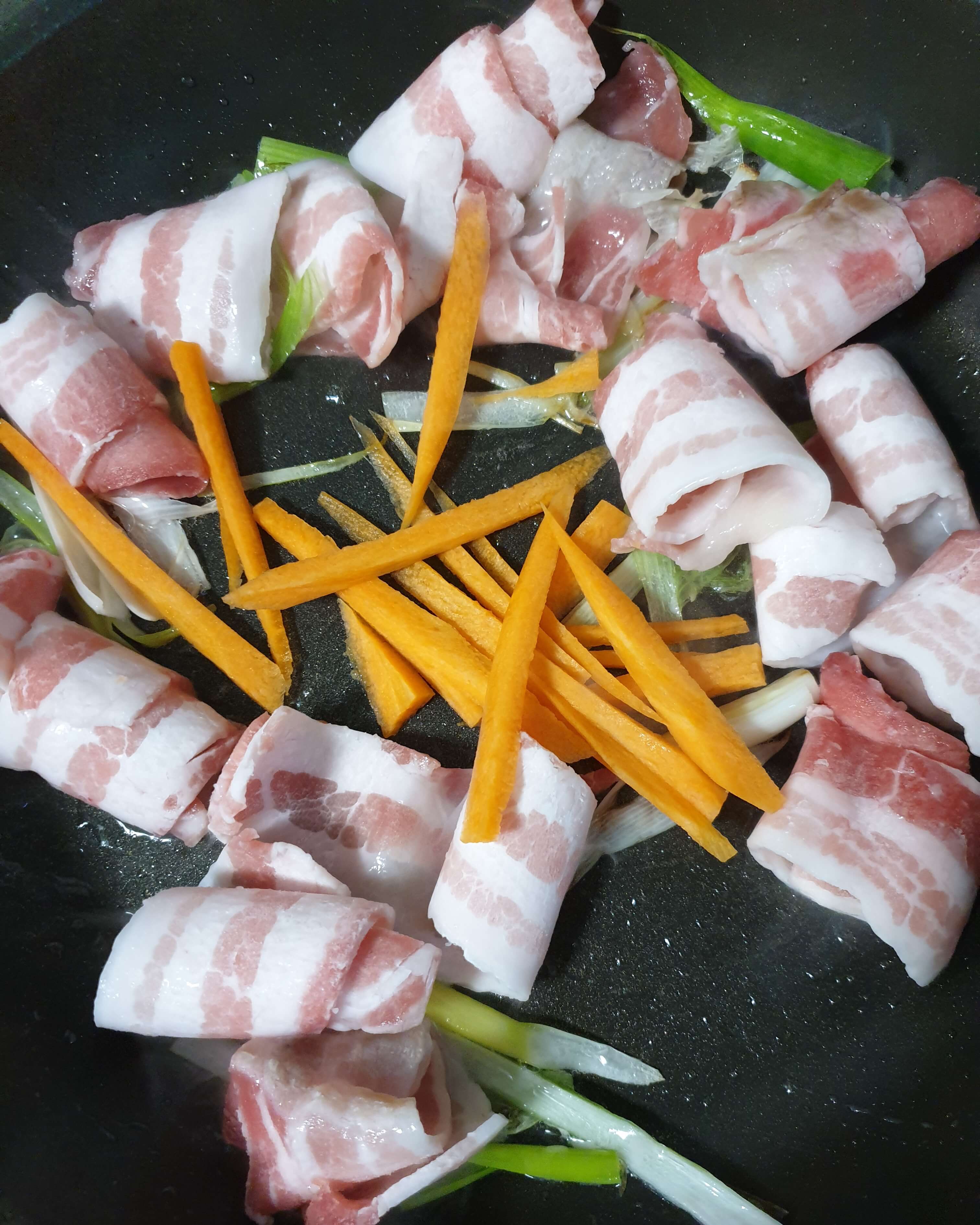 당근과 대패 삼겹살도 넣어서 볶아 주세요.