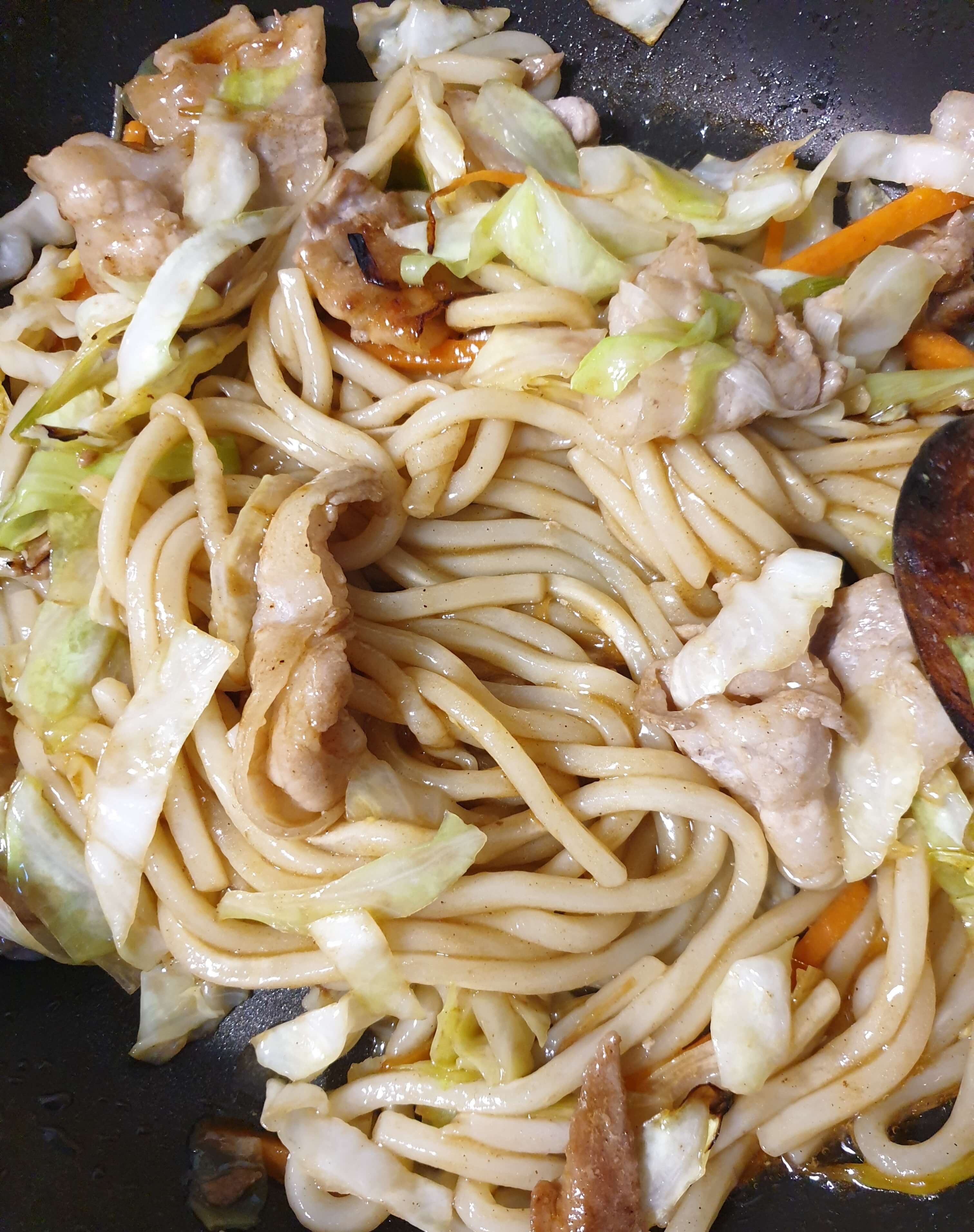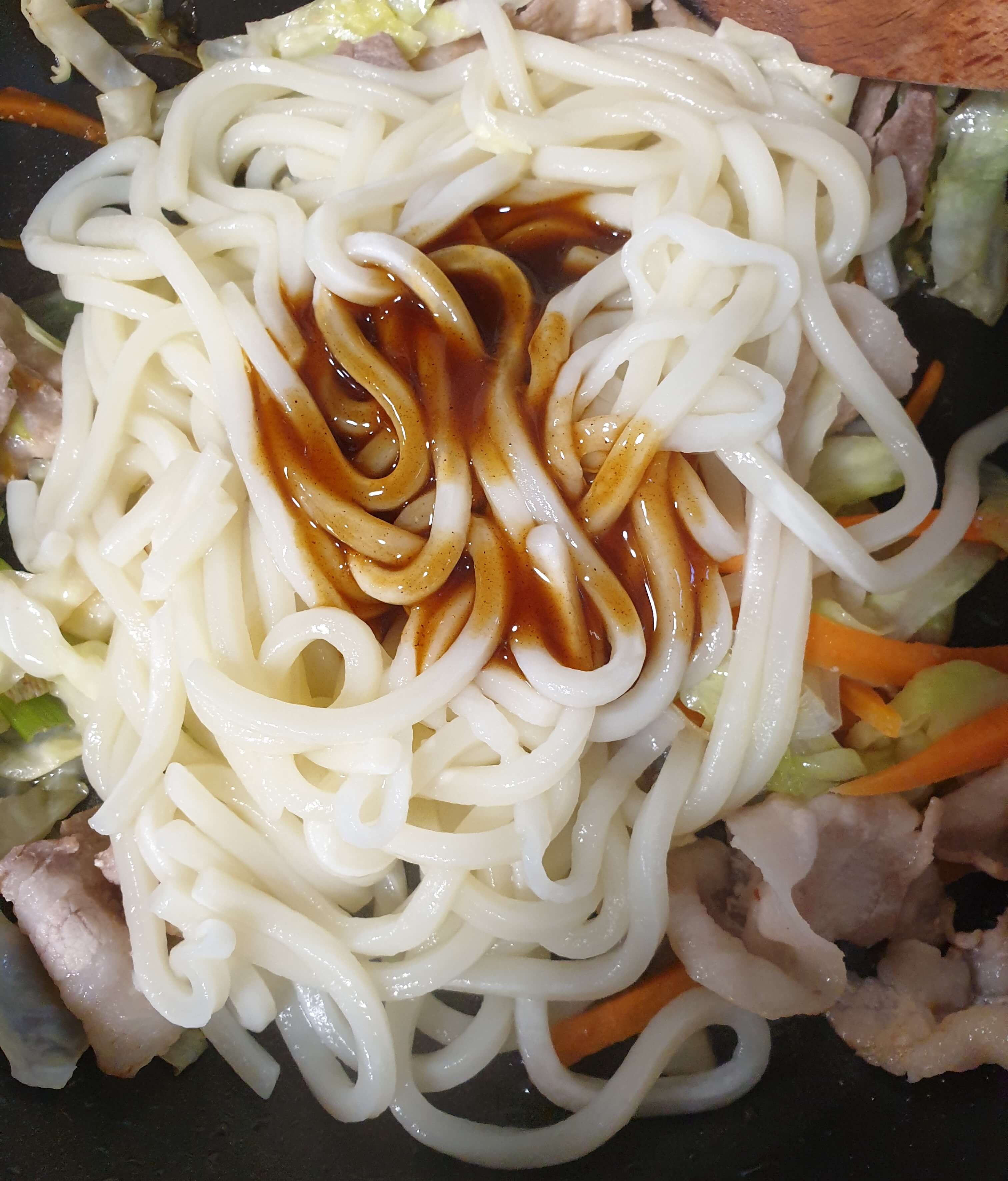 우동 면을 건져 팬에 넣고