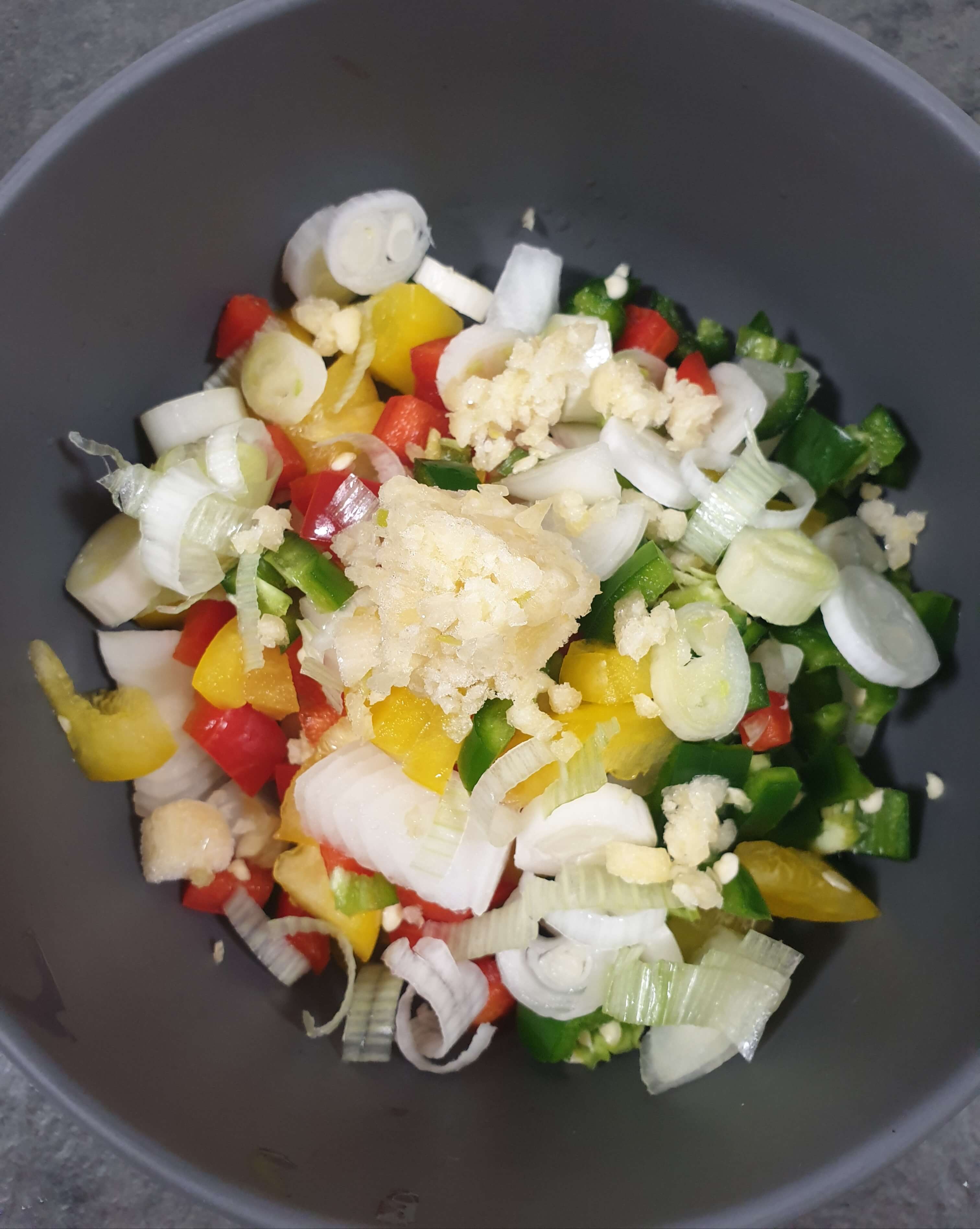 노란 피망, 파, 양파를 작게 잘라 주세요.