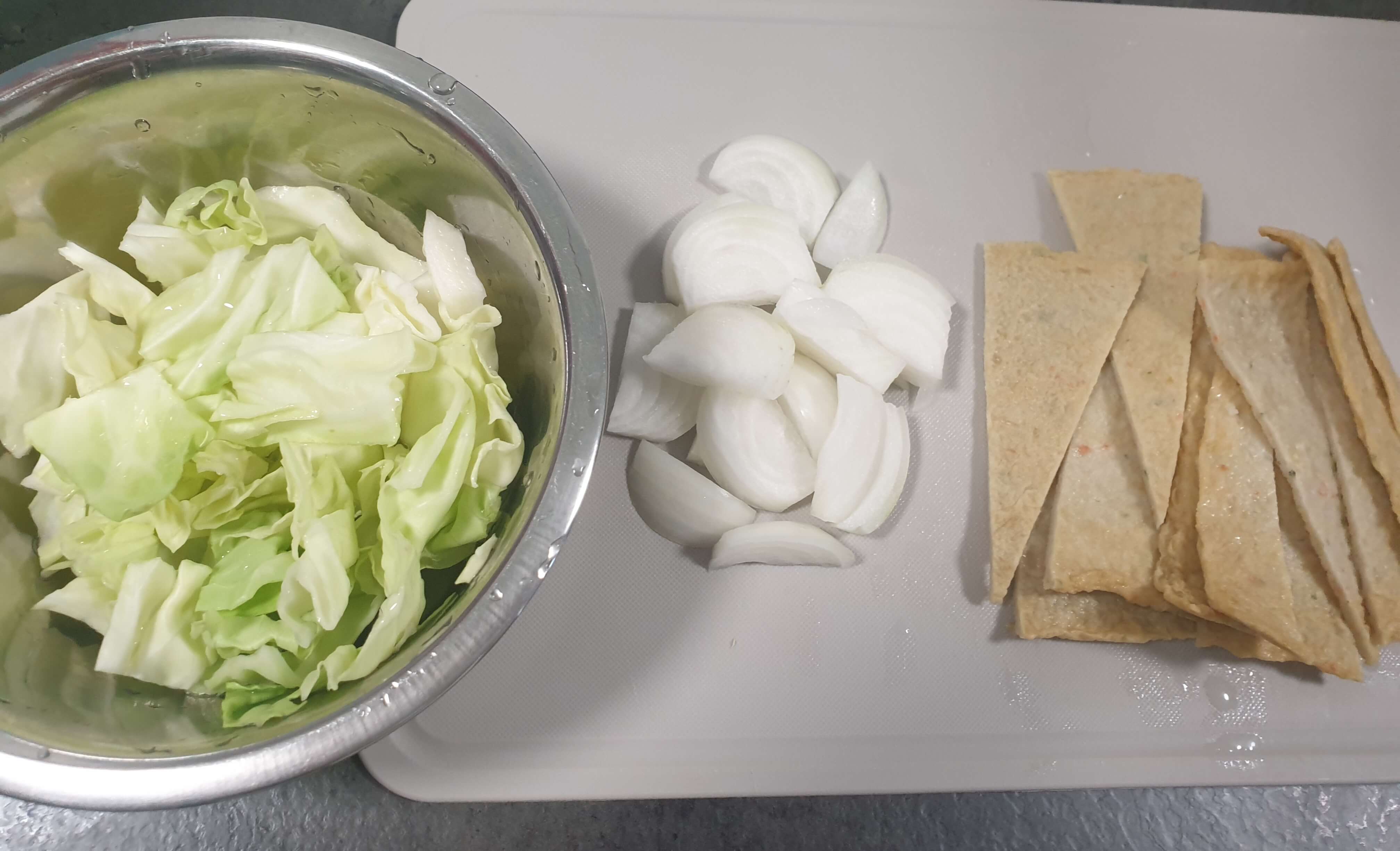 양파 반개와 어묵 2장을 썰어서 준비해 주세요.
