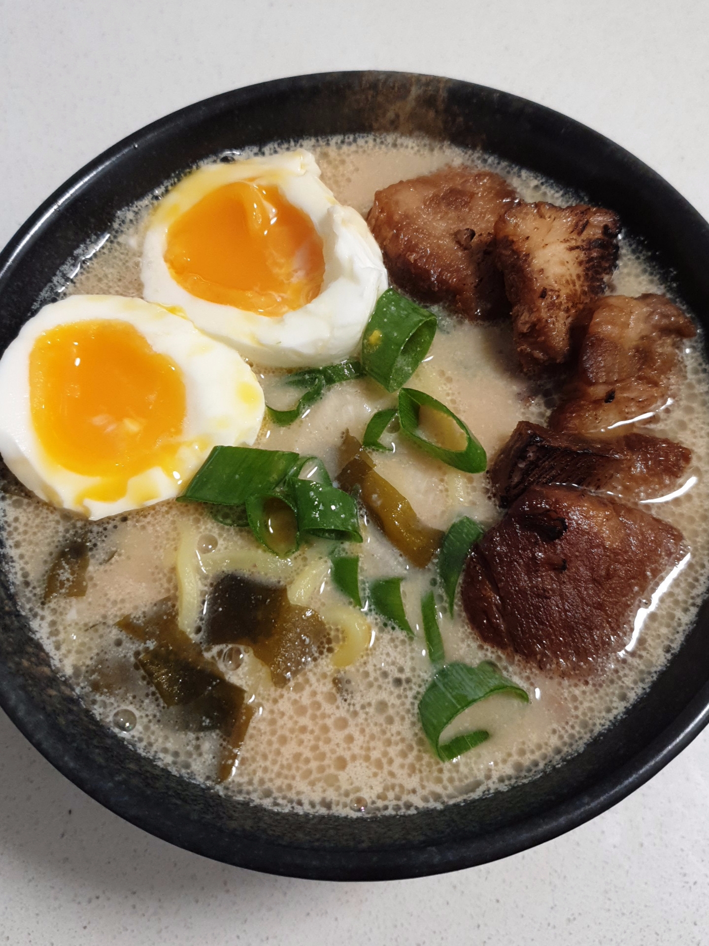 열심히 끓인 육수와 차슈, 반숙란, 파 고명으로 마무리해줬어요