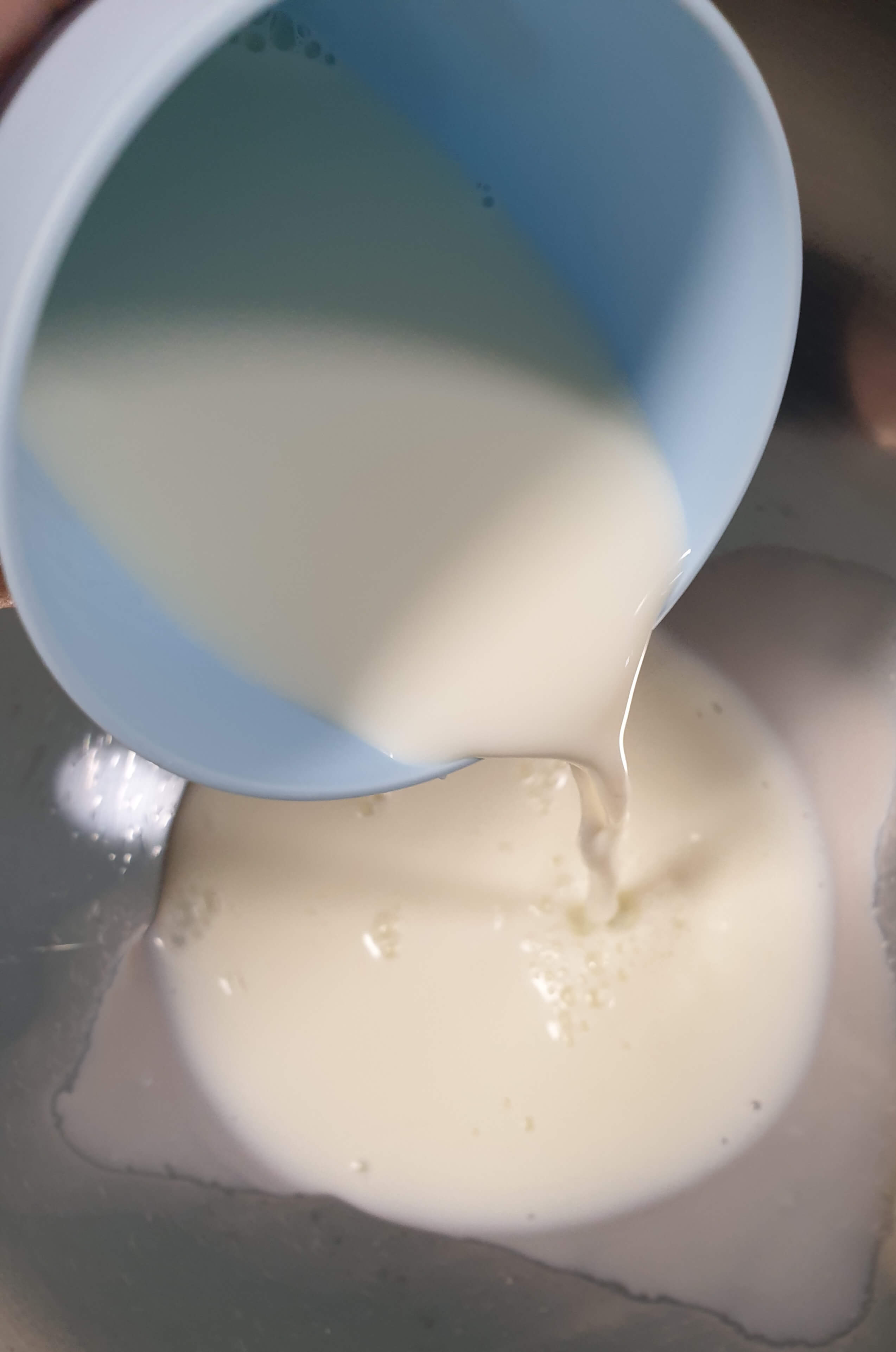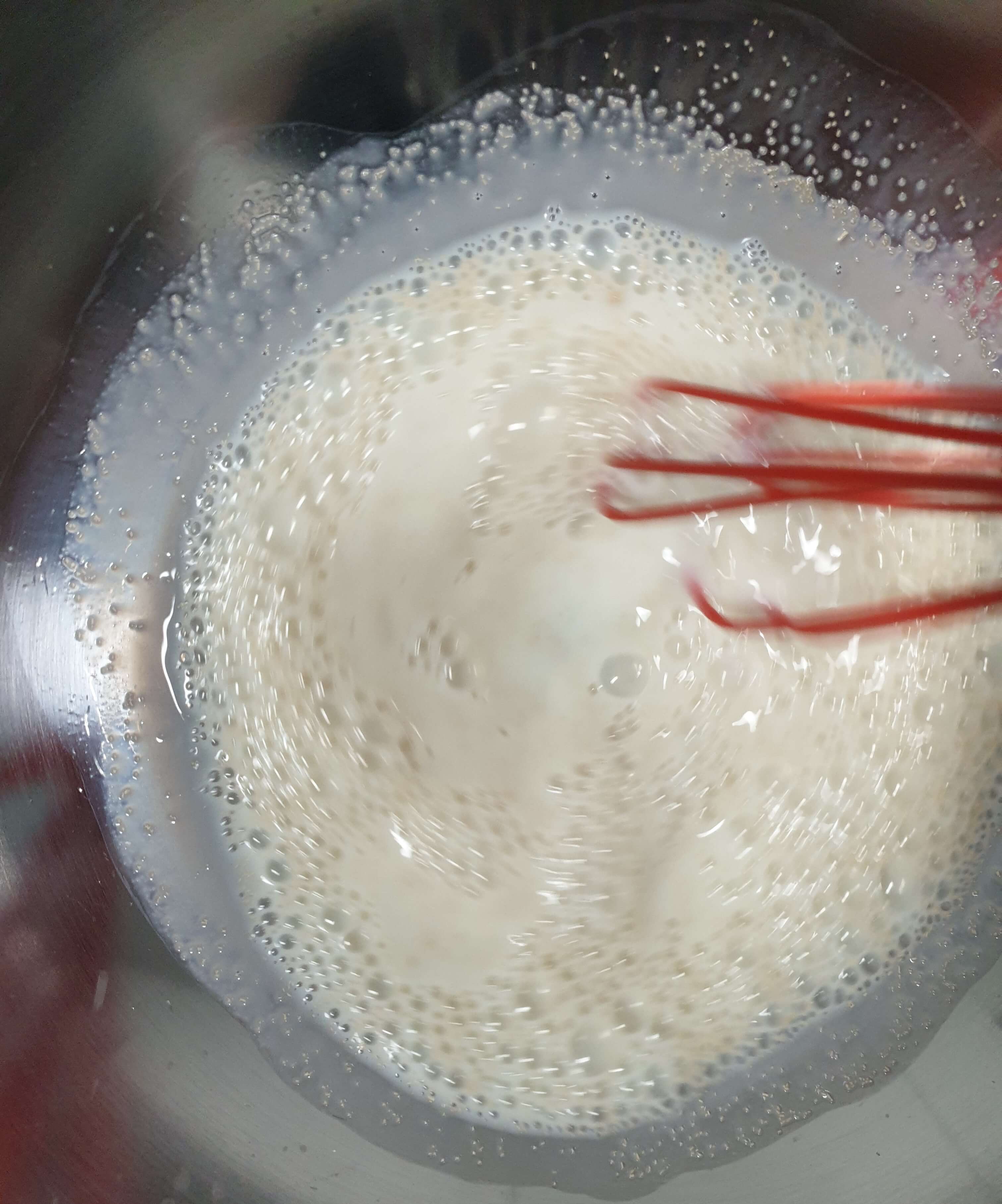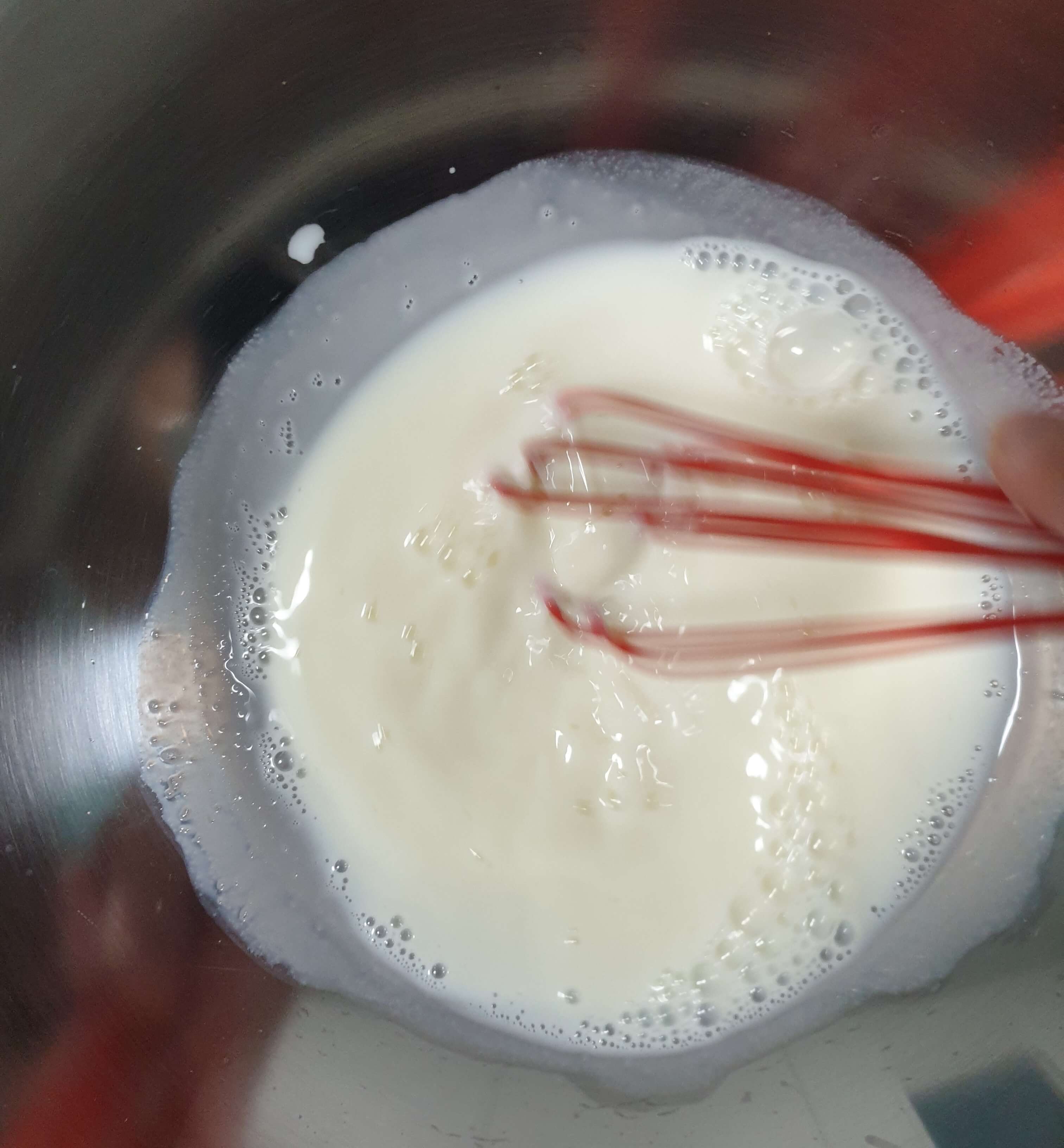 반만 먼저 넣어 휘스크로 저어 주세요.