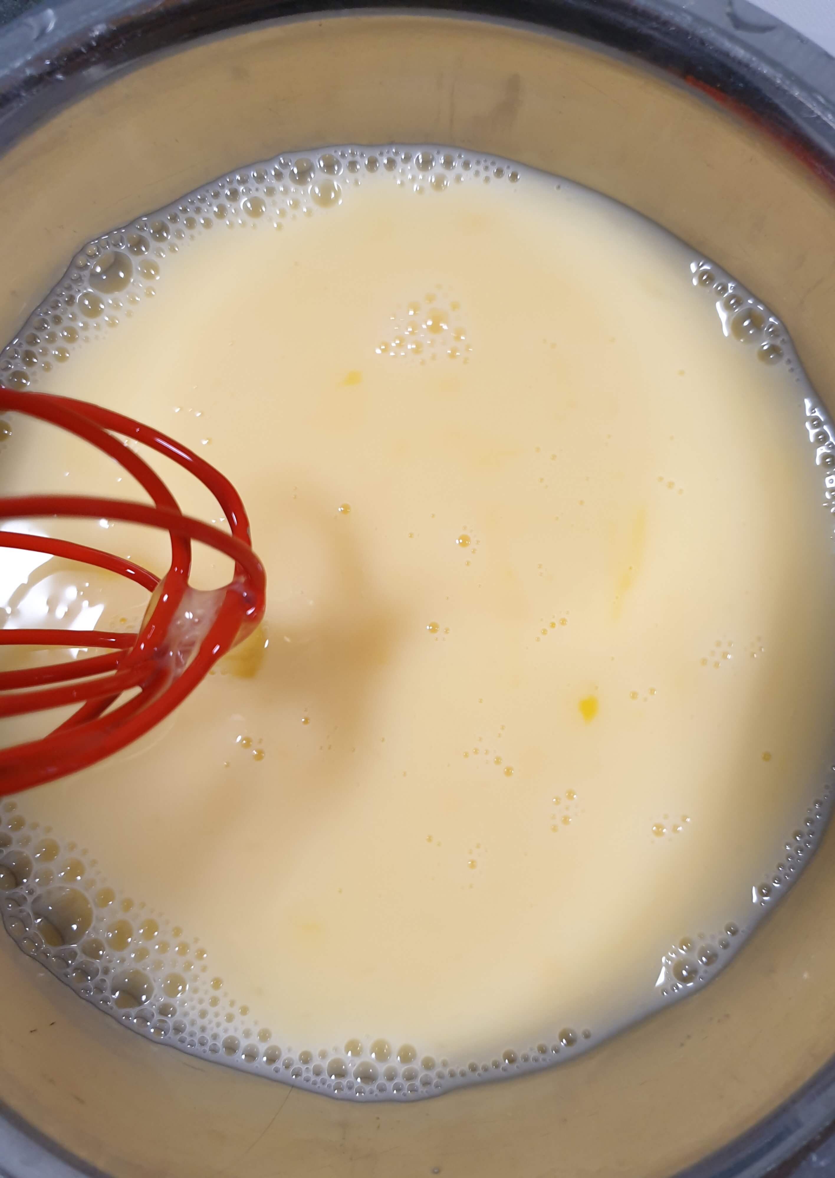 계란을 채에 걸러 알끈을 제거해 줍니다.