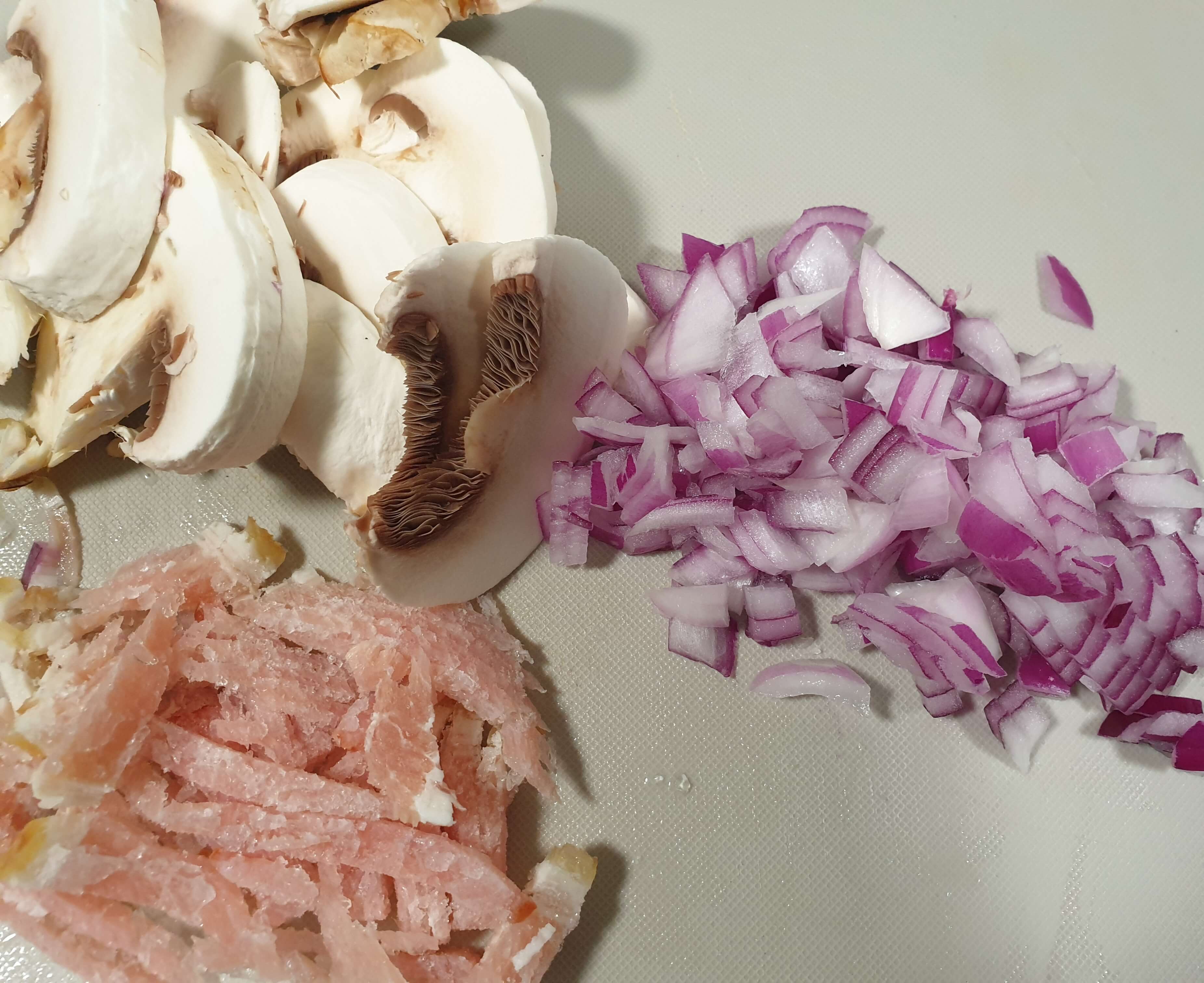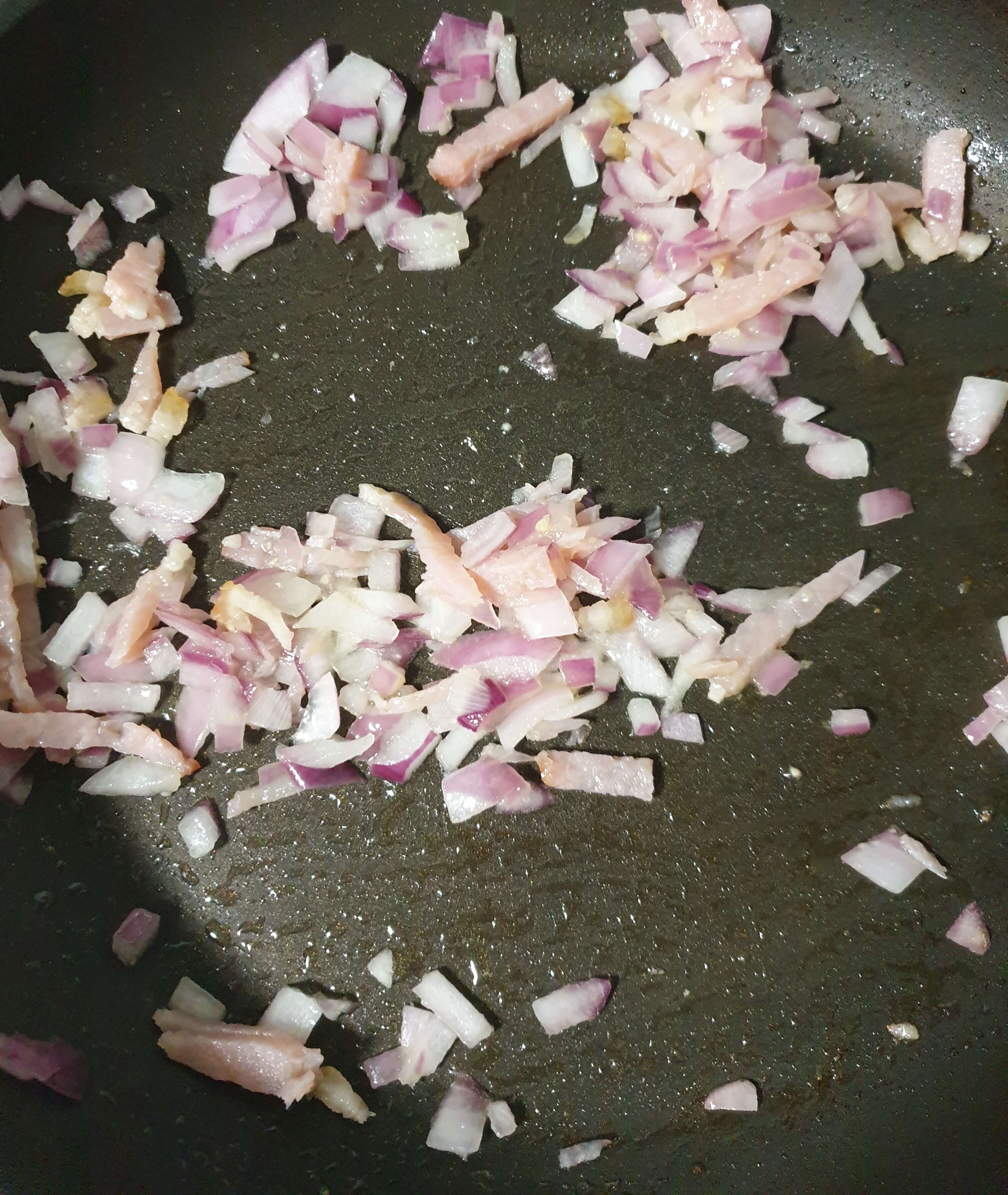 썰어 놓은 양파와 베이컨을 볶아 주세요.