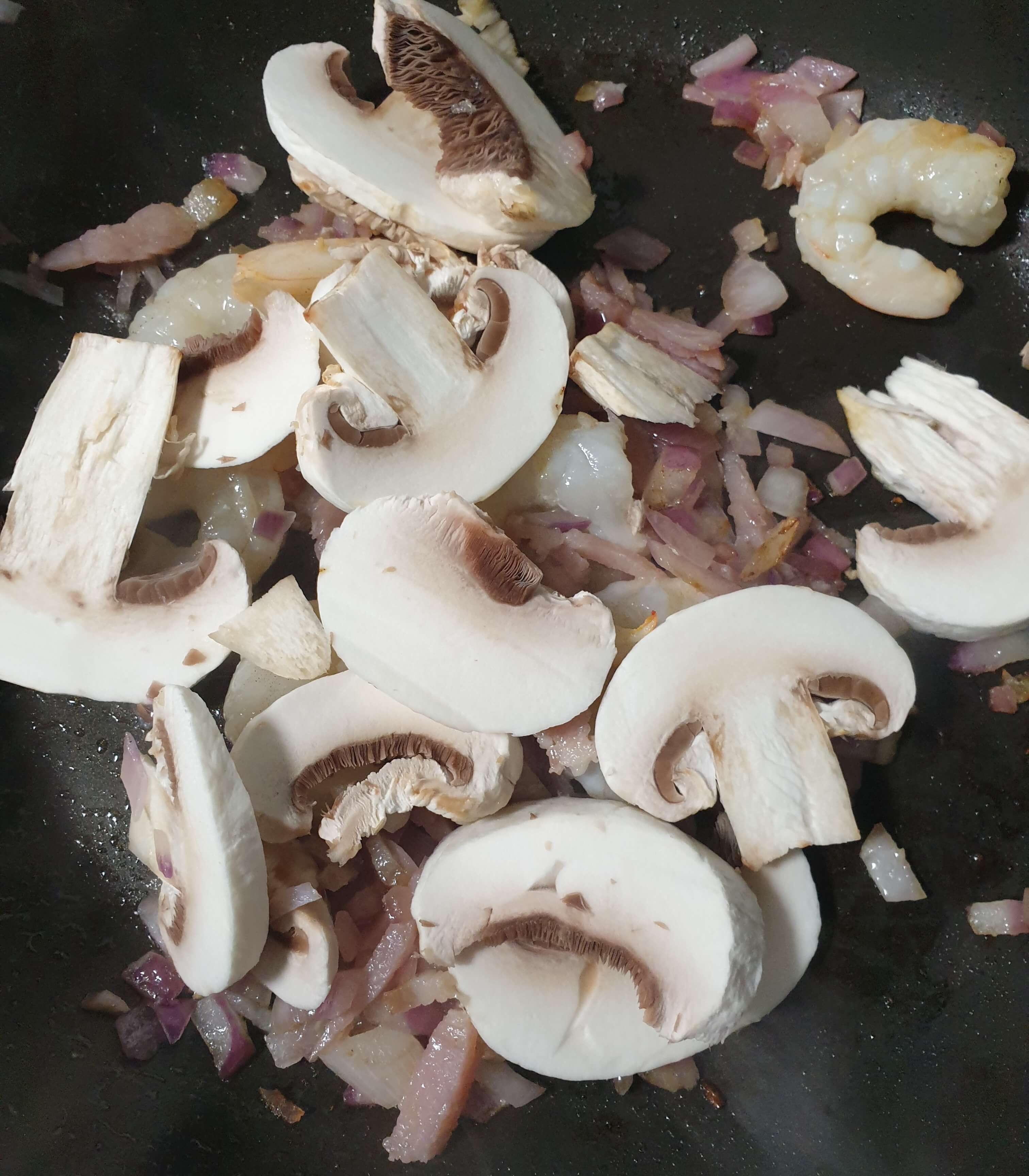 양송이버섯도 넣고 볶아 주세요. (중 약불)