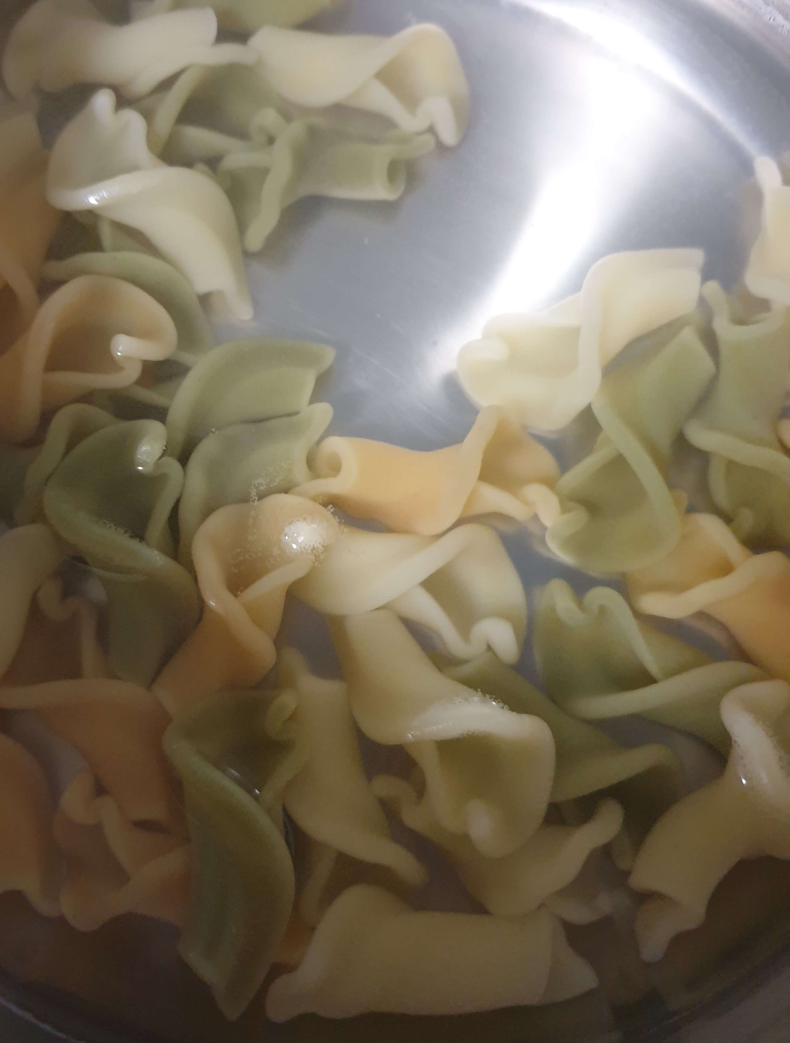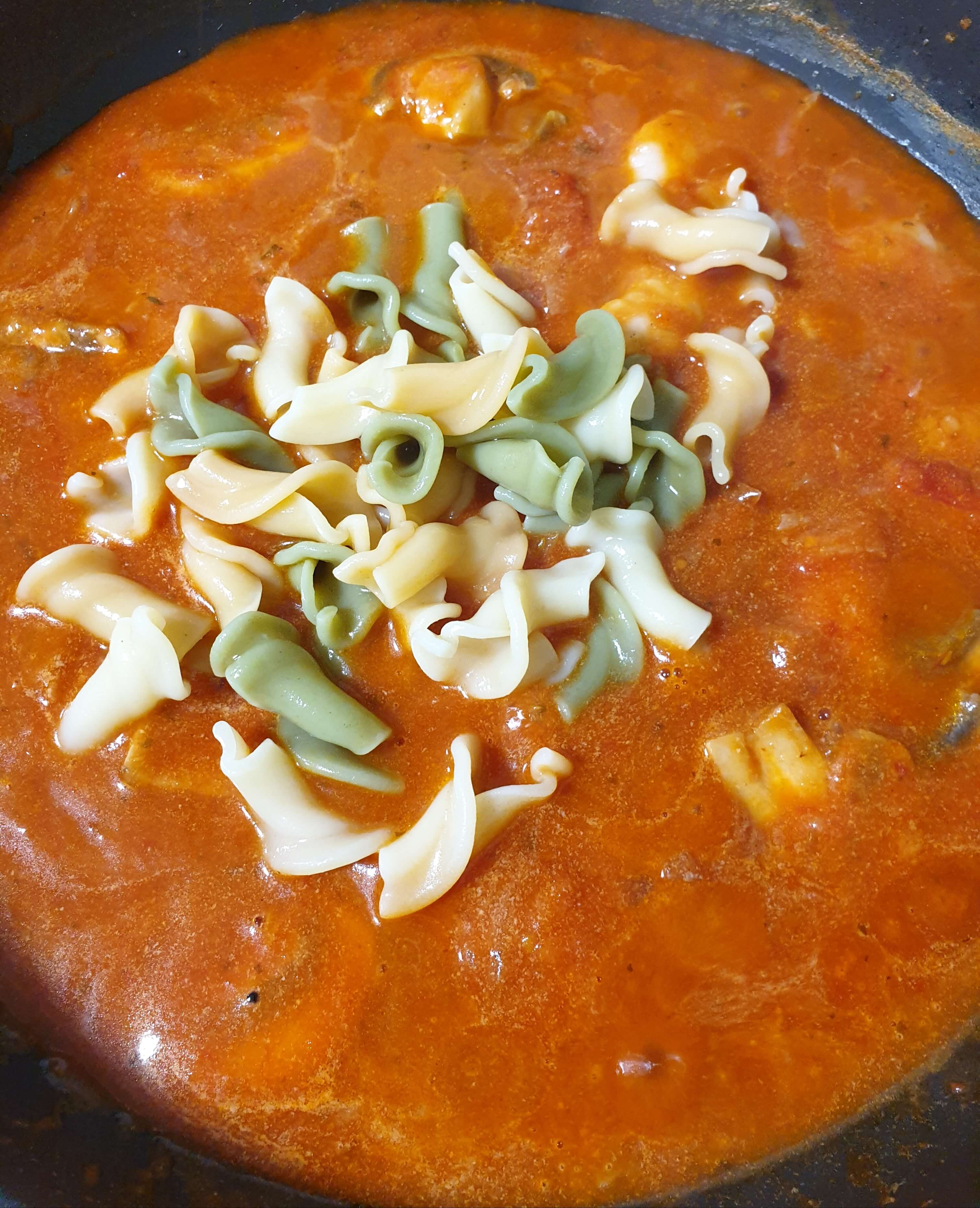 한쪽에는 파스타도 한 줌 삶아 줬어요.