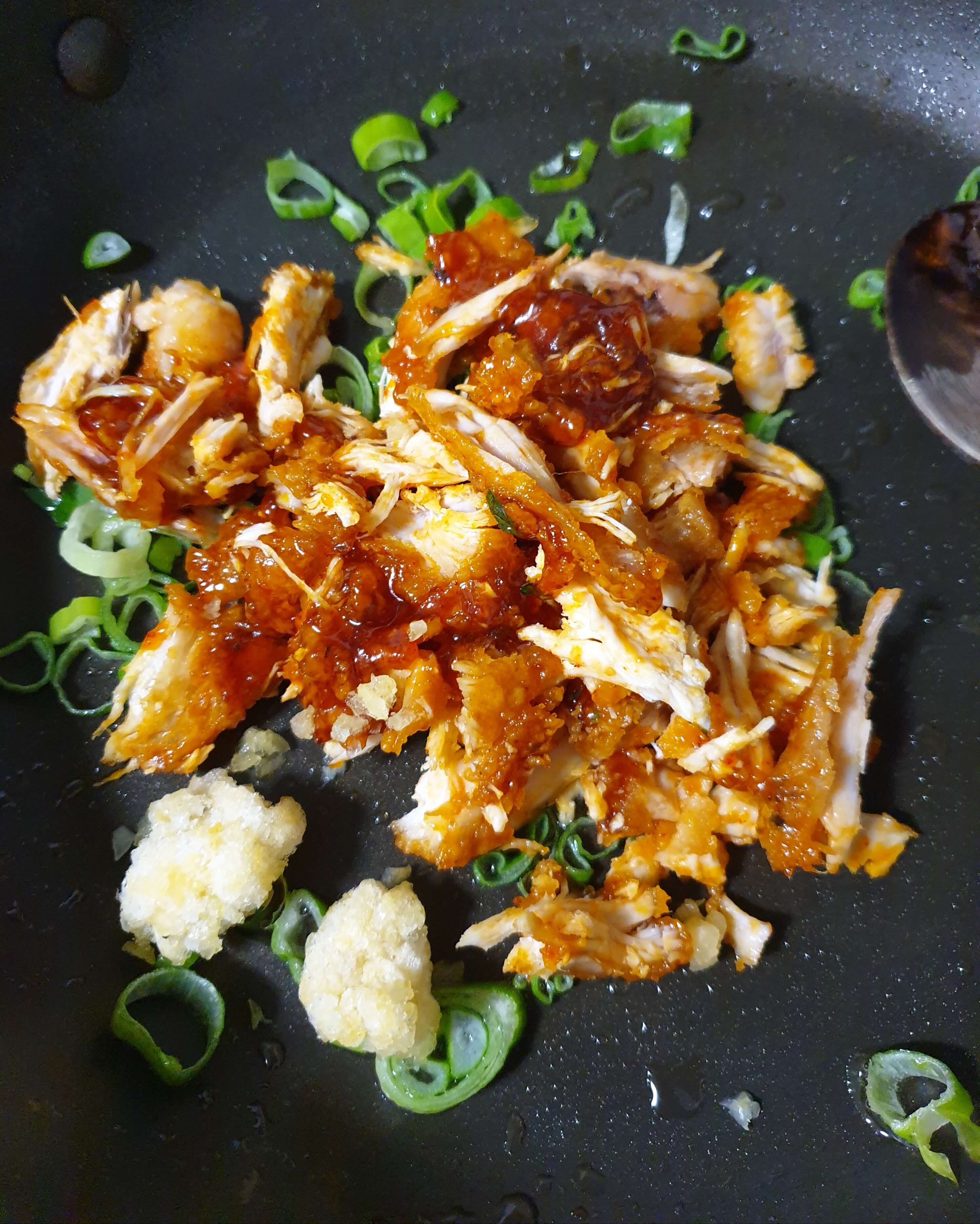 결대로 찢은 양념치킨(두 조각)을 넣어 줍니다.