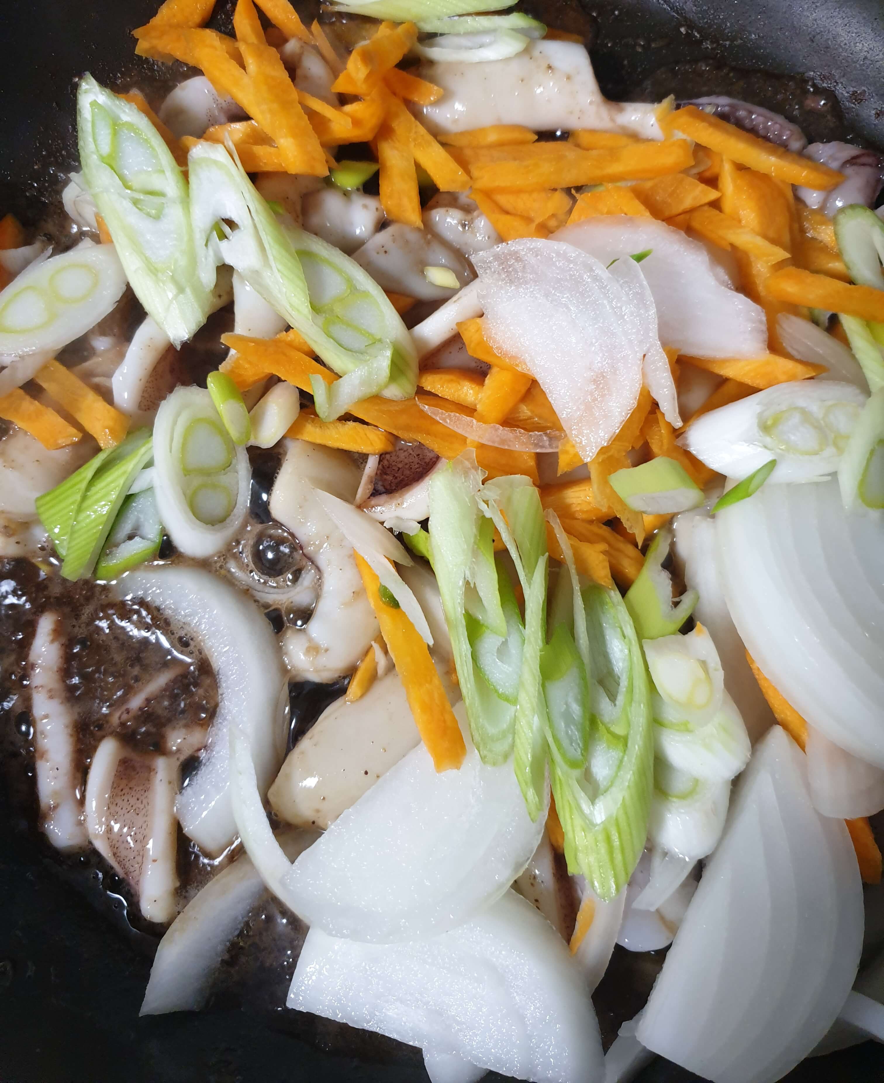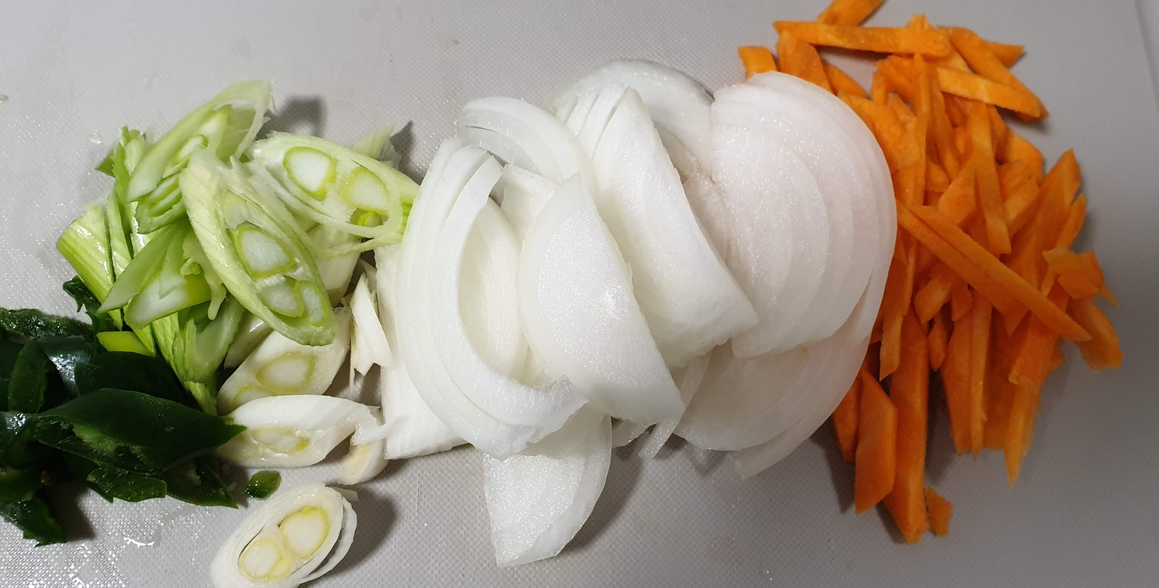 당근, 양파, 대파, 청양고추를 썰어서 준비해 주세요.