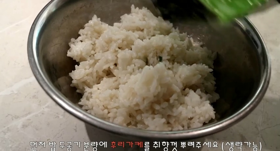 밥 두 공기 정도 양에 후리가케를 뿌려주세요.