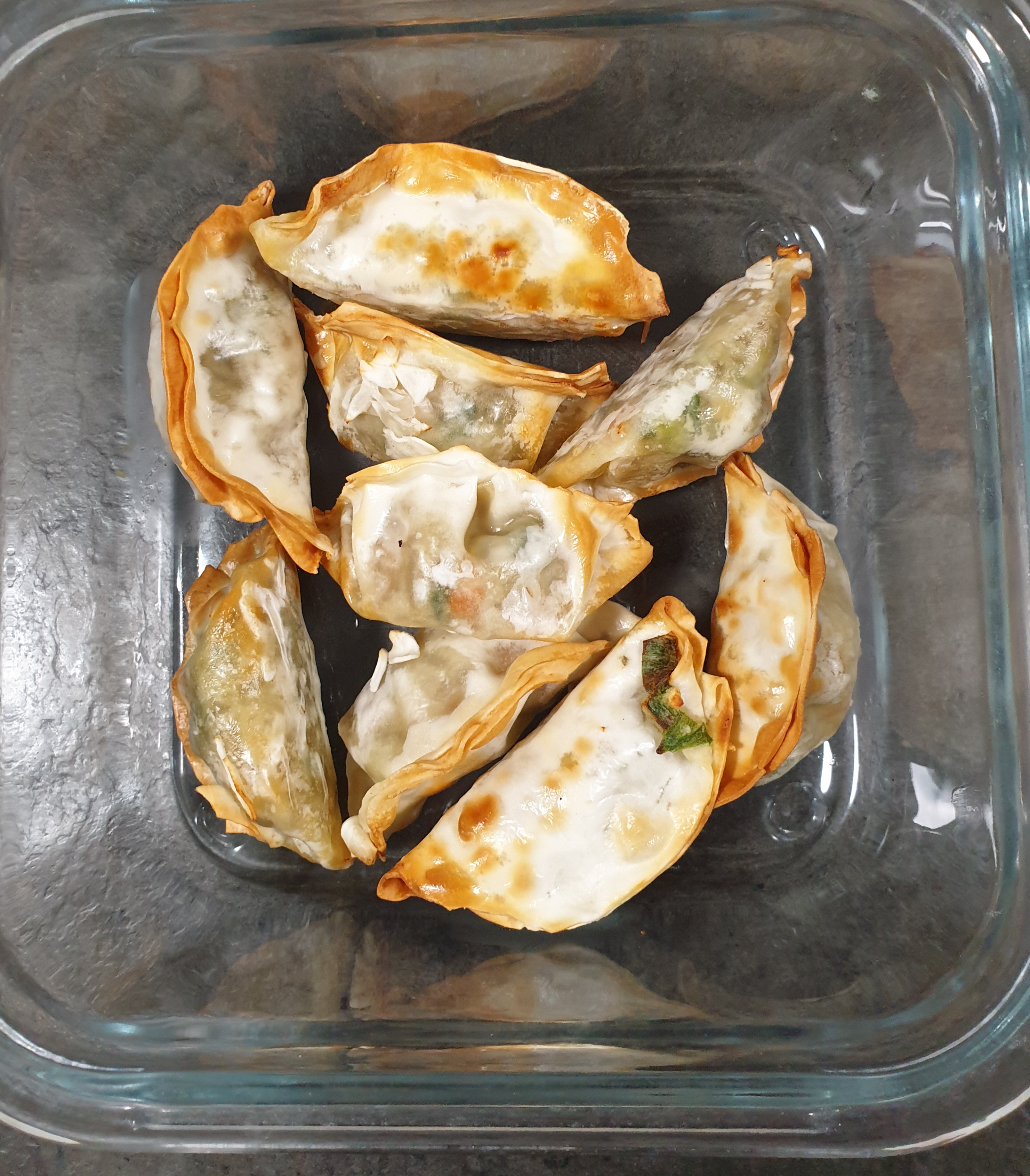 오븐용 용기에 잘 구워진 만두를 담고