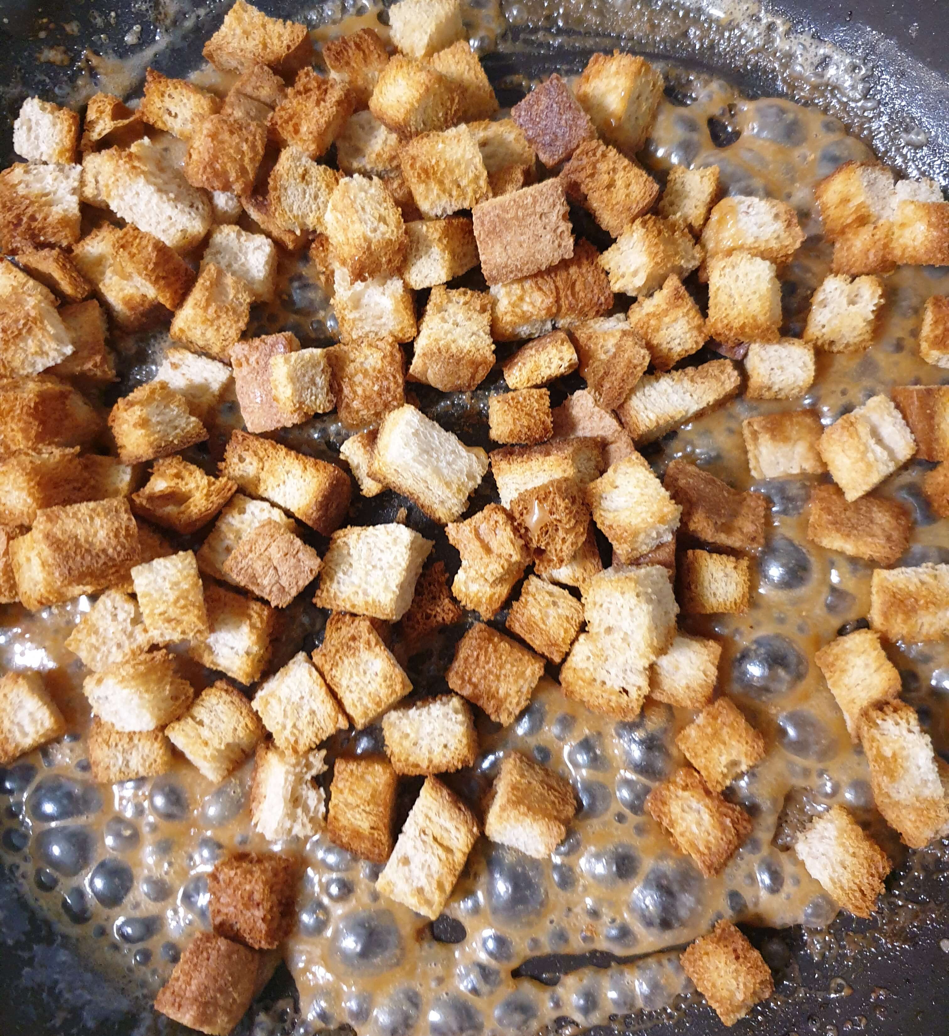 불 끄고 바로 빵을 넣어 섞어 줍니다.