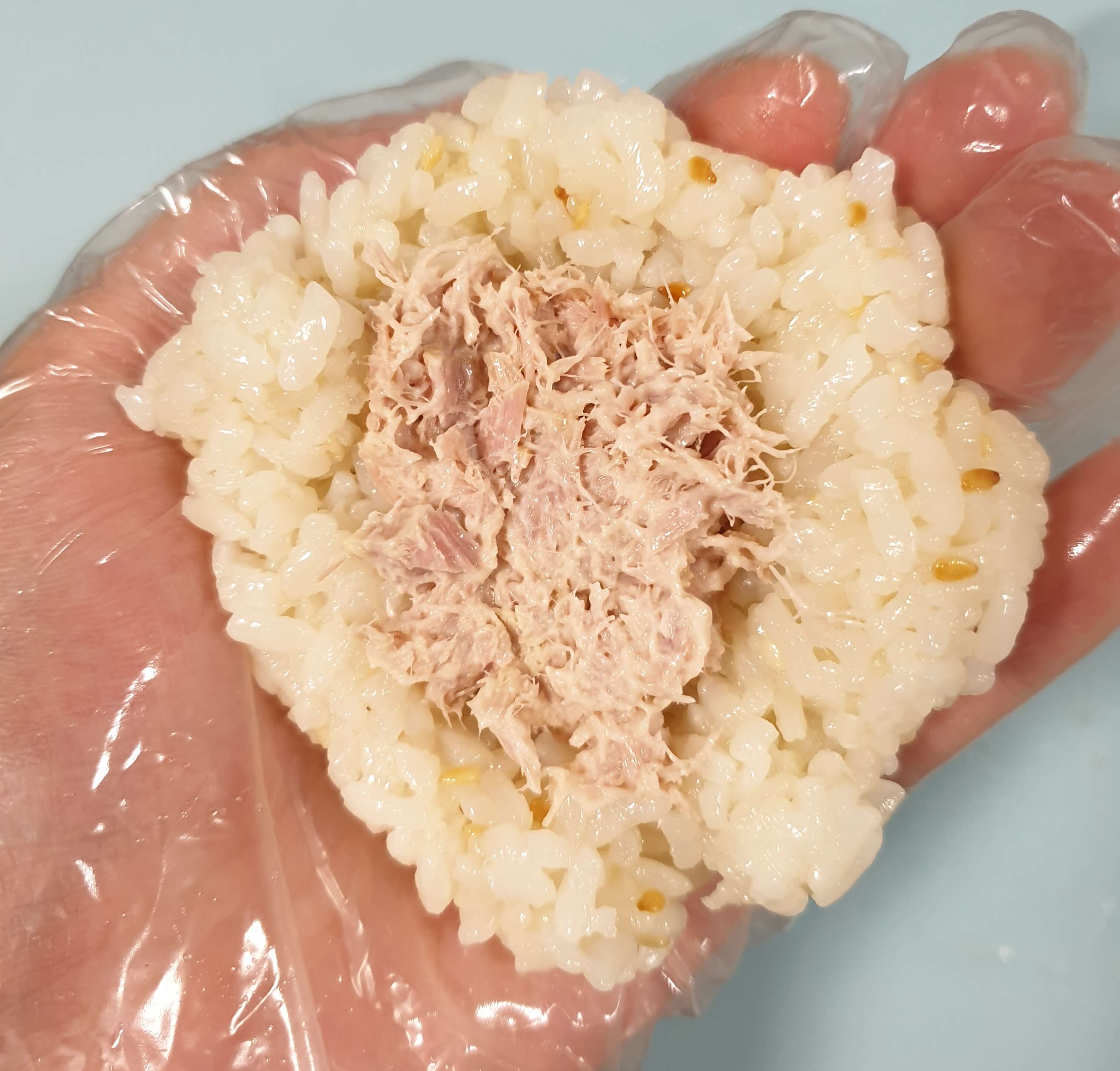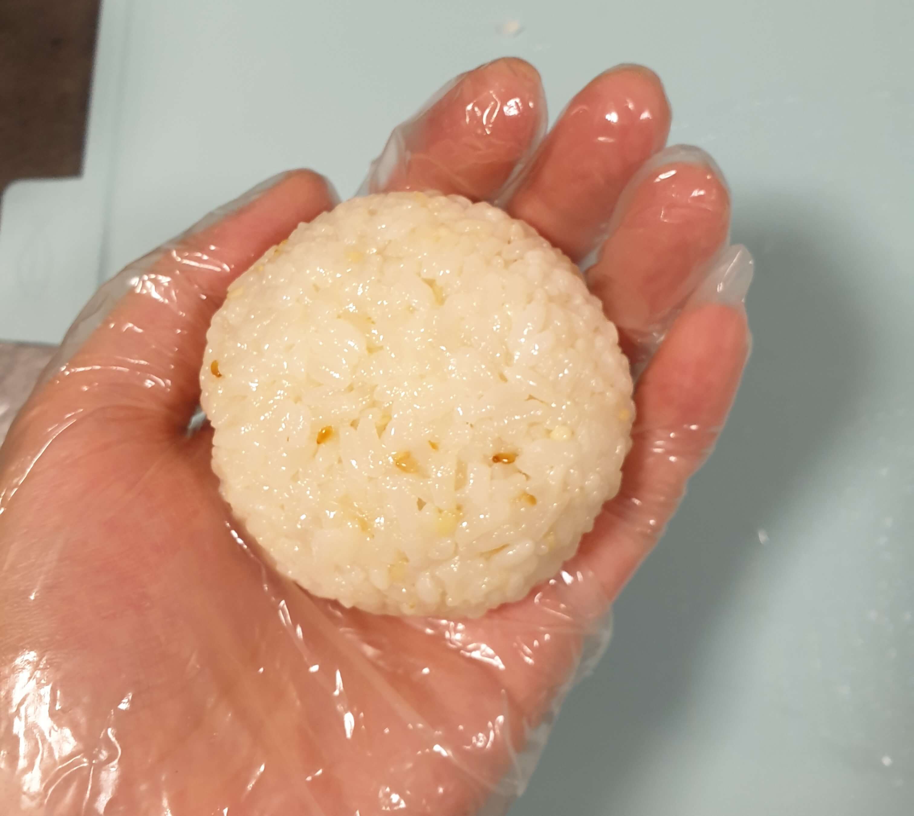 장갑에 물을 살짝 묻히고 밥을 한주먹 동그랗게 뭉쳐주세요.