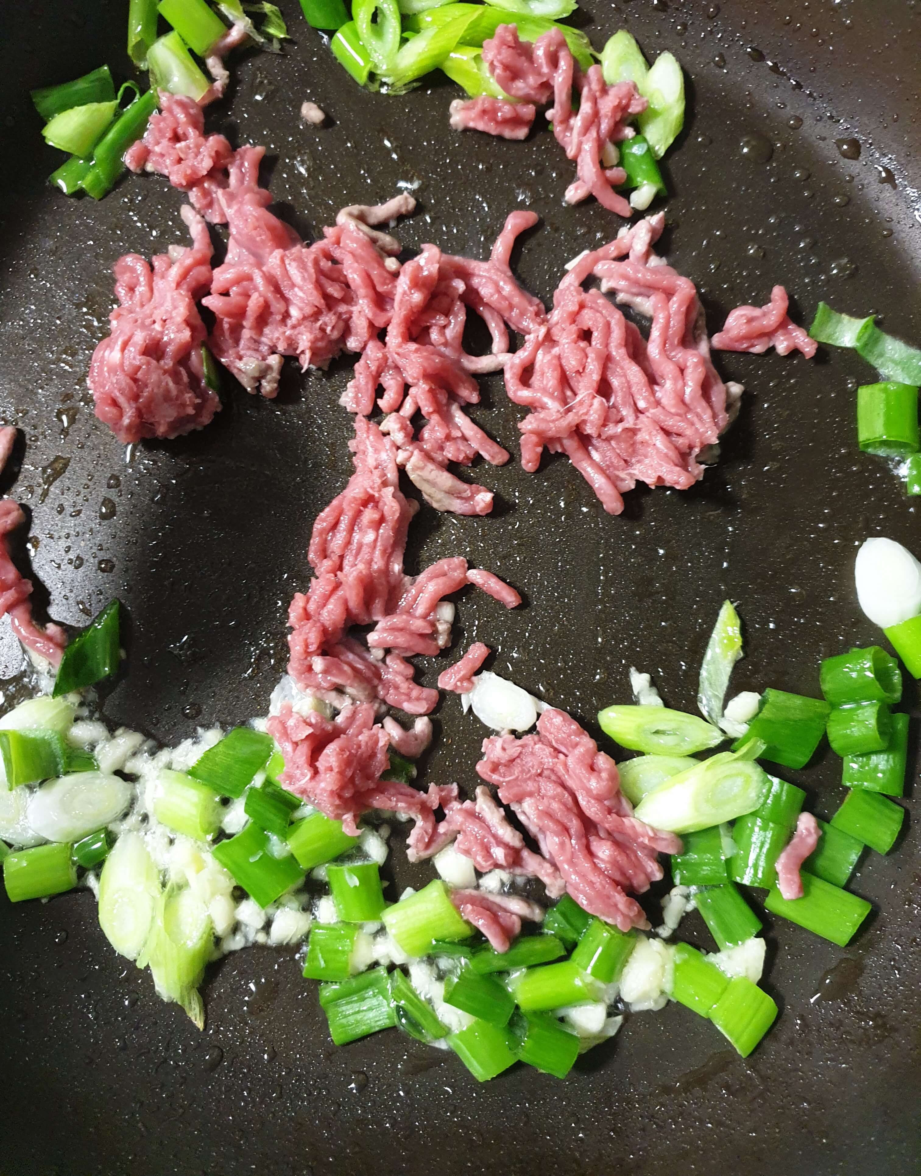 다진 고기 50g~100g 정도를 넣고 볶아주세요.