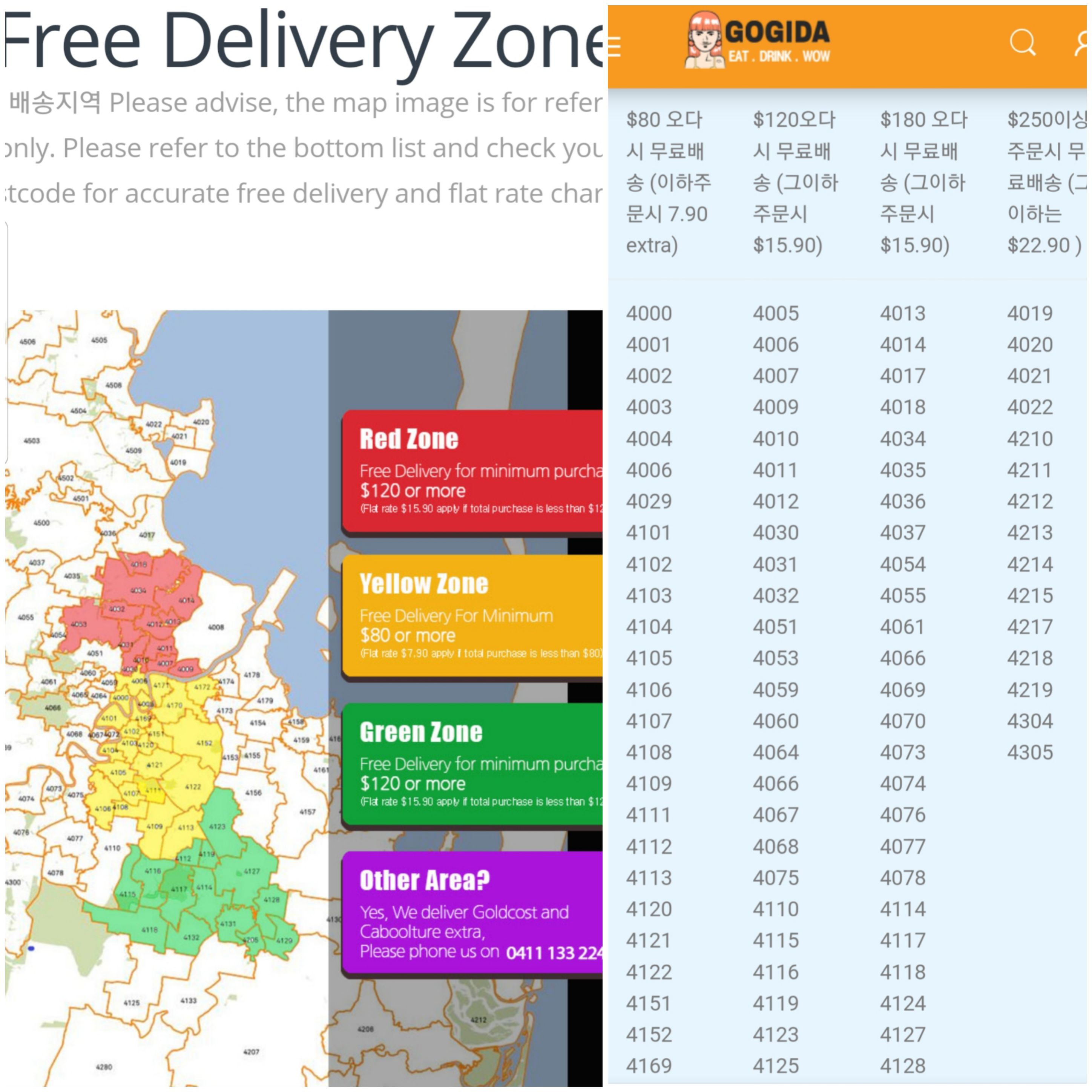 표시된 존 안에 없으면 우편번호로 얼마이상 인지 알 수 있어요