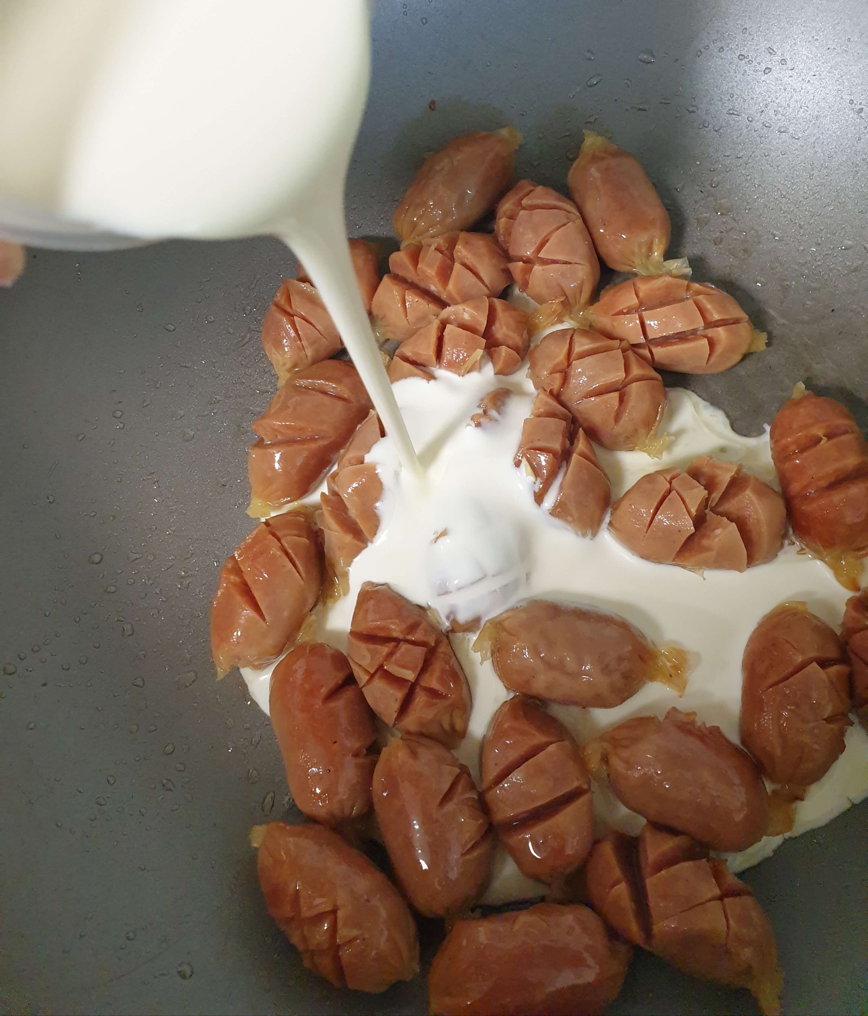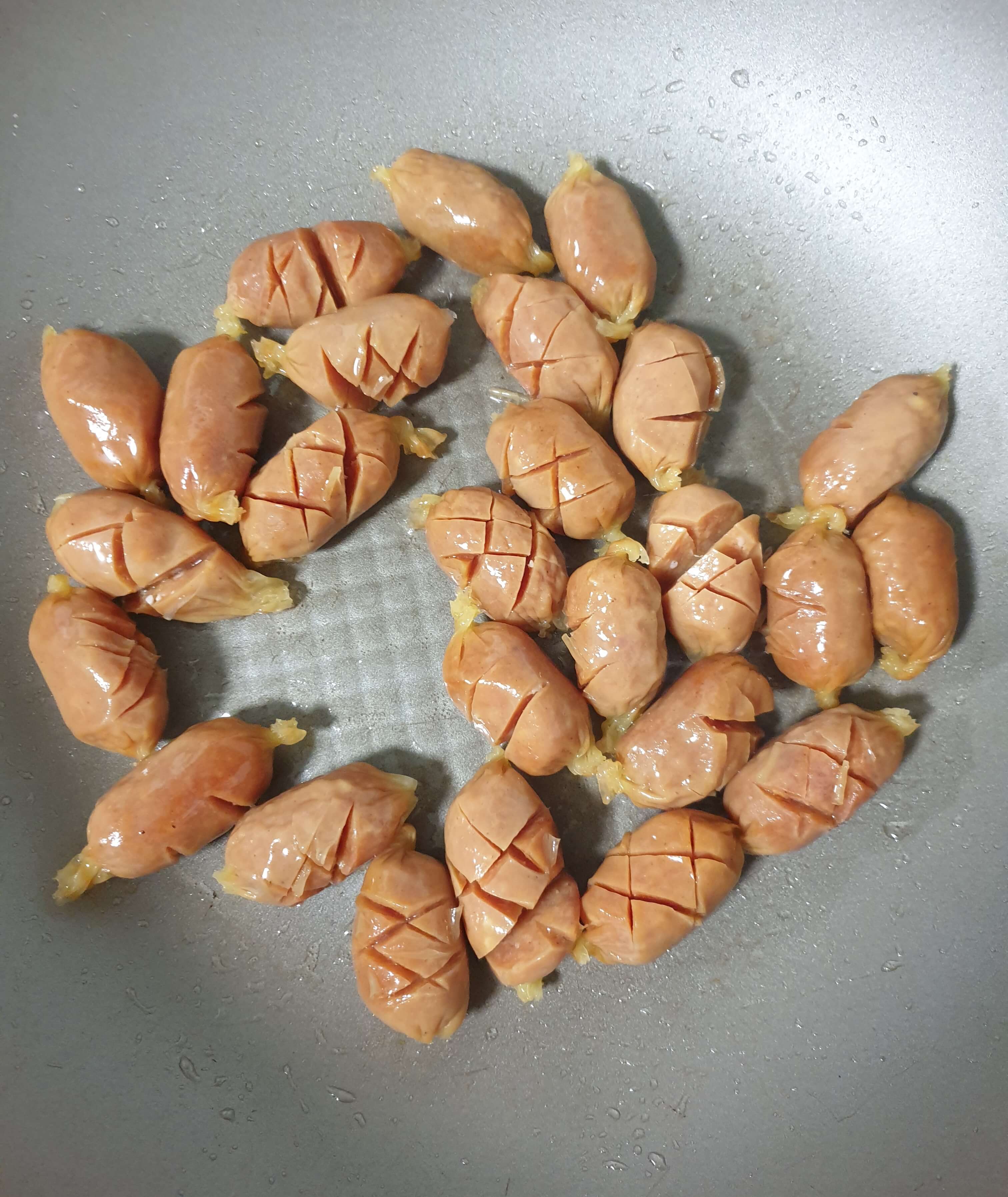 기름을 두른 팬에 칼집 낸 비엔나 소시지와