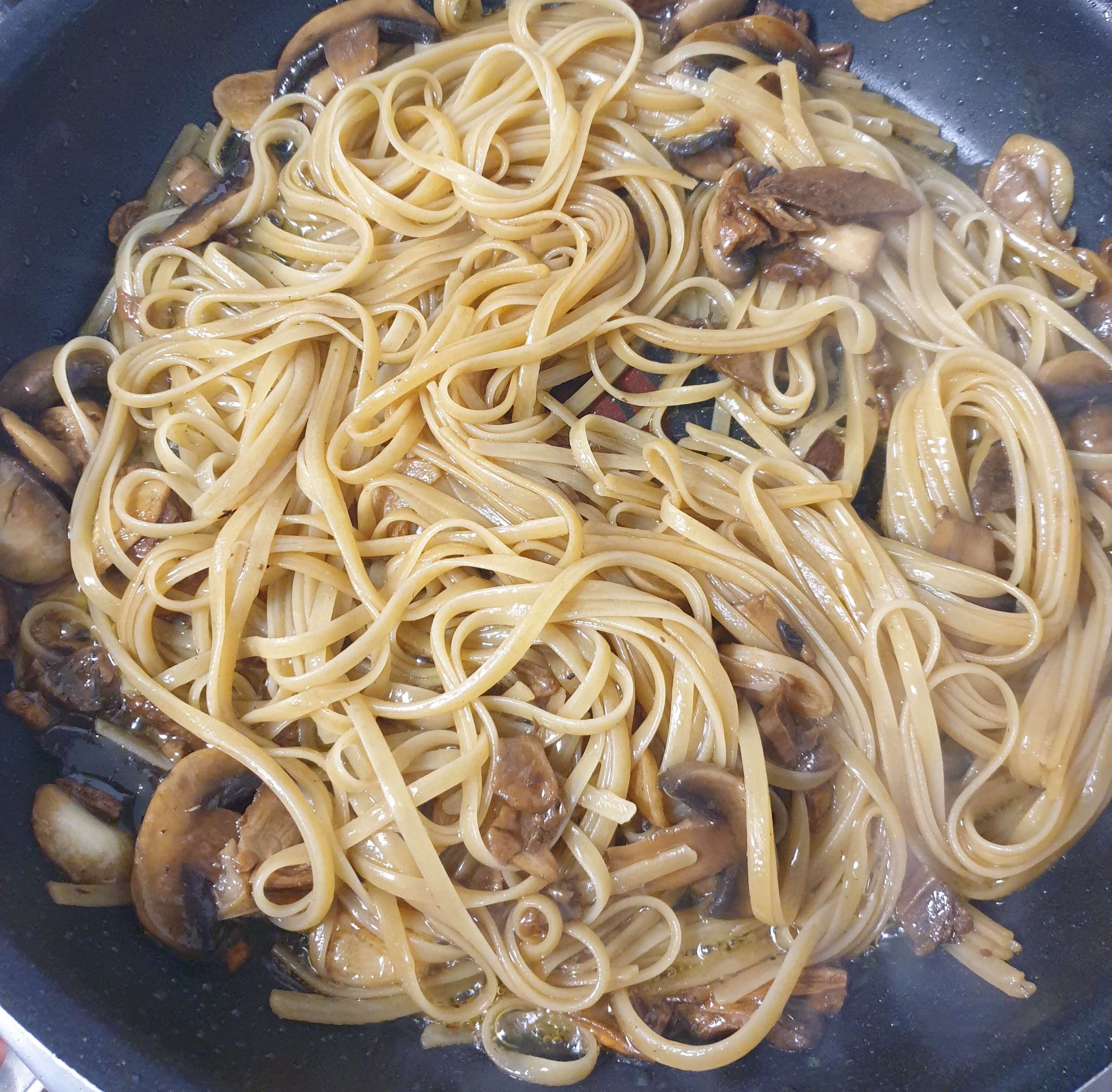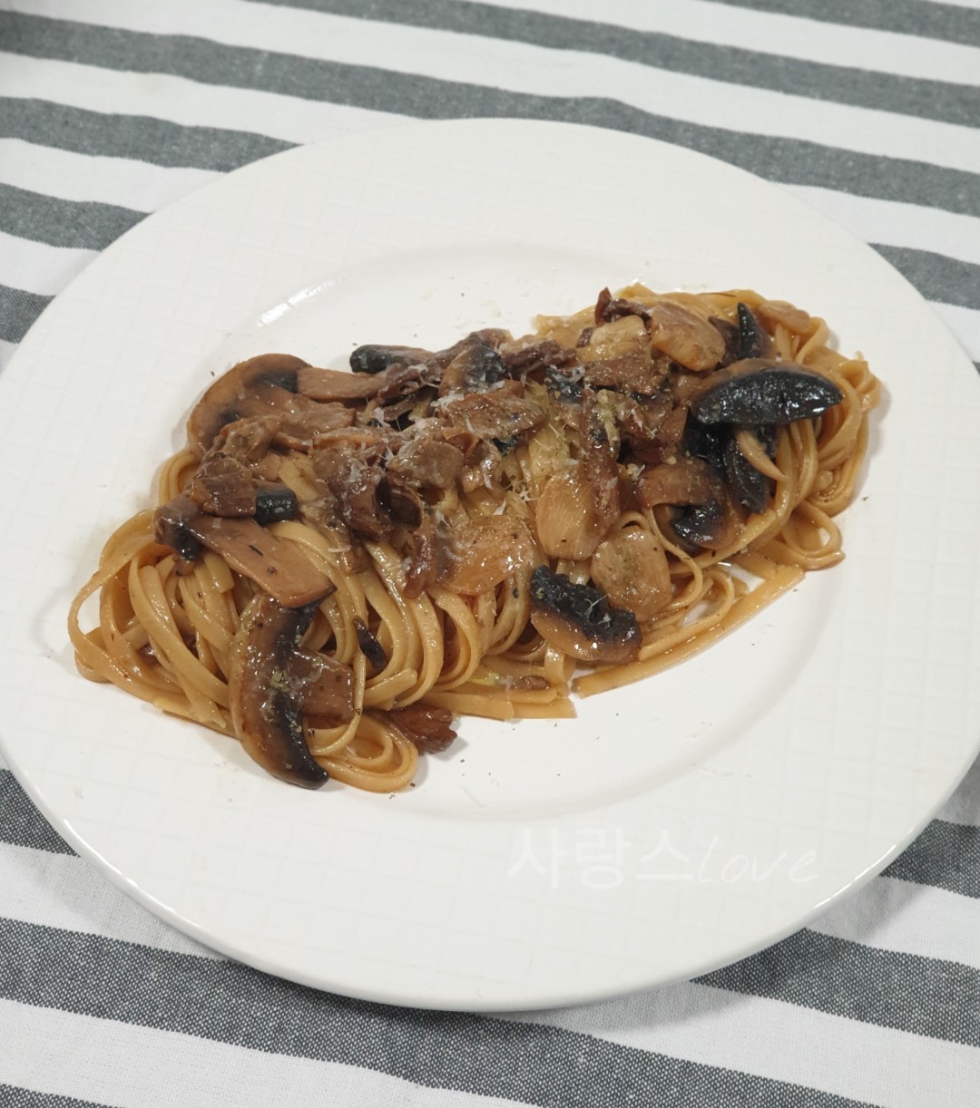버섯 소스 때문에 면의 색이 금방 진하게 변했어요.