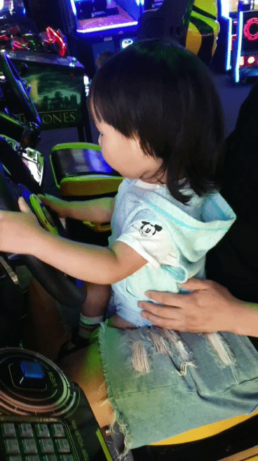 아기는 옆에 딸린 작은 오락실에서 운전 연습 중?
