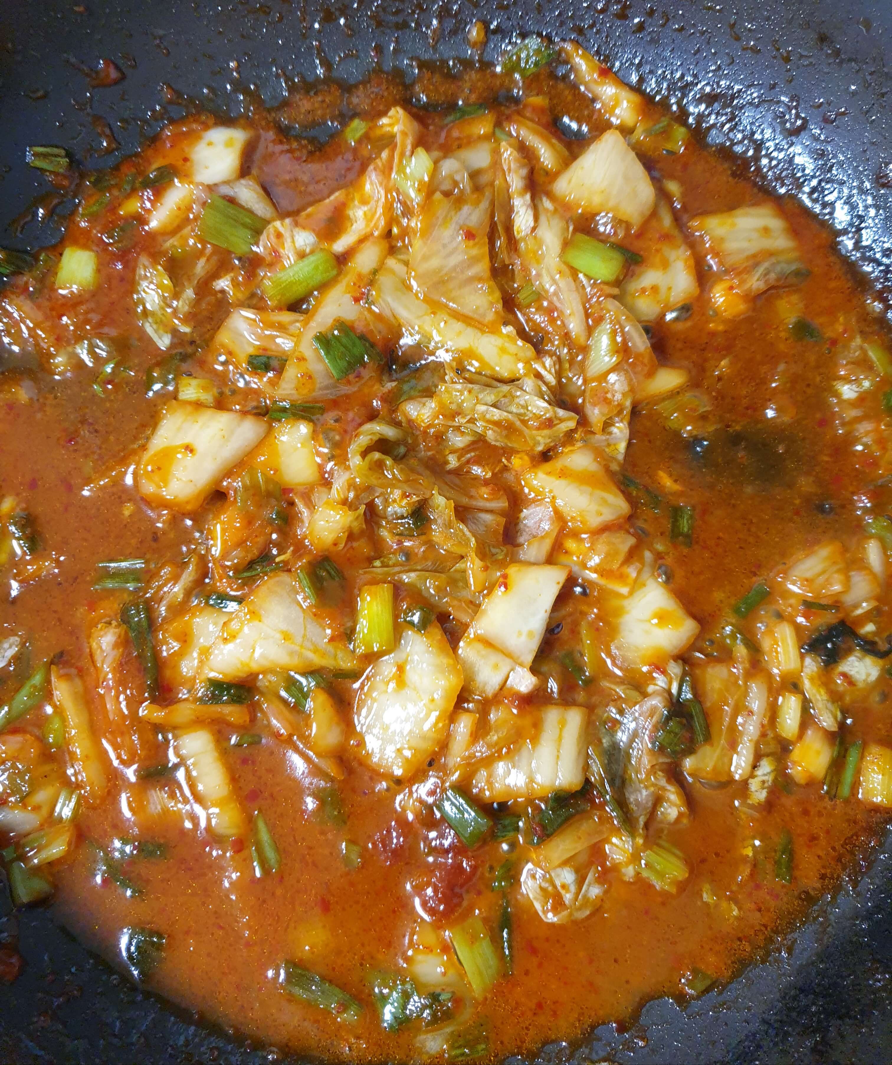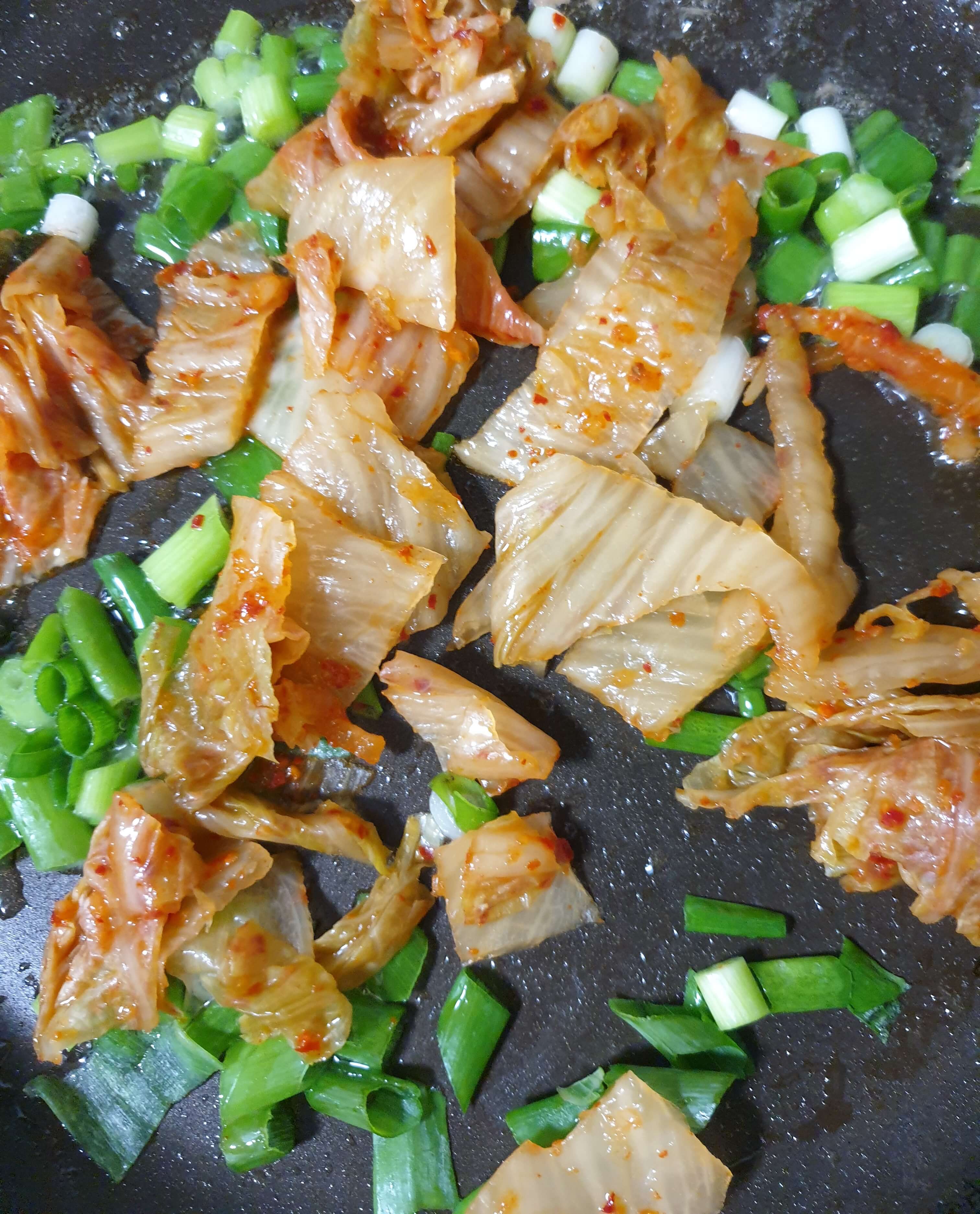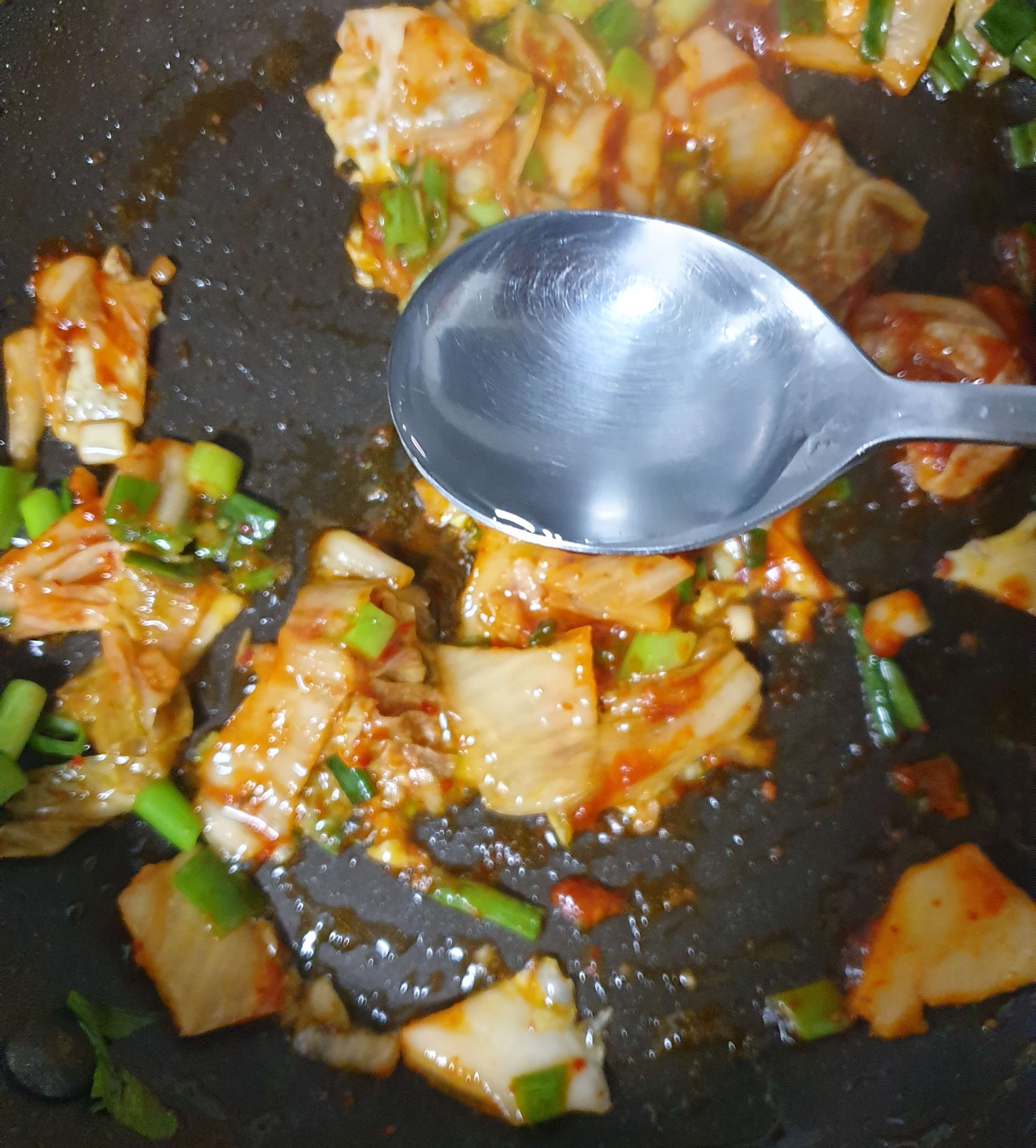 김치 80~90g을 넣고 함께 볶아 줍니다.