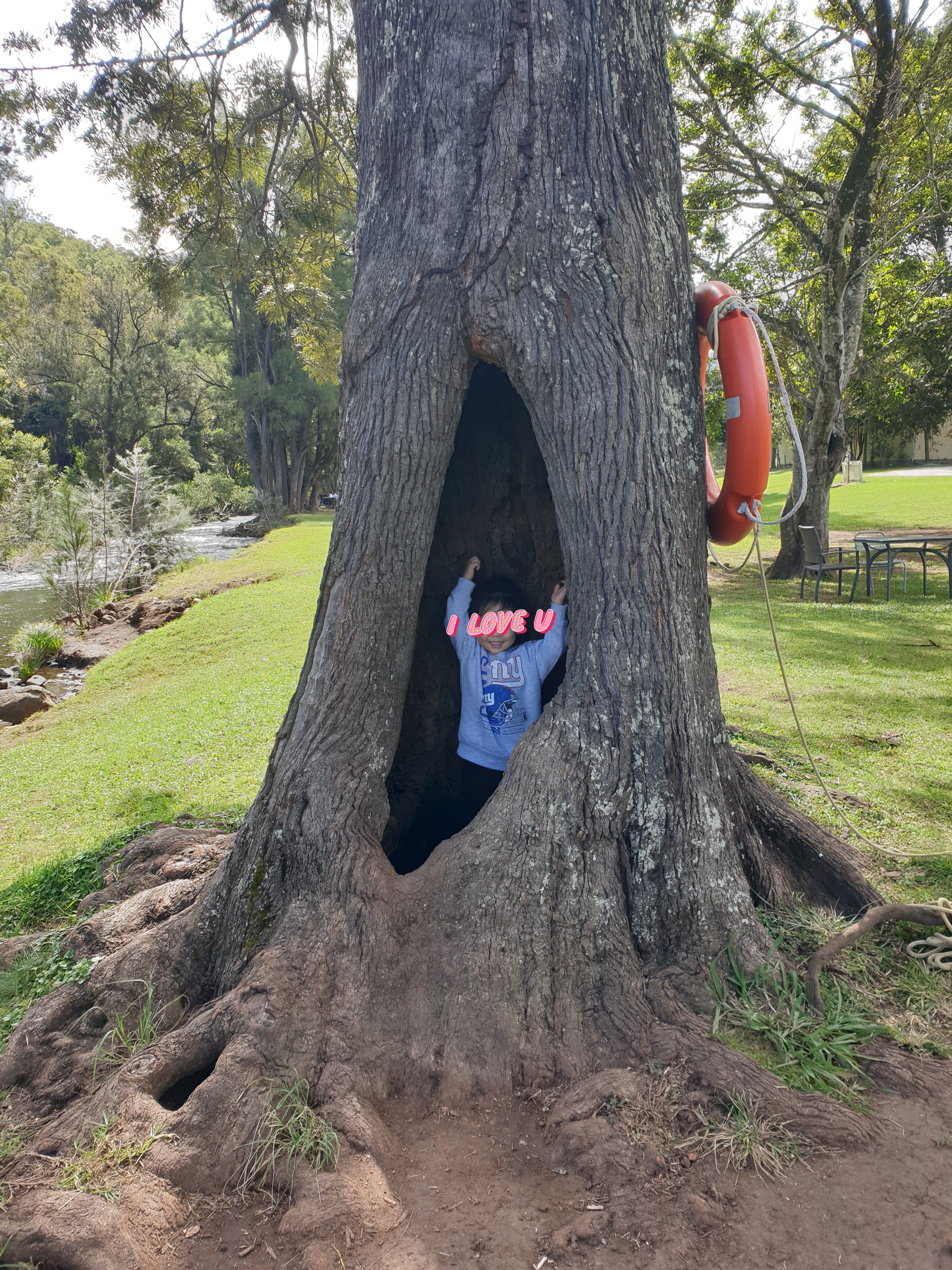 아이는 어느새 나무에 쏘~옥 들어갔다가 다른 사람들 피자 먹는 테이블에 자연스럽게 착석하고...
