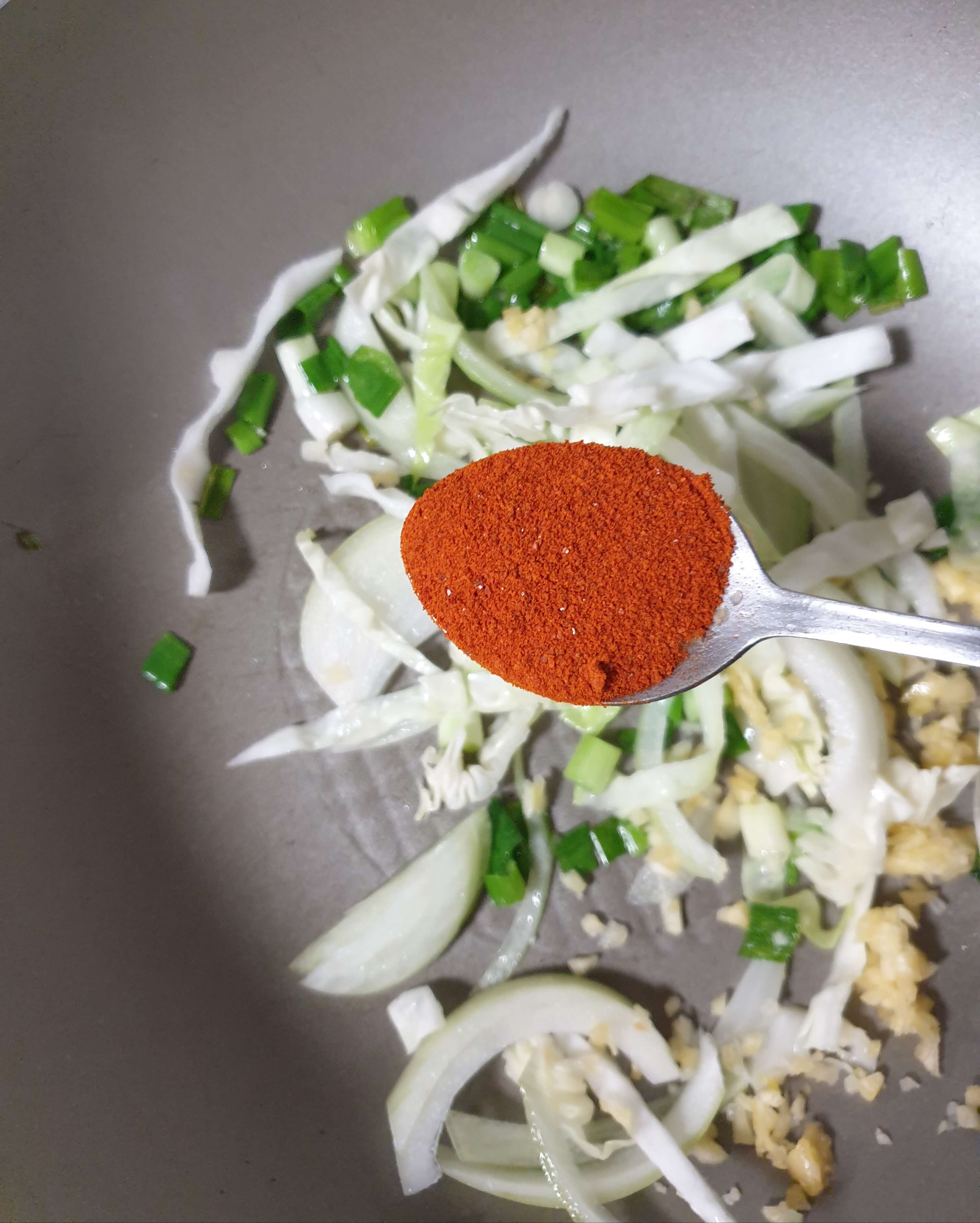 고춧가루 1큰술을 넣고 볶아 줍니다.