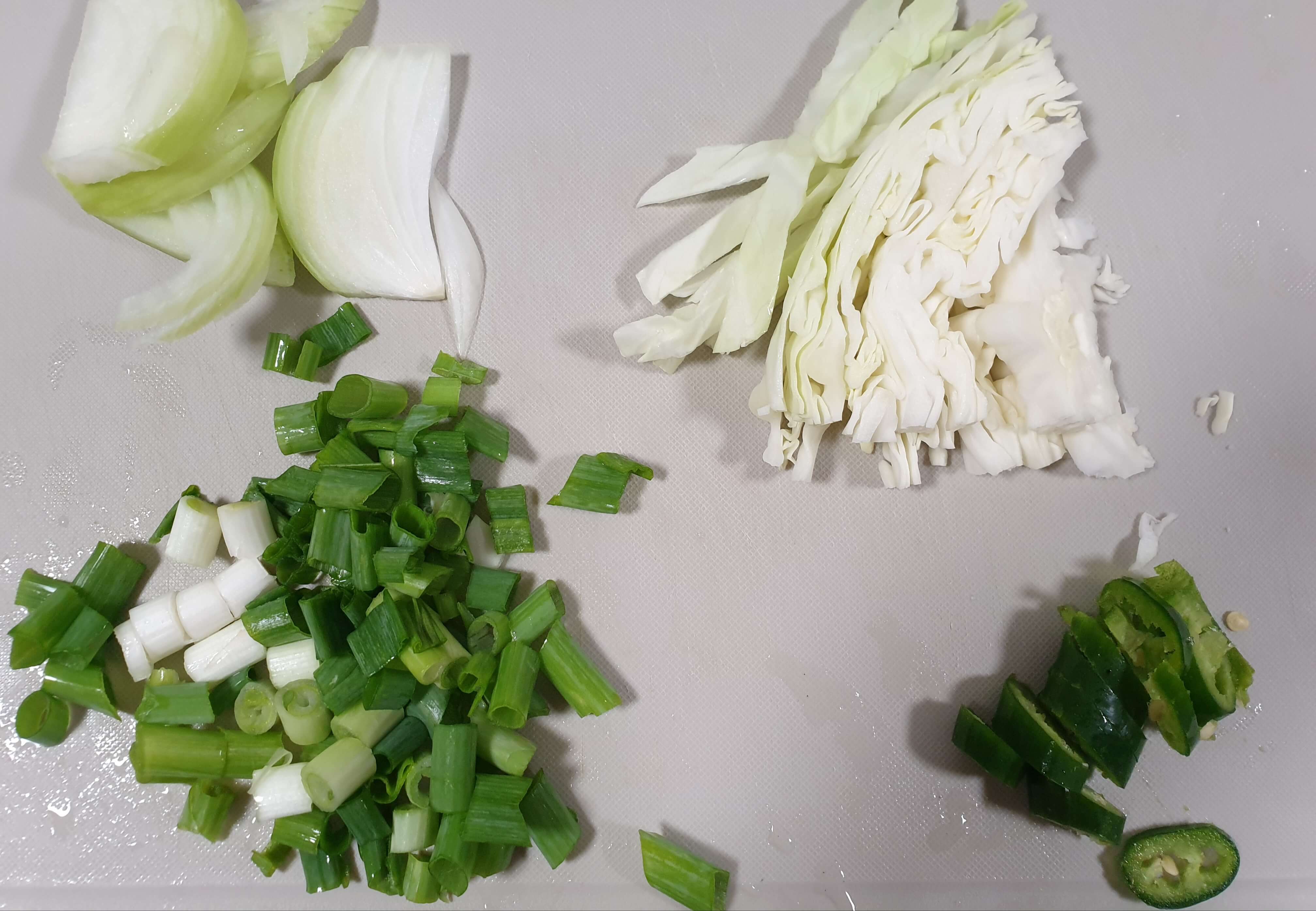 썰어놓은 양배추와 양파를 볶아 주세요.