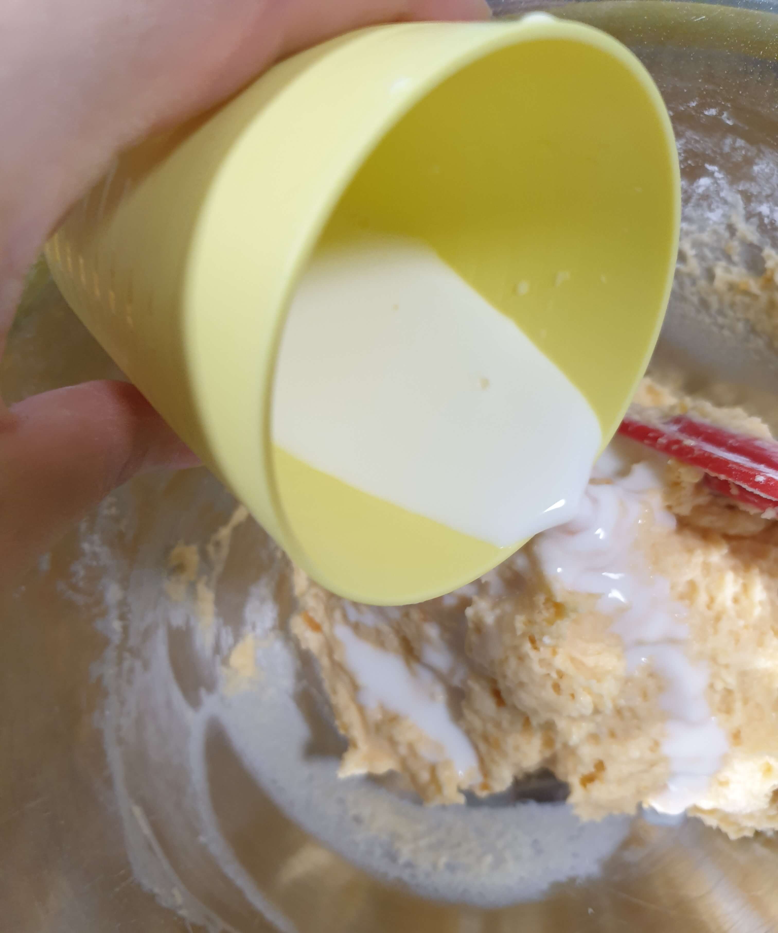 우유를 넣어 크림을 묽게 만들어 주세요.