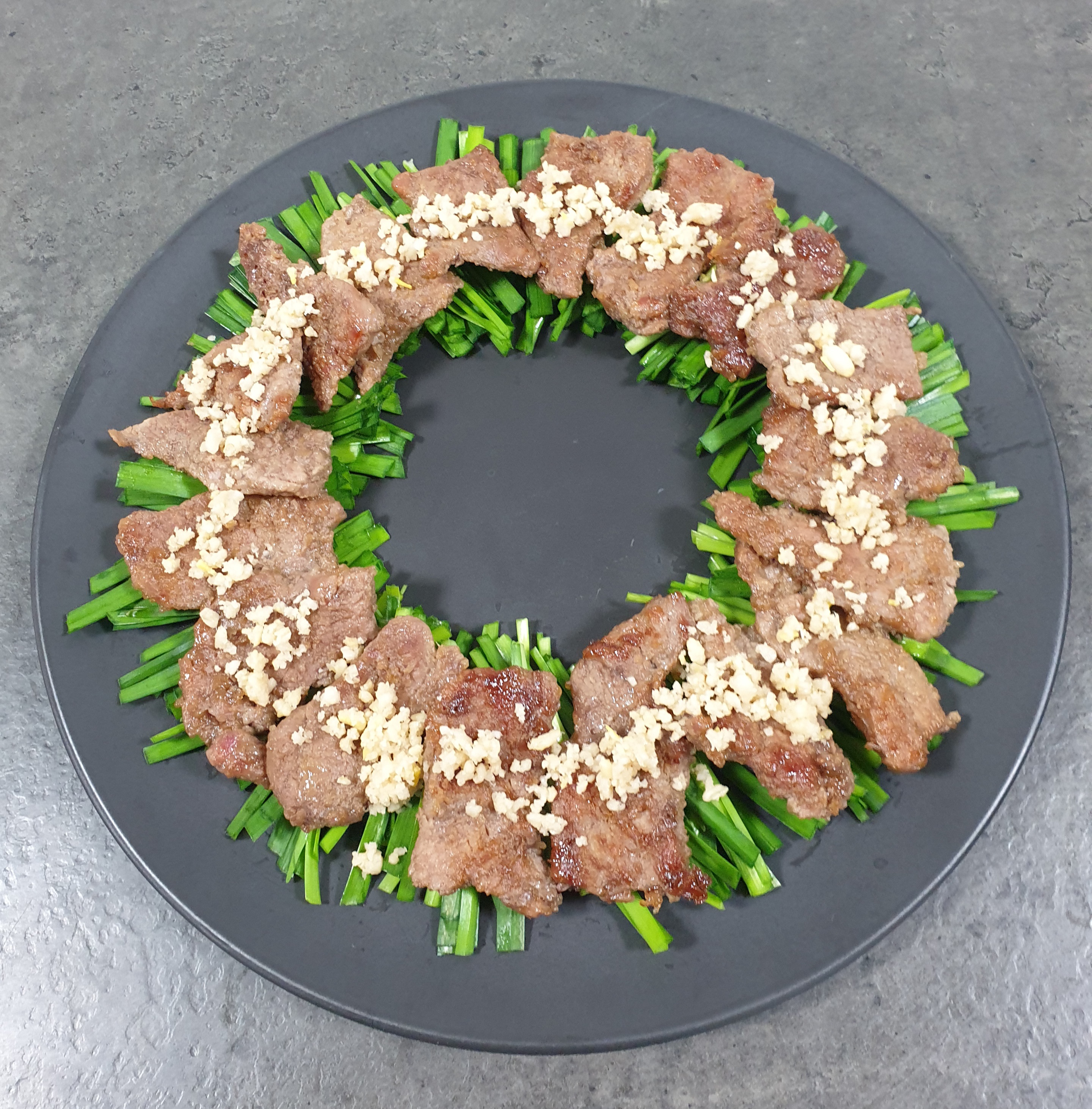 잘 익은 고기를 부추 위에 올리고