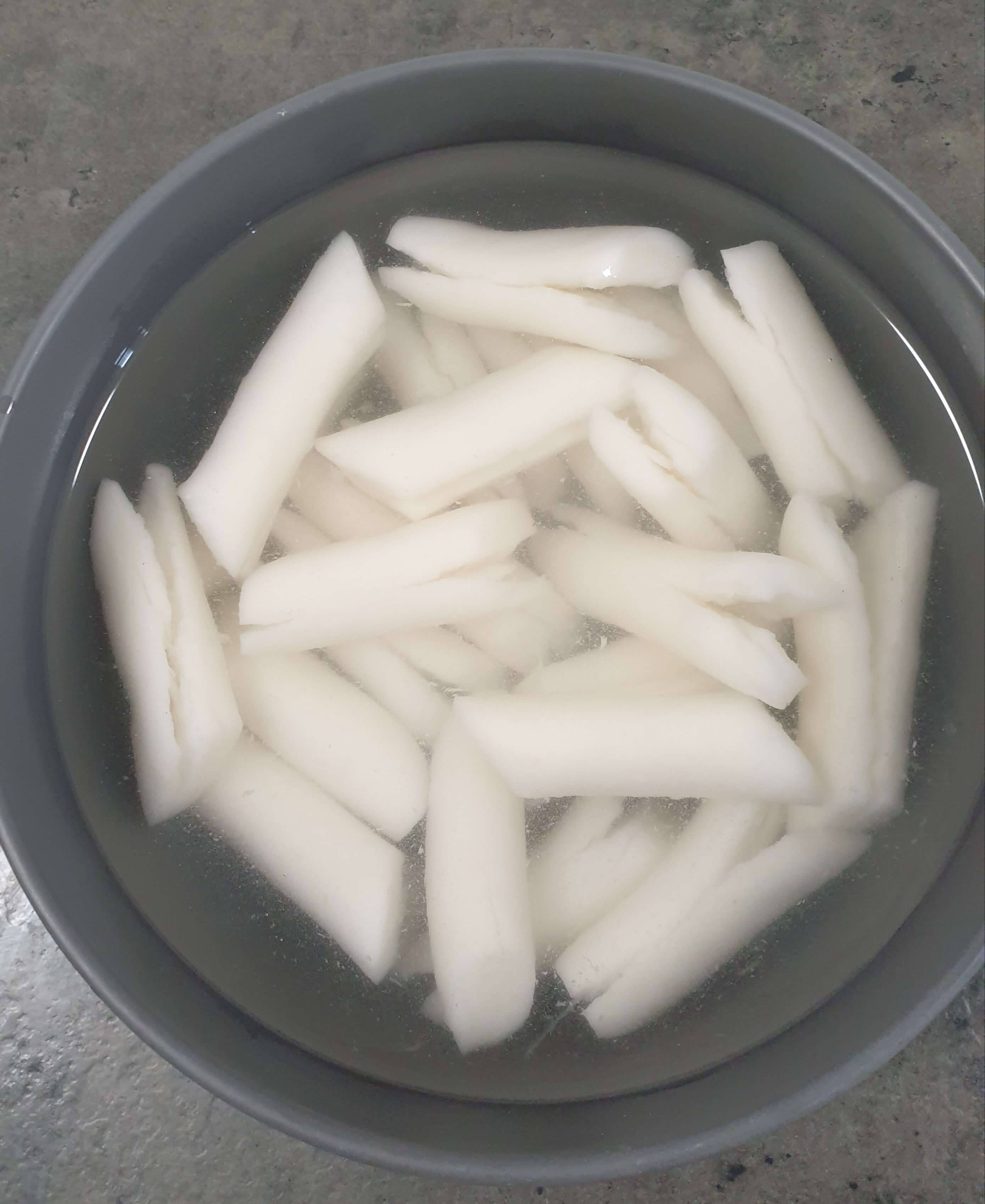 떡볶이 떡을 먹을 만큼 물에 담가 놓았어요.