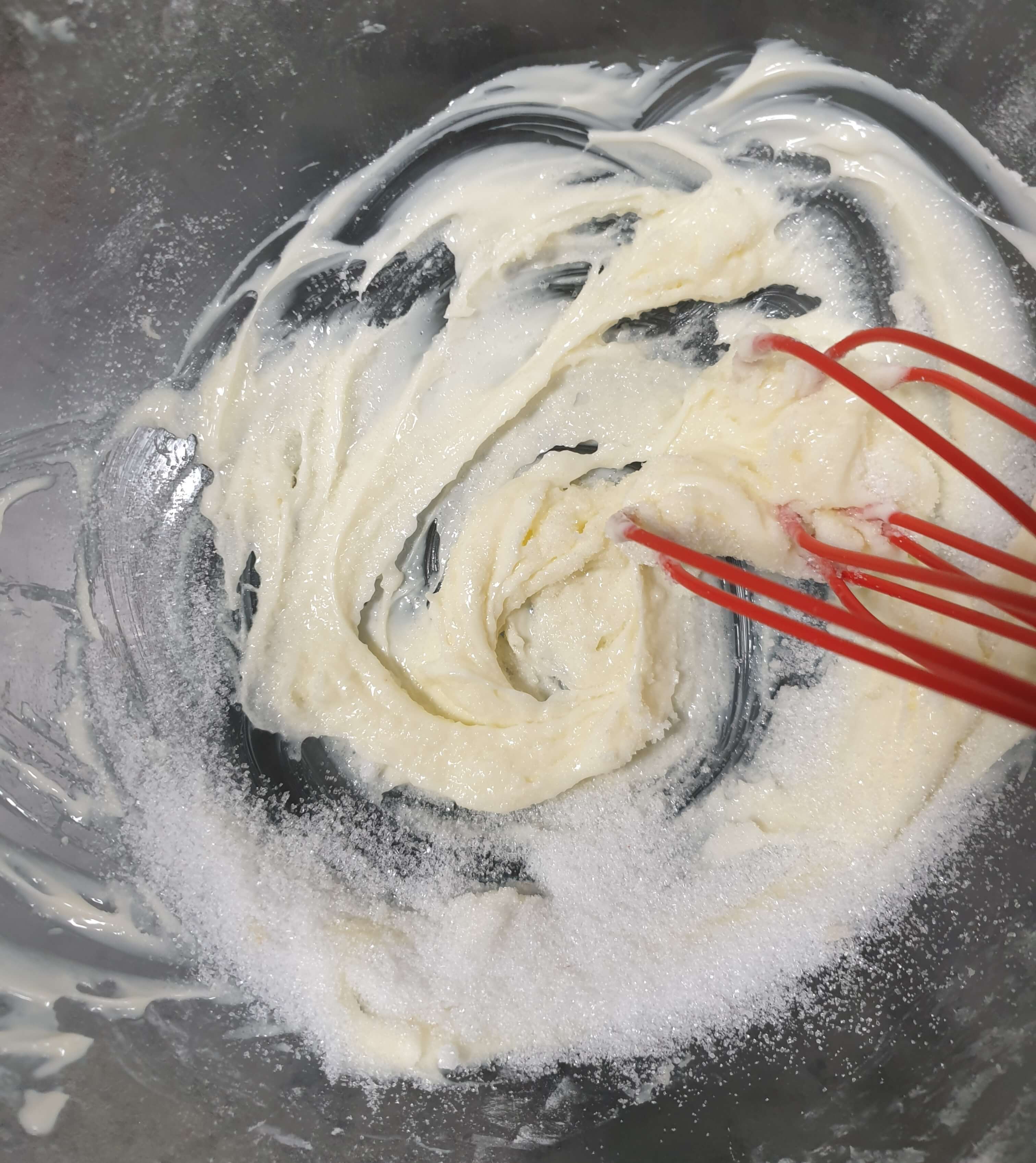 설탕 25g을 넣고 크림화 시켜 주세요.