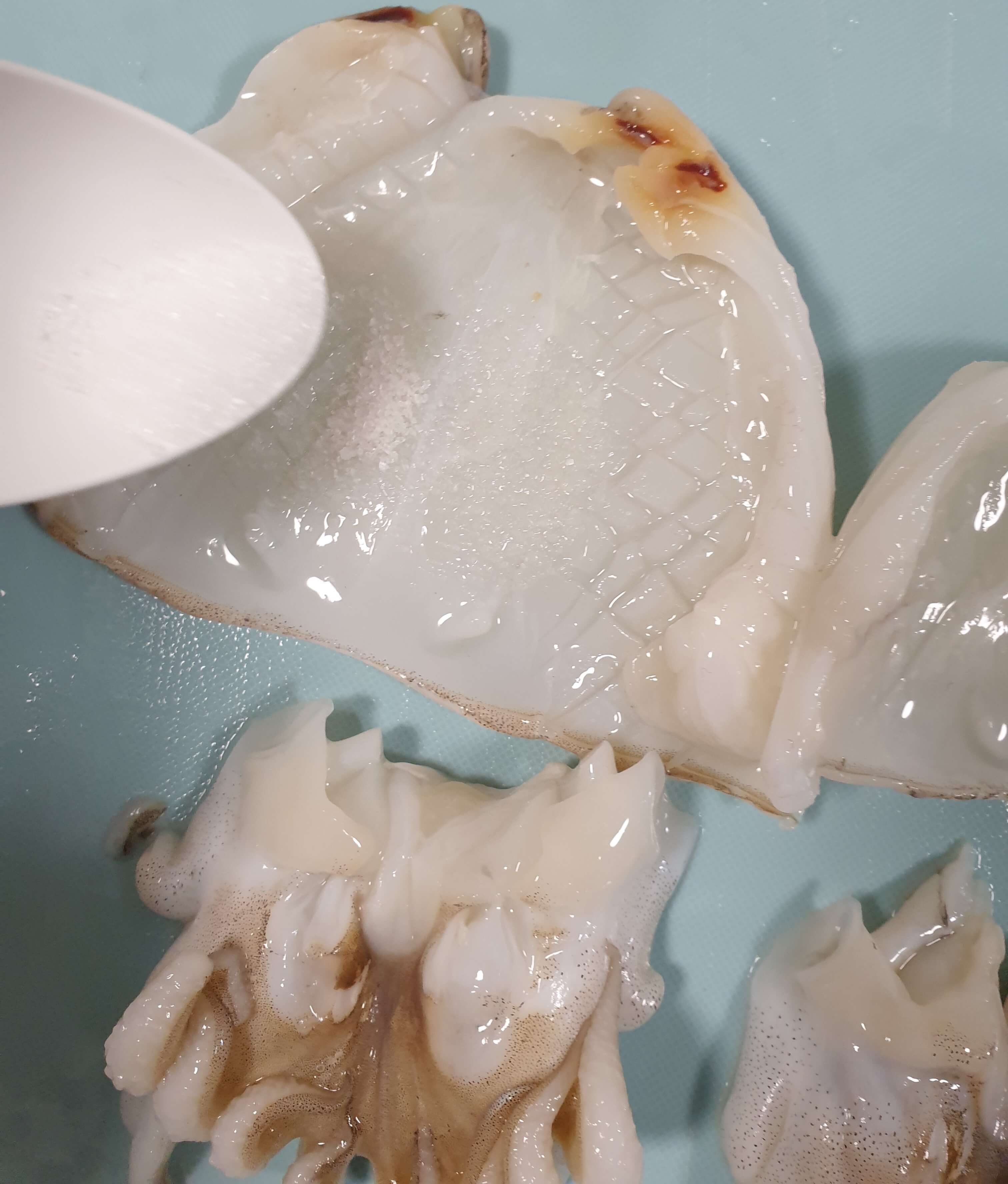 오징어를 먼저 깔끔하게 손질해 주세요.